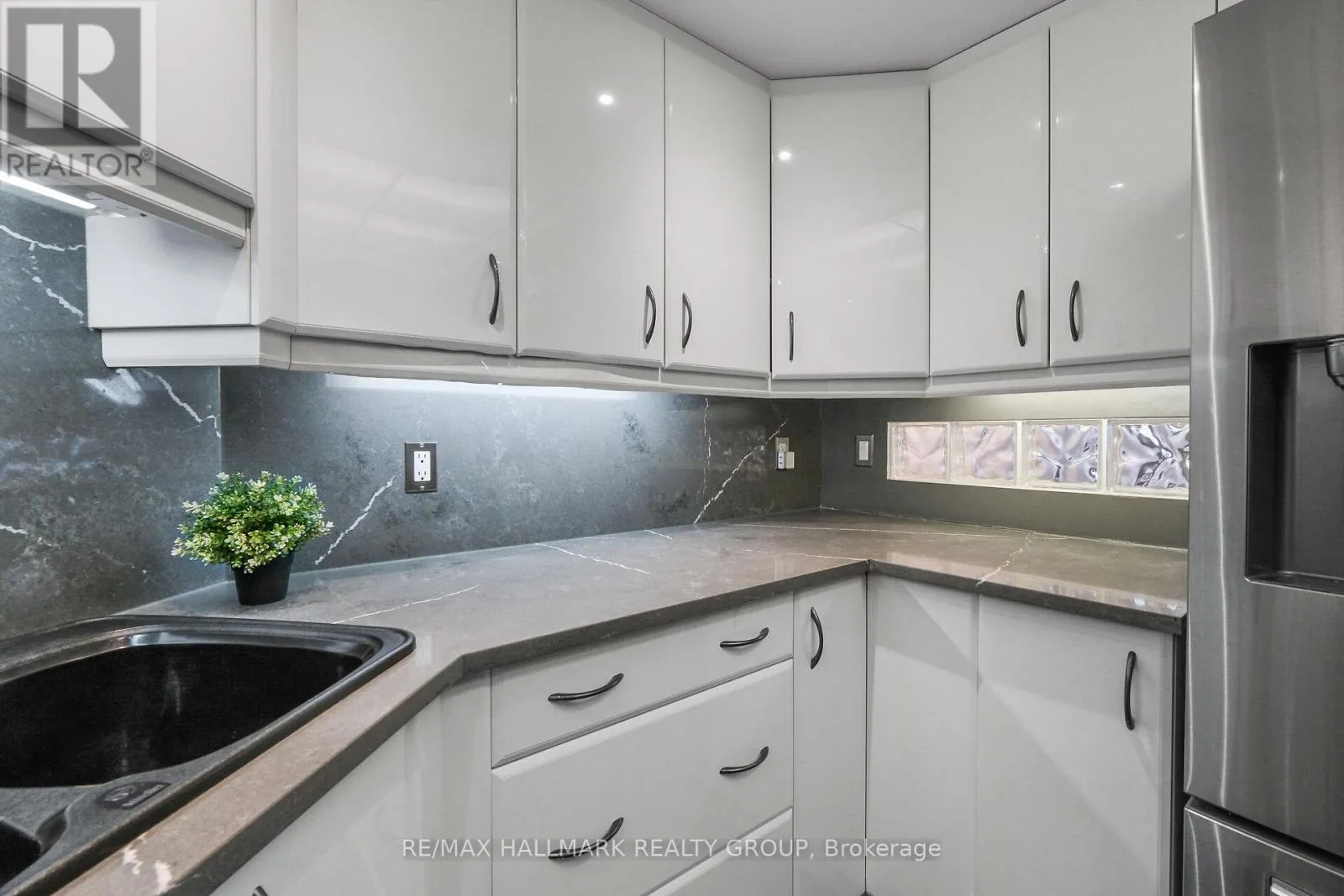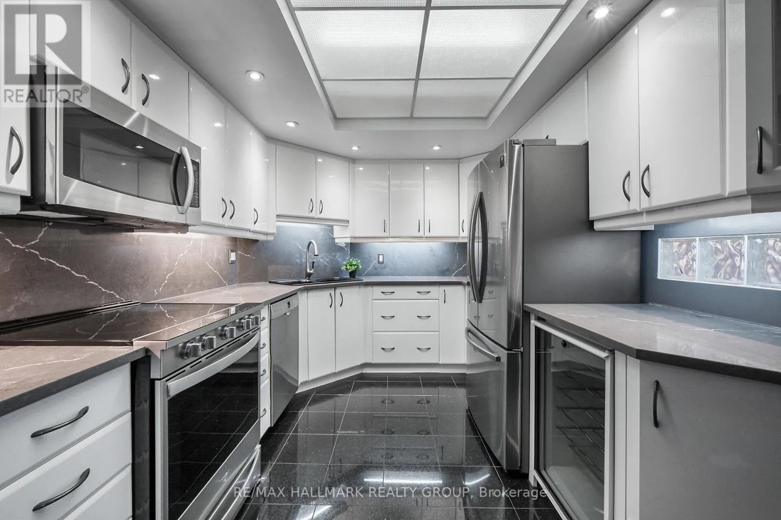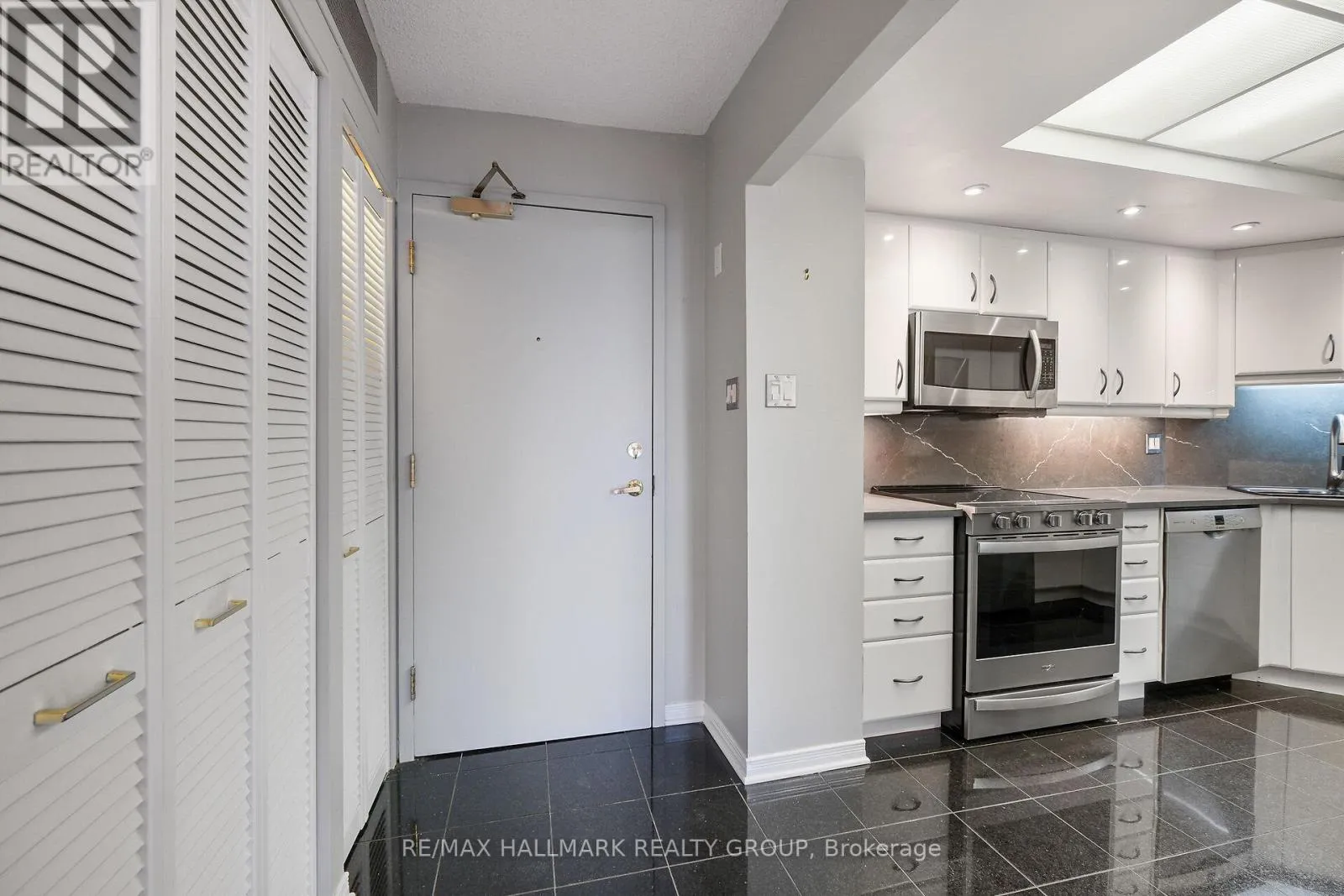 Refined urban living at the ‘St. George’.This well appointed suite features sleek black marble flooring throughout the foyer and bright kitchen which is paired with crisp white cabinetry, quartz counters enhanced with a sophisticated backsplash, glass block accents and top-tier appliances. Plenty of natural light creates an airy and spacious feel while the Brazillian Mahogany wood flooring adds durability and
