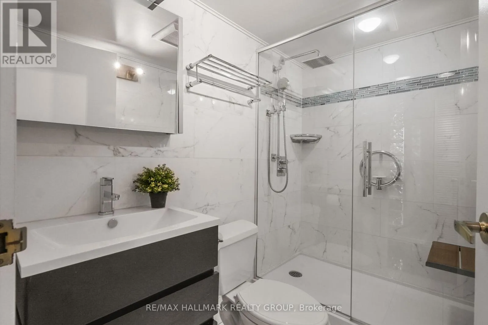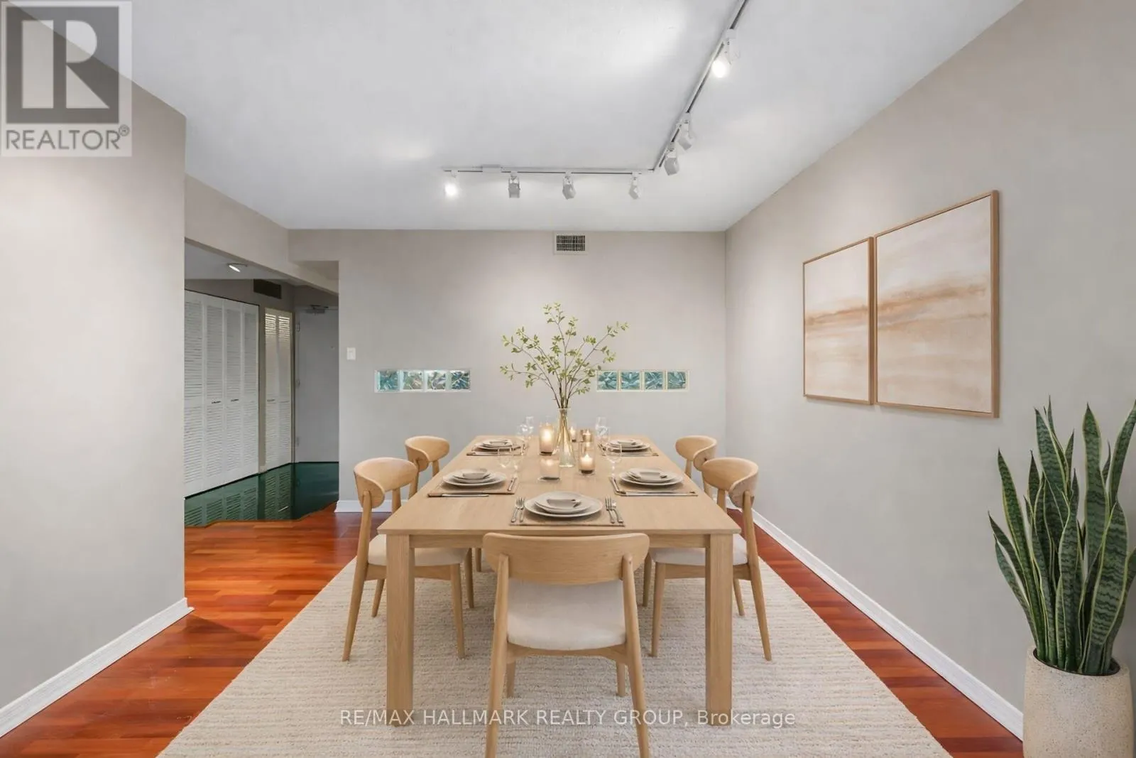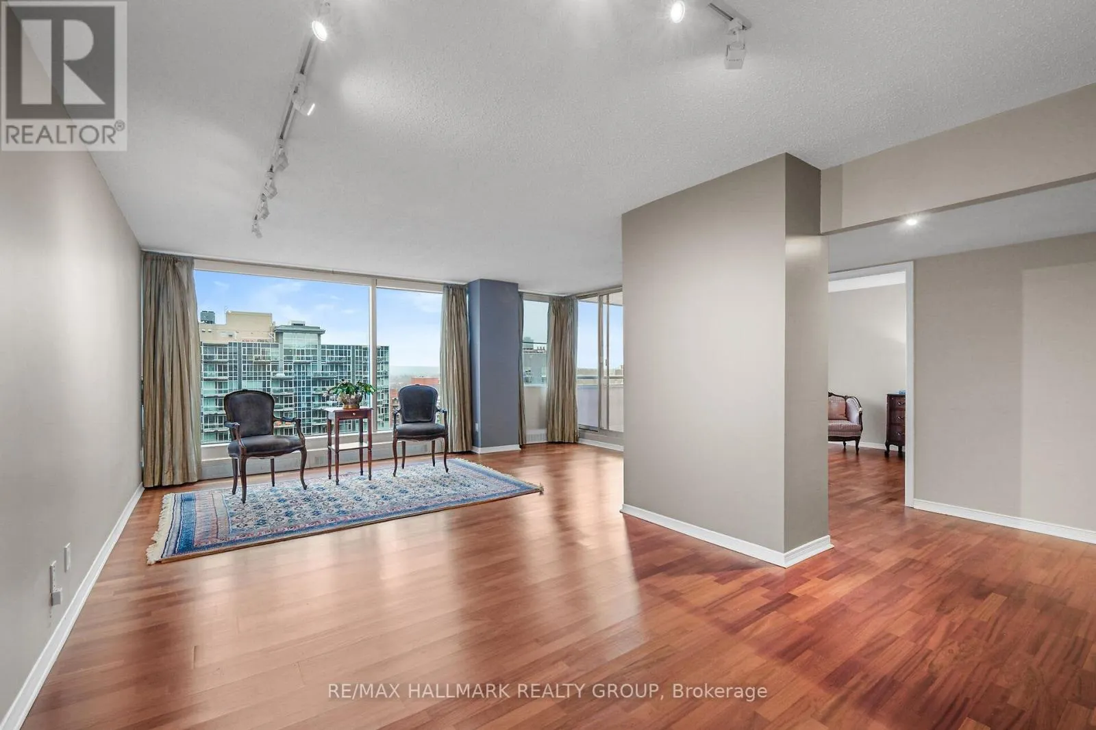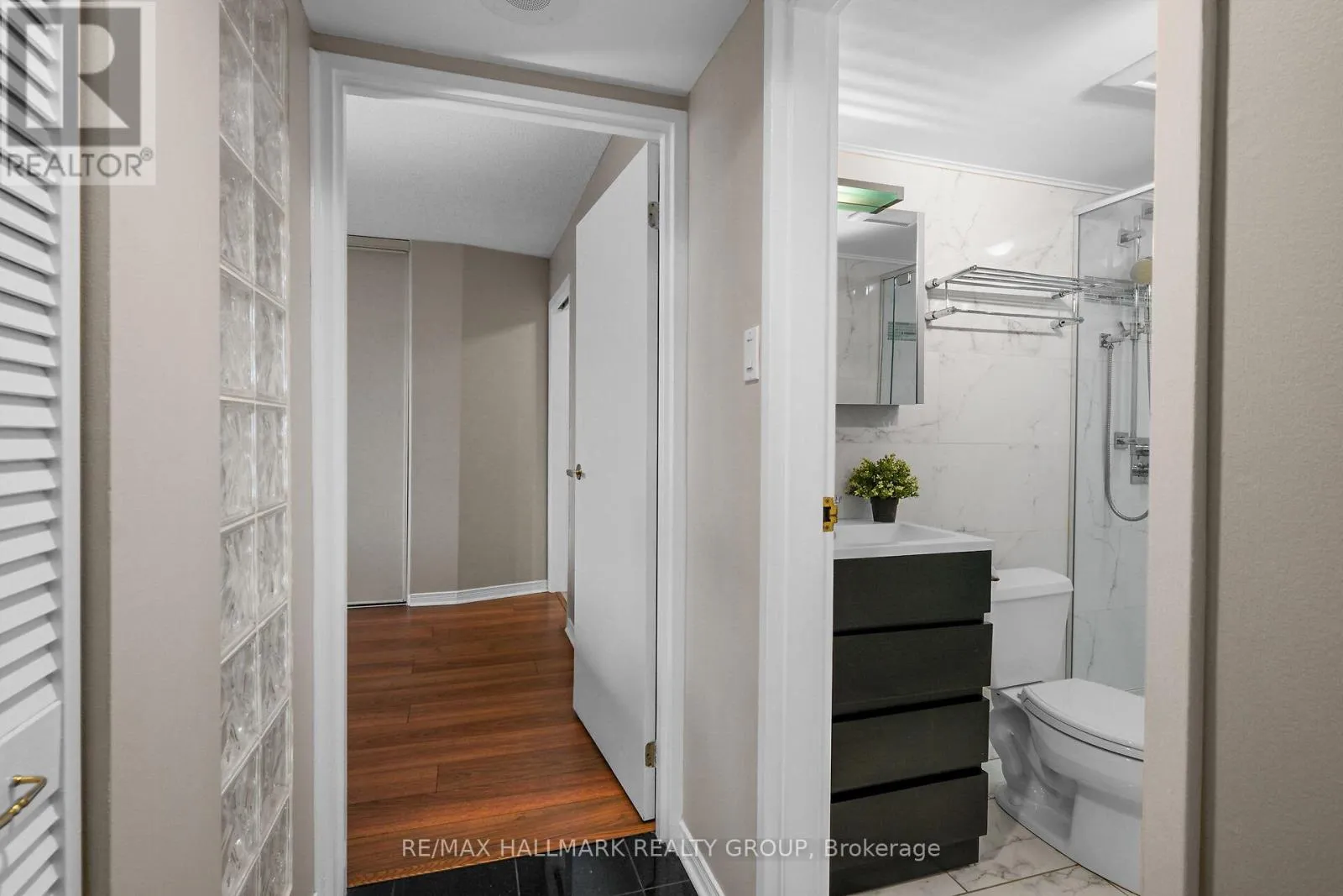 Refined urban living at the ‘St. George’.This well appointed suite features sleek black marble flooring throughout the foyer and bright kitchen which is paired with crisp white cabinetry, quartz counters enhanced with a sophisticated backsplash, glass block accents and top-tier appliances. Plenty of natural light creates an airy and spacious feel while the Brazillian Mahogany wood flooring adds durability and
