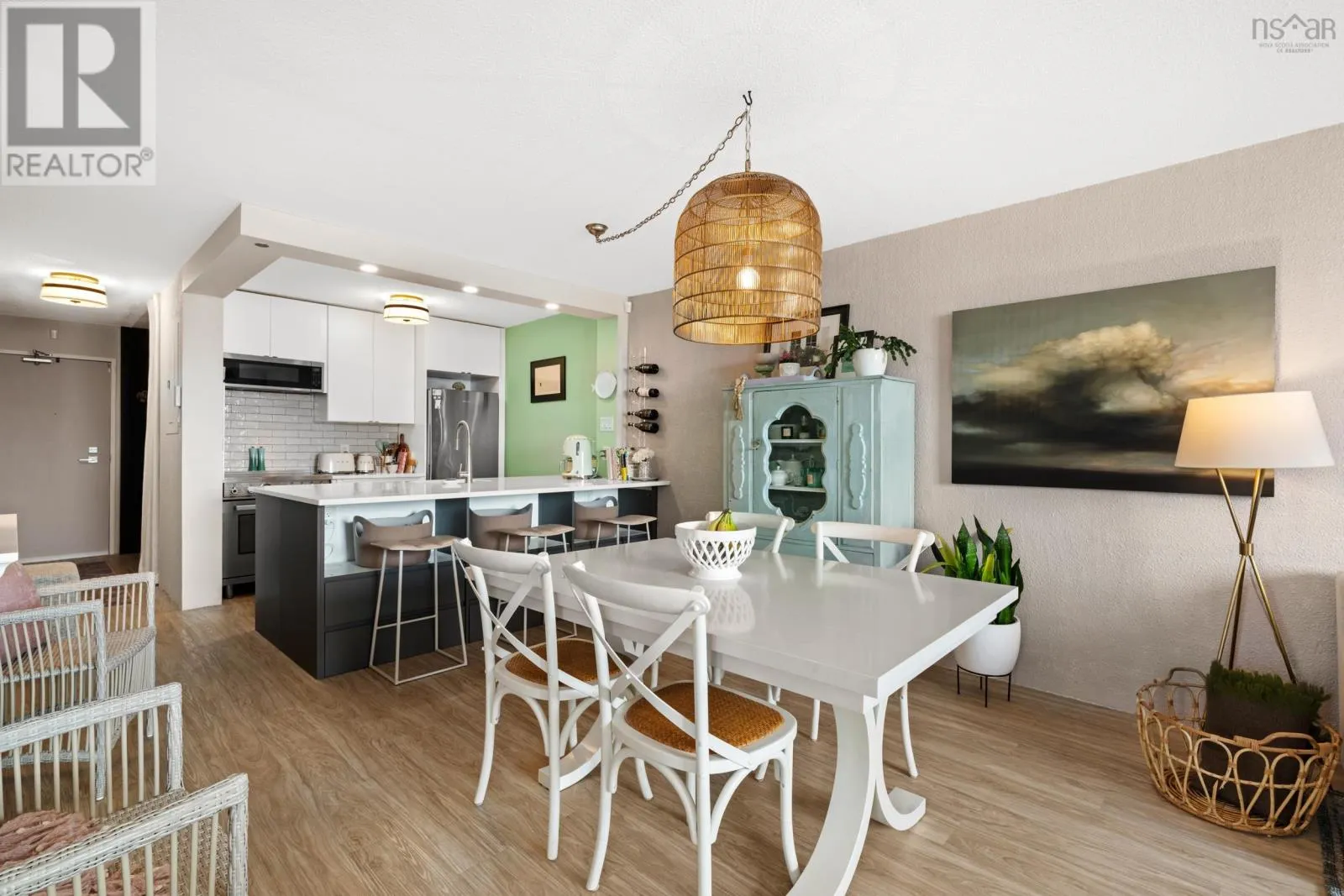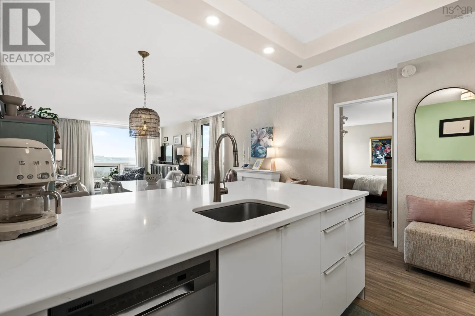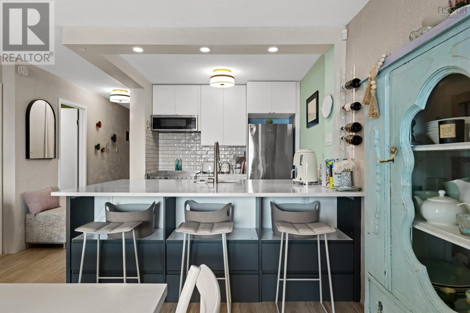 Fully reimagined with a designers eye, this one-bedroom Halifax condo stands apart from anything else nearby. Custom kitchen cabinetry, elevated lighting, curated wallpaper, and tailored drapery come together to create a space that feels straight out of a magazine. At 620 square feet, every inch has been intentionally designed; Bright, airy, and effortlessly calming, with a subtle coastal feel that