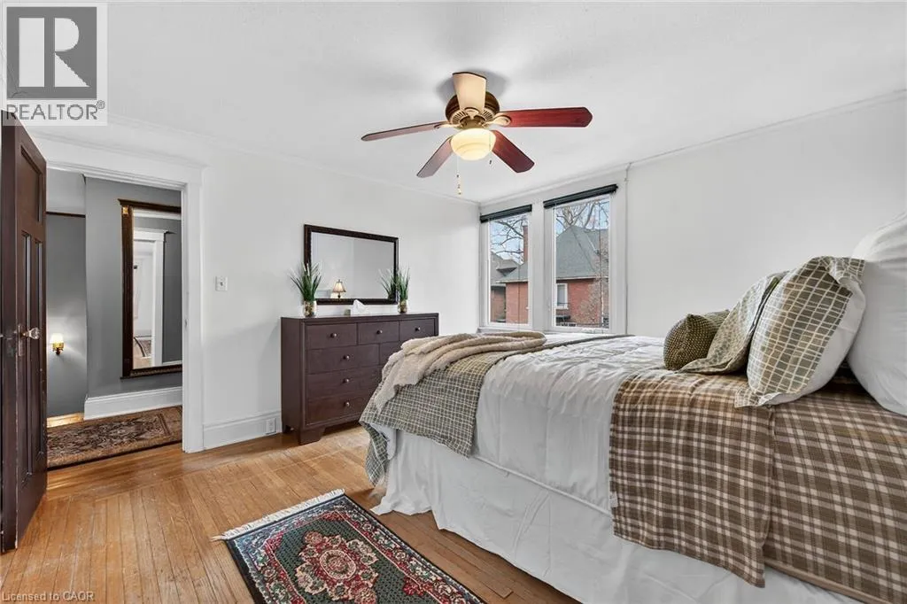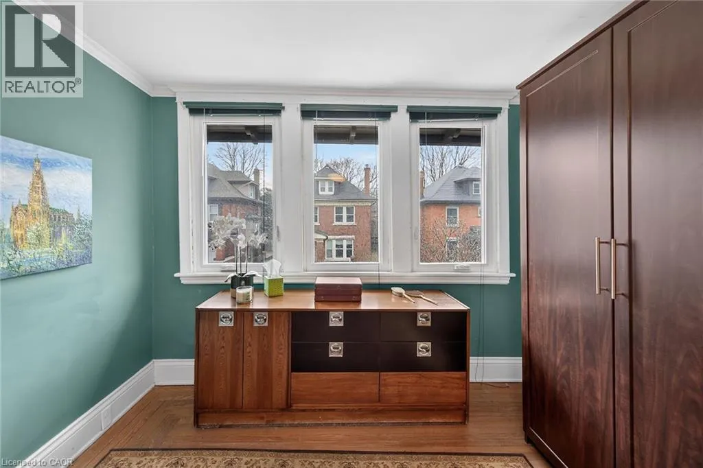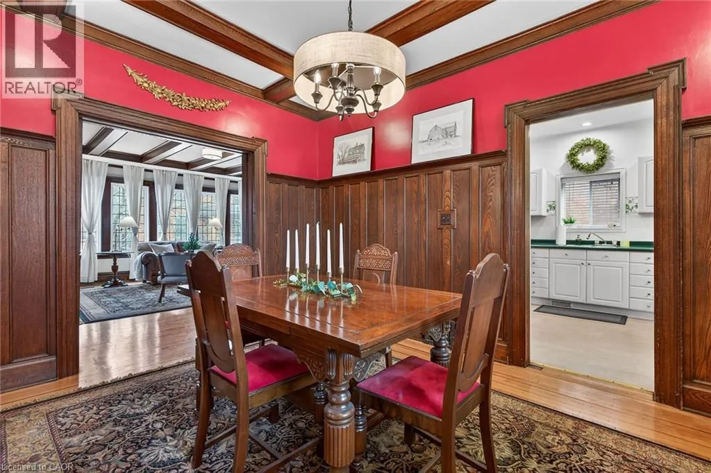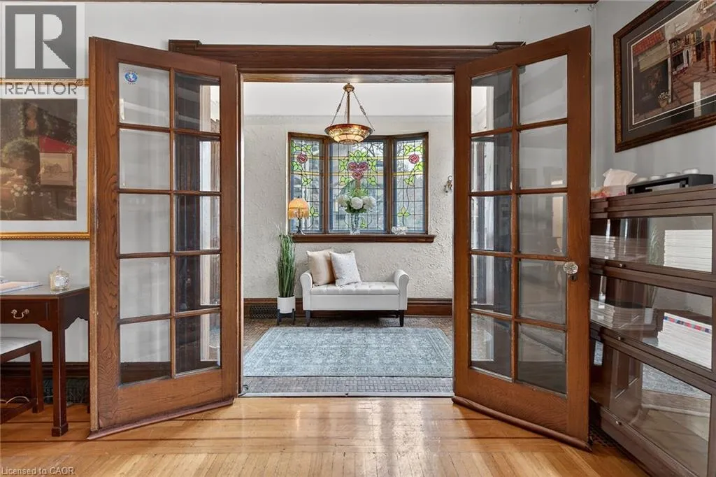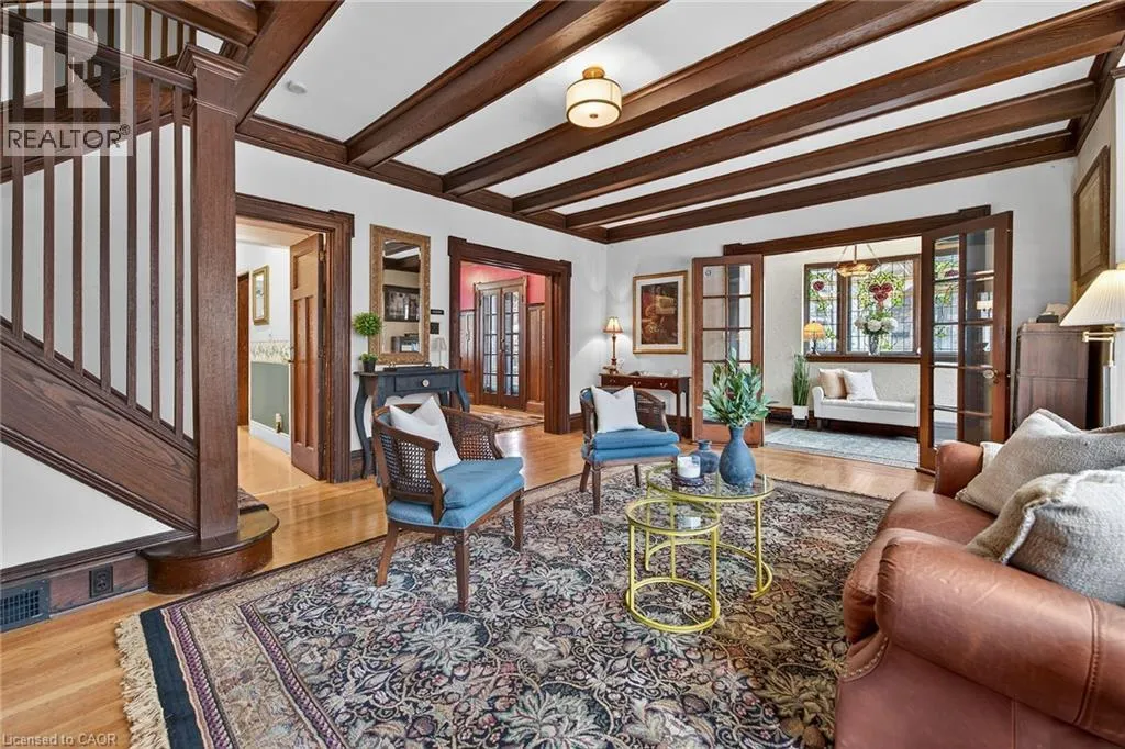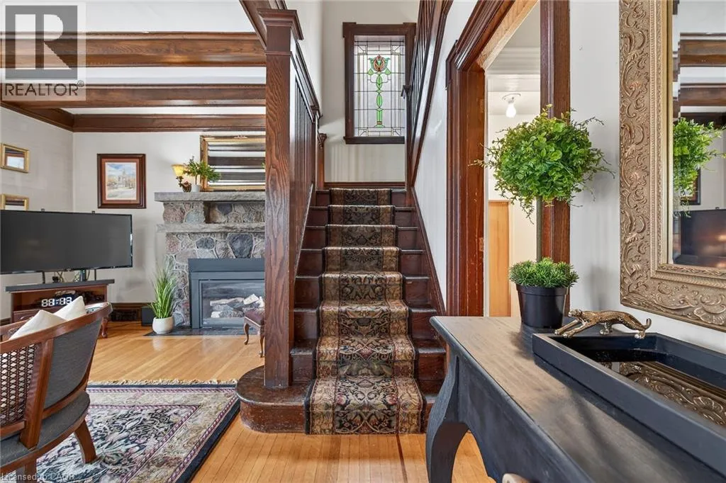 Old world charm & character 2 story 3 bedroom home in desired Hamilton central location. Unique Victorian foyer, warm and inviting huge living room with fireplace and beautiful beamed wood ceiling and dramatic staircase. Amazing formal dining room with character featuring detailed hardwood wainscoting with plate rails, beam wood ceiling, pocket doors, and french doors leading to a private cover