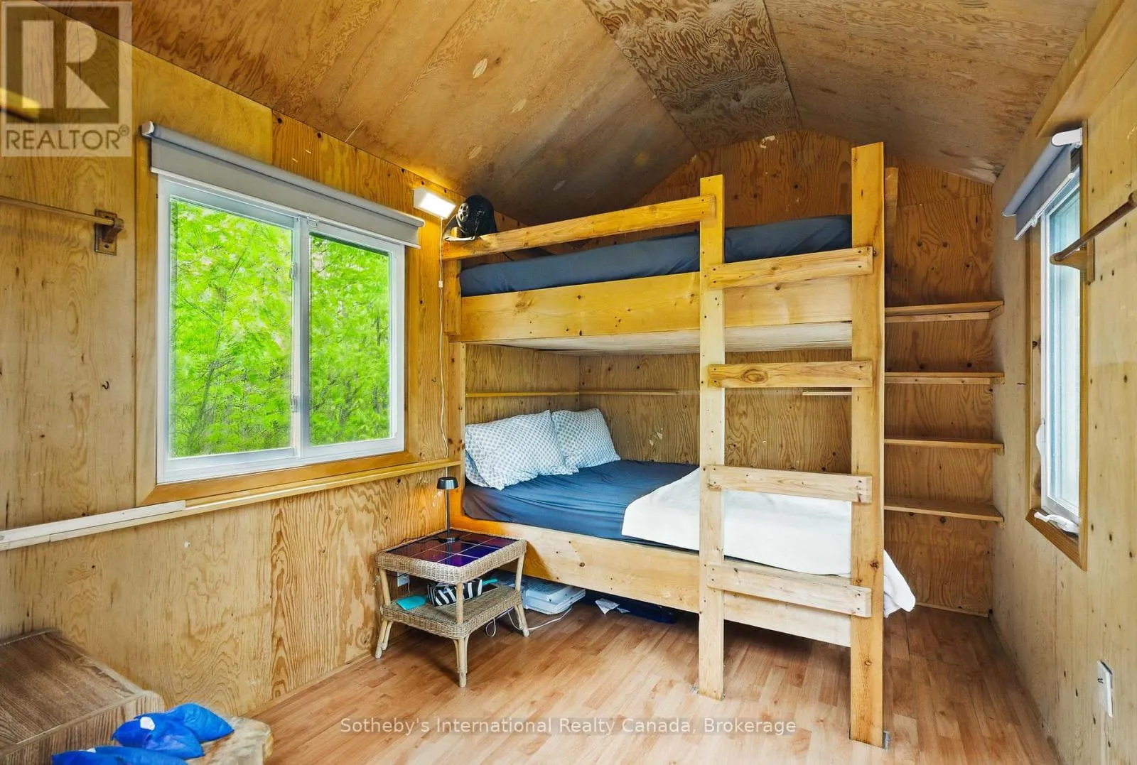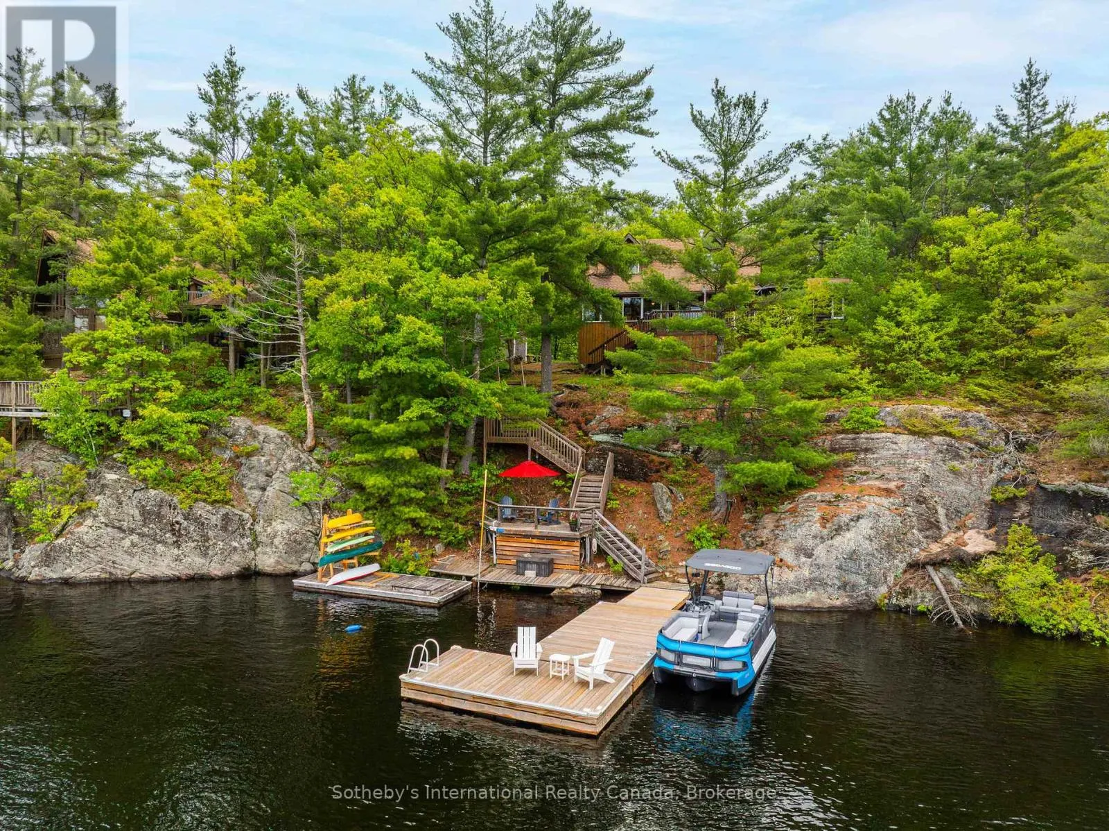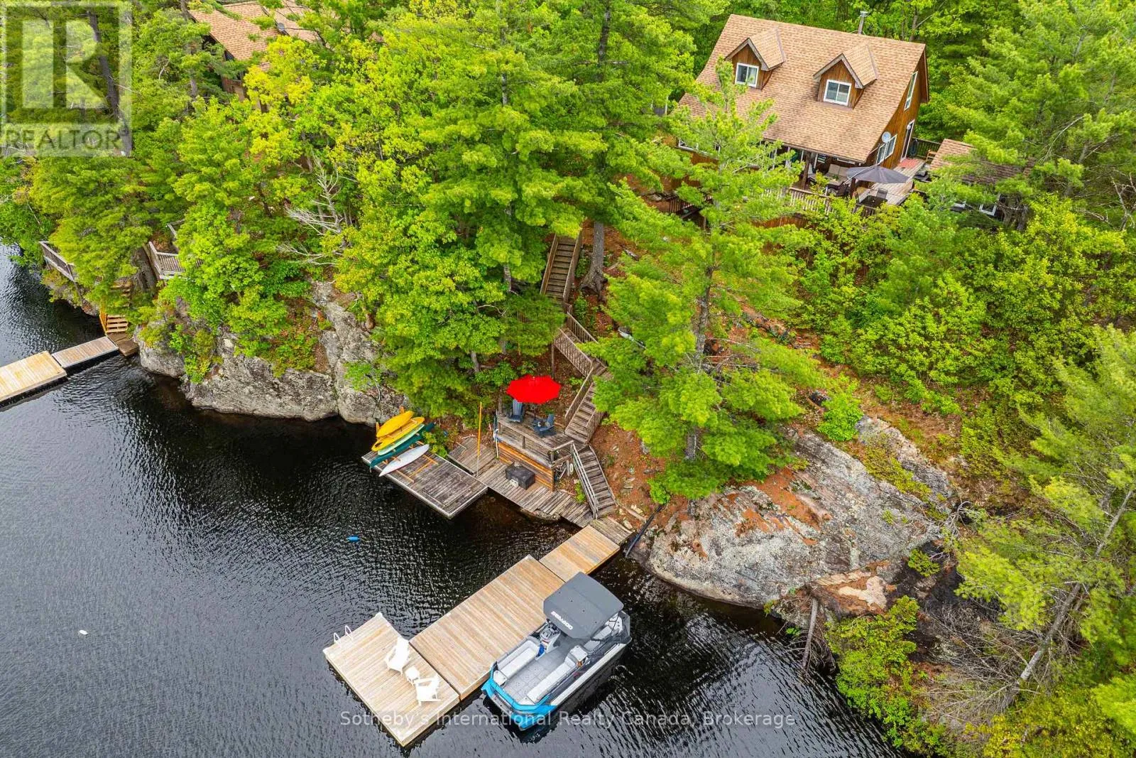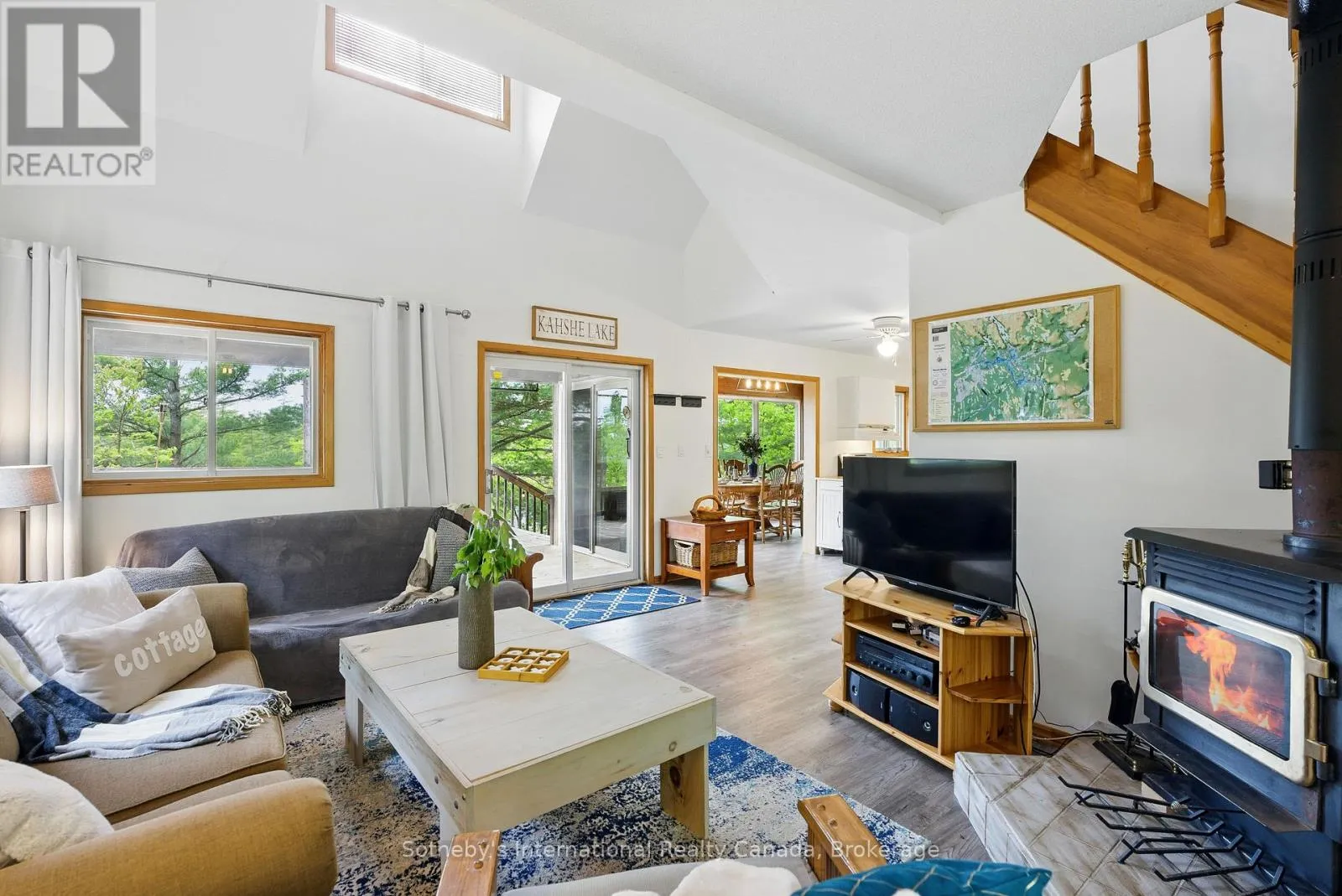 Boat Access Only | Beautifully updated 2-bed + loft, 2-bath cottage in peaceful Grants Bay on Kahshe Lake, just a 5-minute boat ride from the marina-with a Princecraft pontoon included! Set on a private half-acre lot with 110 ft of shoreline, the cottage blends charm and modern comfort. The open-concept living area features vaulted ceilings, a cozy woodstove, and large