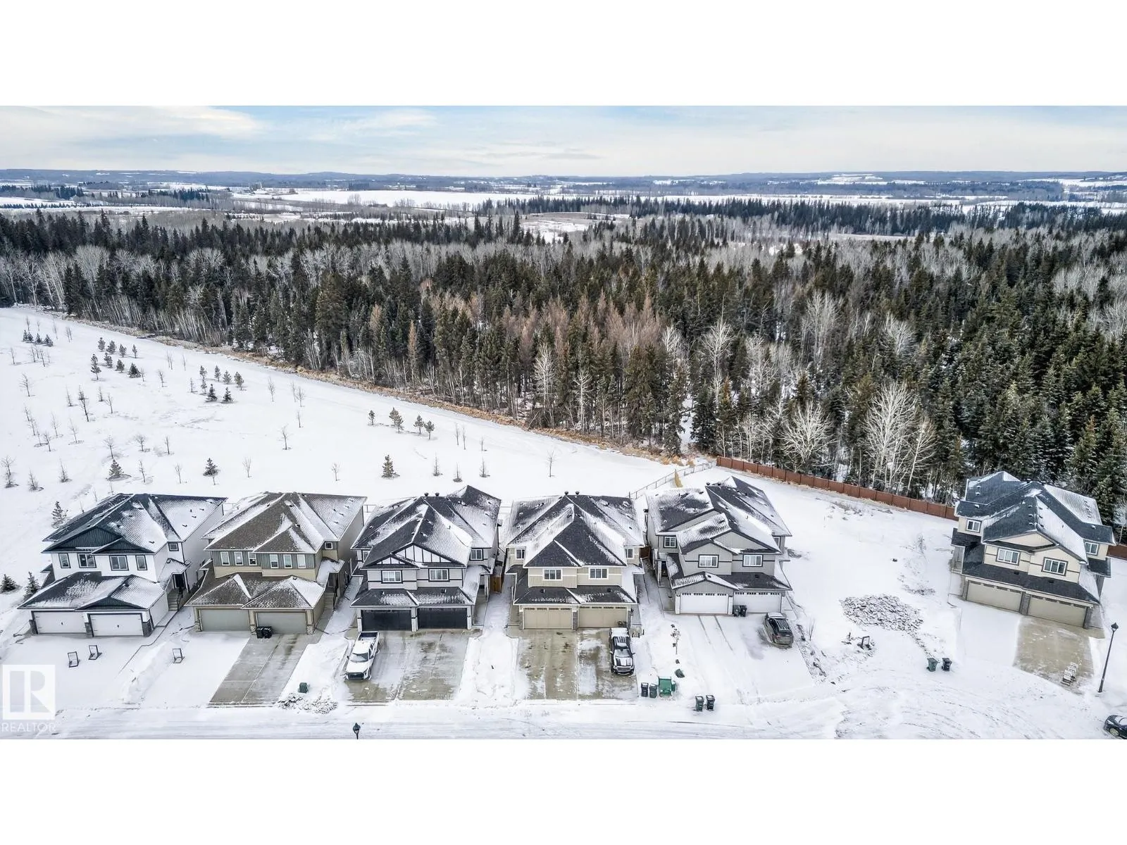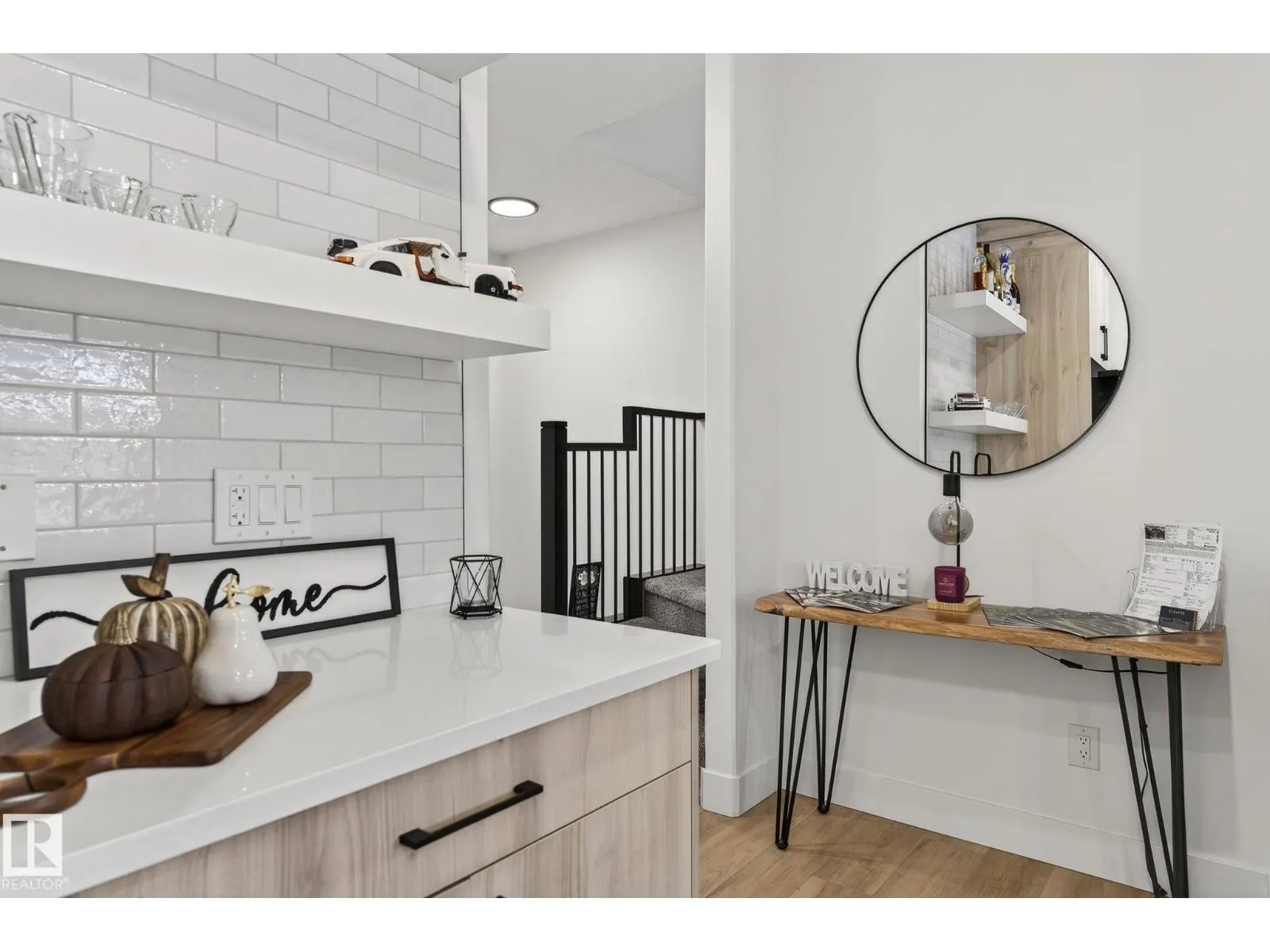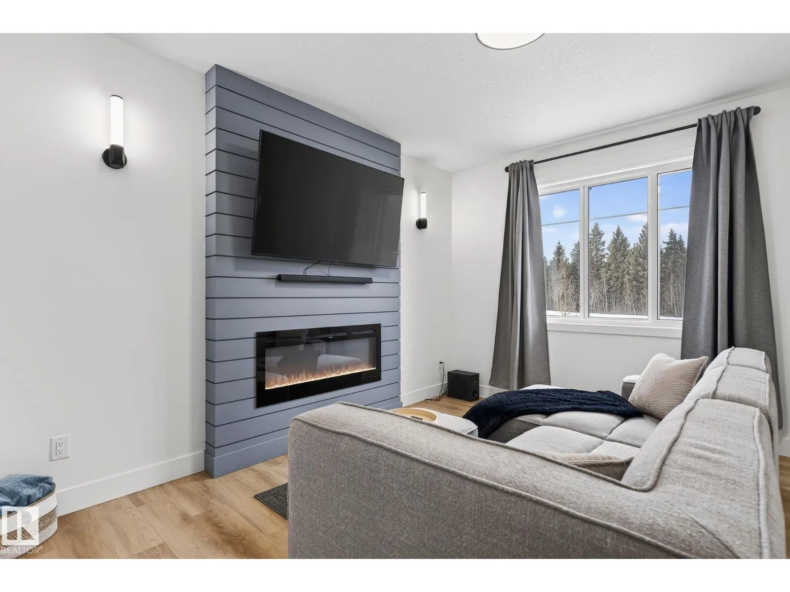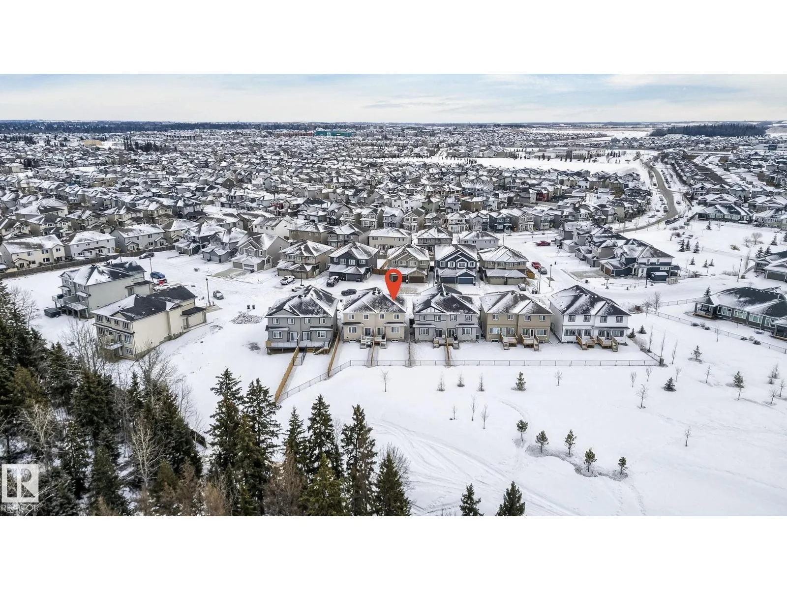Welcome to this beautiful half duplex in Harvest Ridge, perfectly positioned backing onto mature trees. The main floor is thoughtfully designed with a bright, open-concept filled with natural light, which makes an immediate impression with its modern floor-to-ceiling feature wall and sleek electric fireplace. The kitchen is beautifully appointed with quartz countertops, soft-close cabinetry, and a walk-through pantry. Upstairs, a