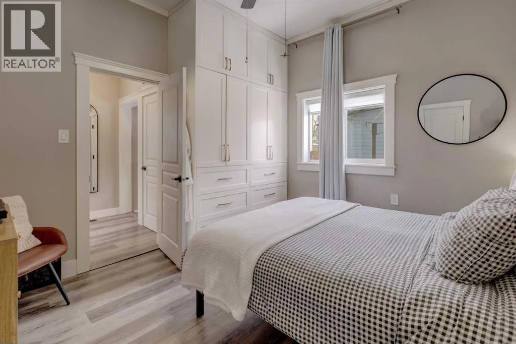 steel appliance package that includes a stunning gas range. Subway tile accents the space, complemented by a convenient pantry and dedicated microwave/appliance coffee station for added organization and enjoyment. Easy-care vinyl plank flooring, updated paint, and trim further brighten the open plan, making every square foot count. The living/dining area features a built-in library, wainscoting, and a coffered ceiling—details reminiscent of days gone by that contribute to the home’s enduring charm. Natural light streams through updated windows, highlighting the high ceilings. Modern touches such as pot lights and ceiling fans have been added for comfort and ambience. The primary bedroom includes a cheater door to an exquisitely renovated bathroom showcasing beautiful tile flooring, a refinished clawfoot tub, tiled shower, and a custom vanity with quartz countertop. The second bedroom, currently serving as an office, offers a custom closet with a barn door closure. The porch has been updated with electric heat, lighting, and outlets, making it a flexible space to personalize according to your lifestyle. Additional upgrades include a 60-gallon hot water tank, Lennox high-efficiency furnace, updated shingles, and eavestroughs, providing peace of mind. In 2023, an oversized, fully insulated, heated, and fully finished double detached garage (22’ 2” x 23’3”) was constructed with all required permits. The garage features 100-amp service, is pre-wired and plumbed for a gas heater, and offers extra electric outlets—including a switched plug facing th e street for block heaters or chargers. This space is ideal for car enthusiasts, adding unexpected value and convenience. The home is situated on a picturesque, tree-lined street in one of Calgary’s oldest and most iconic communities, known for its walkability and bike-friendliness. Whether you enjoy walks along the River, peaceful moments at the Inglewood Bird Sanctuary, or the vibrant atmosphere of local shops and restaurants, you will find it nearby. For those who desire the excitement of downtown living without the constraints of apartment life, this home is an ideal choice. This substantially updated home, rich in character and modern amenities, offers a rare opportunity in a sought-after Calgary neighborhood. Book your private viewing with your favorite agent and discover the unique charm and value of this special property. (id:62650)
