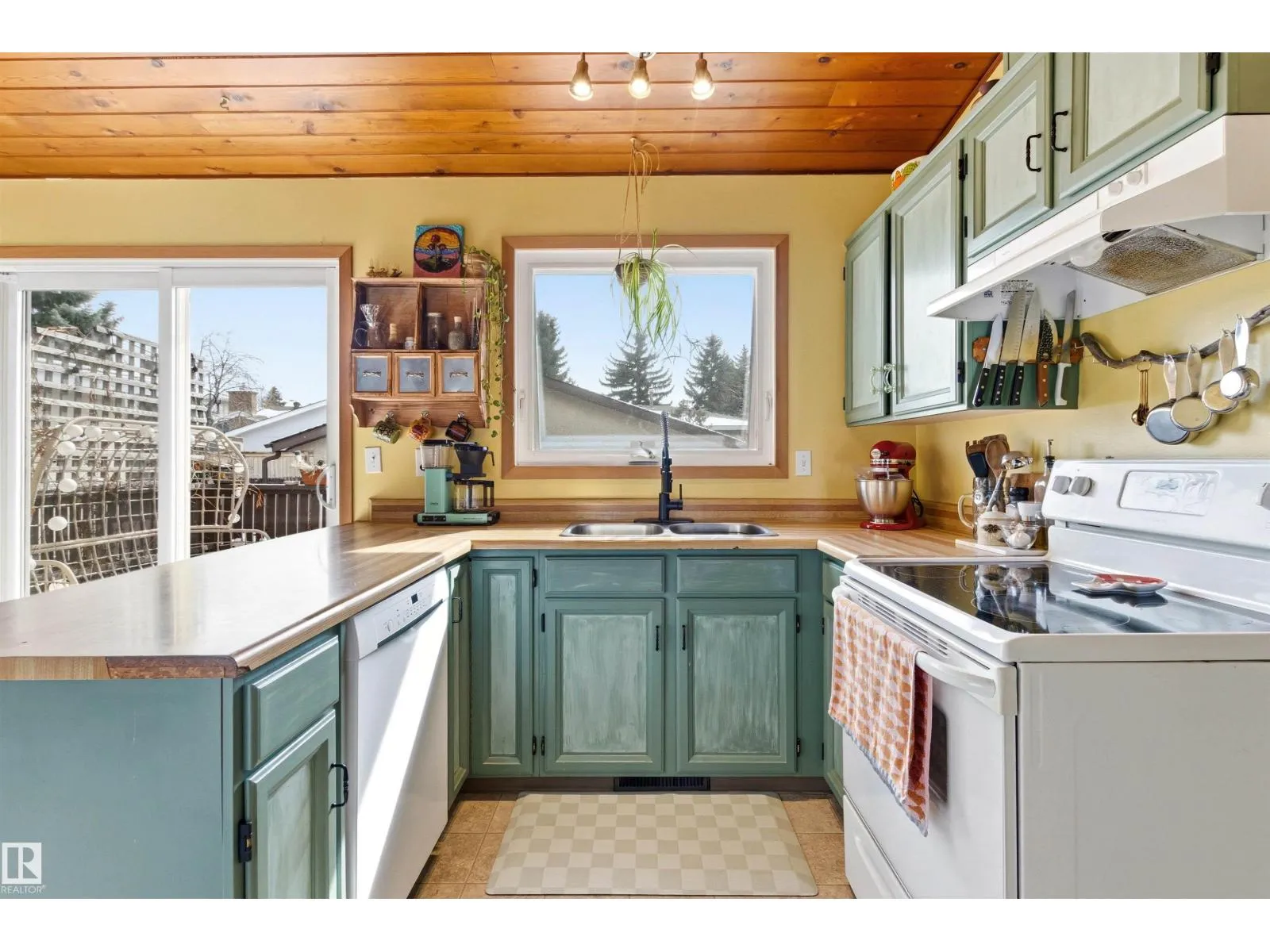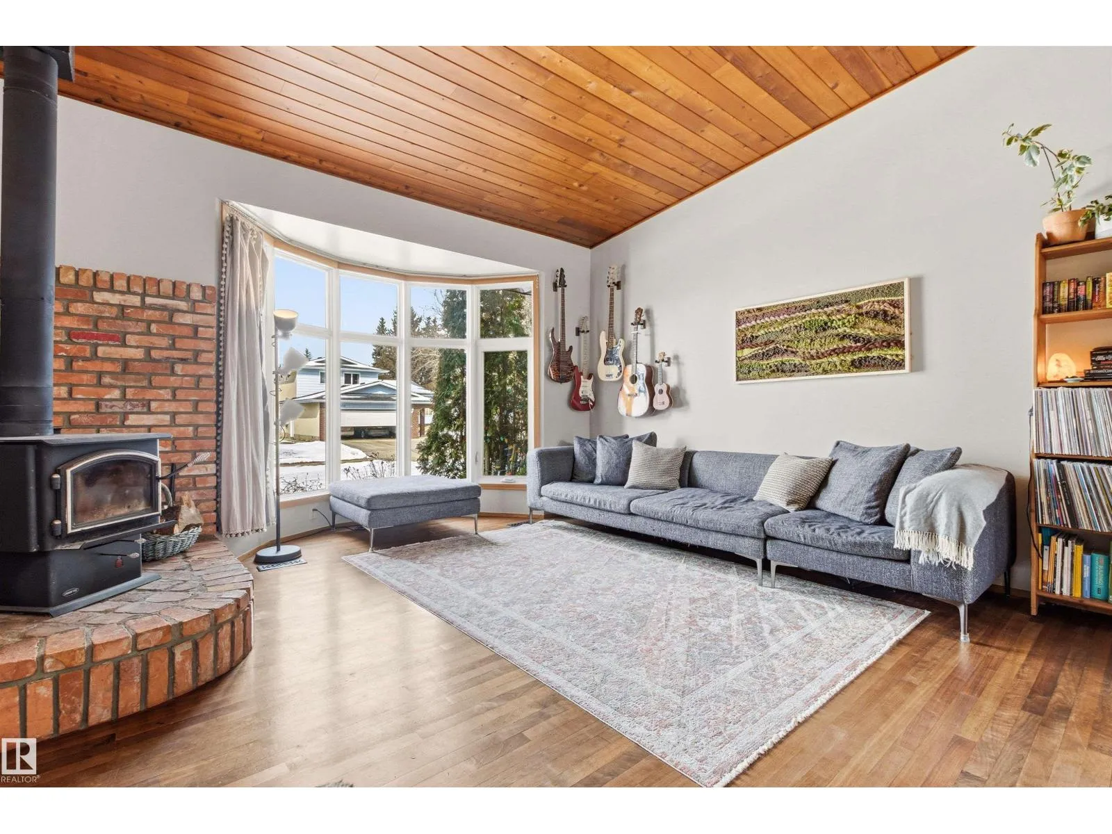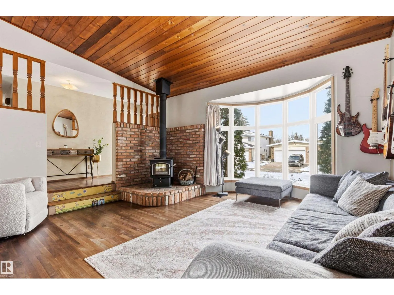 Located in the established community of Ormsby Place, this well-appointed bungalow offers over 2,180 sq ft of total living space w/ a pleasant blend of character & thoughtful updates. The main living area is defined by vaulted cedar plank ceilings, hardwood flooring, & a curved bay window that fills the space w/ natural light, complemented by a freestanding wood-burning fireplace
