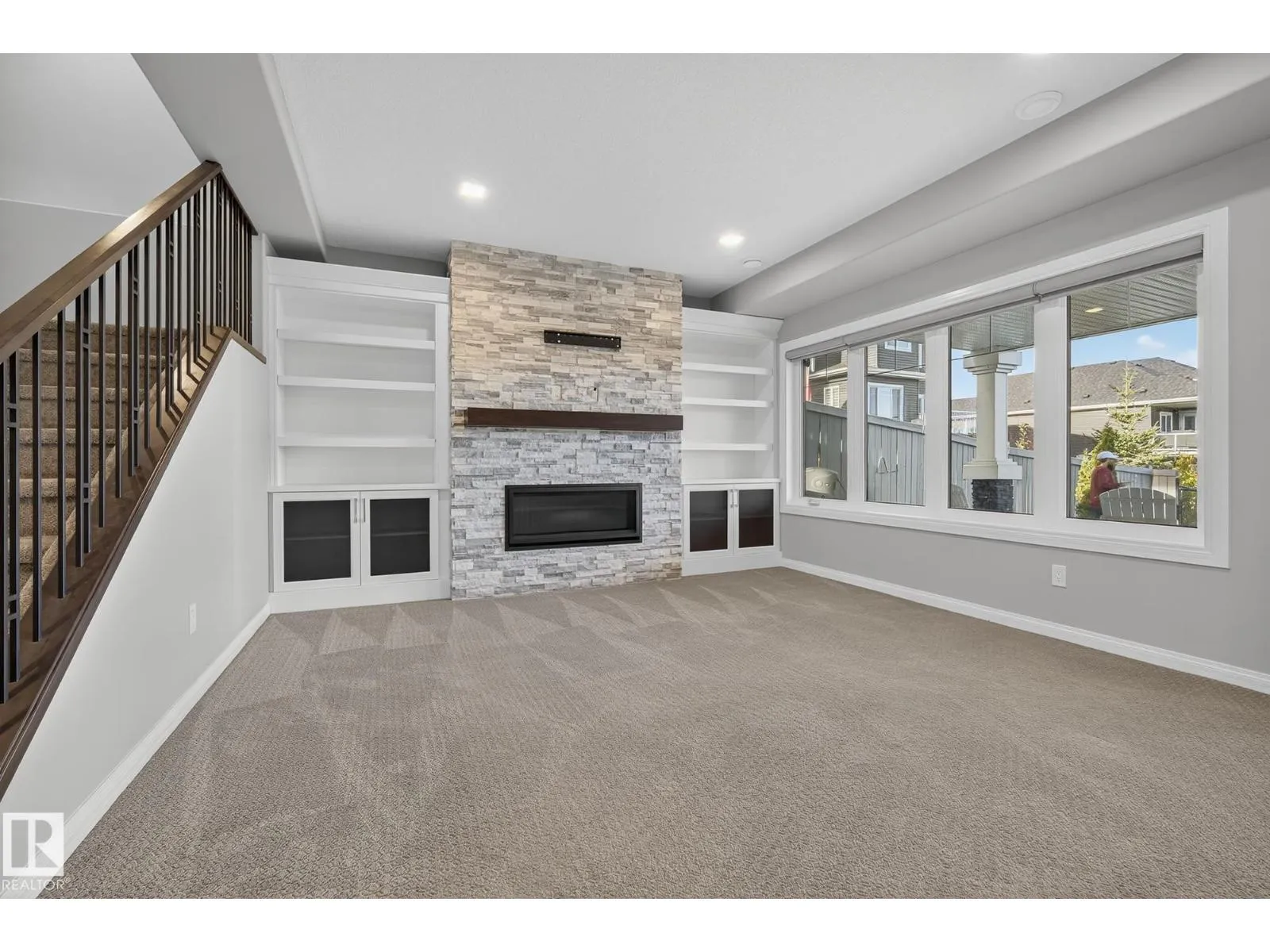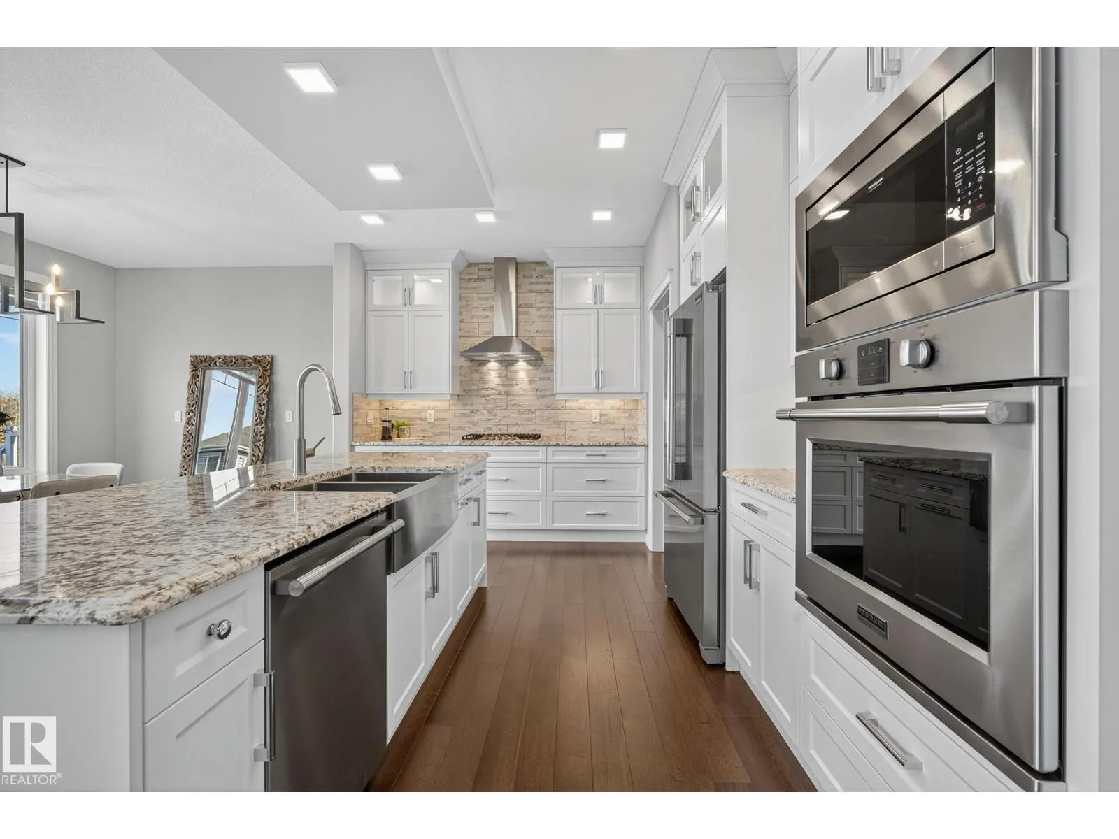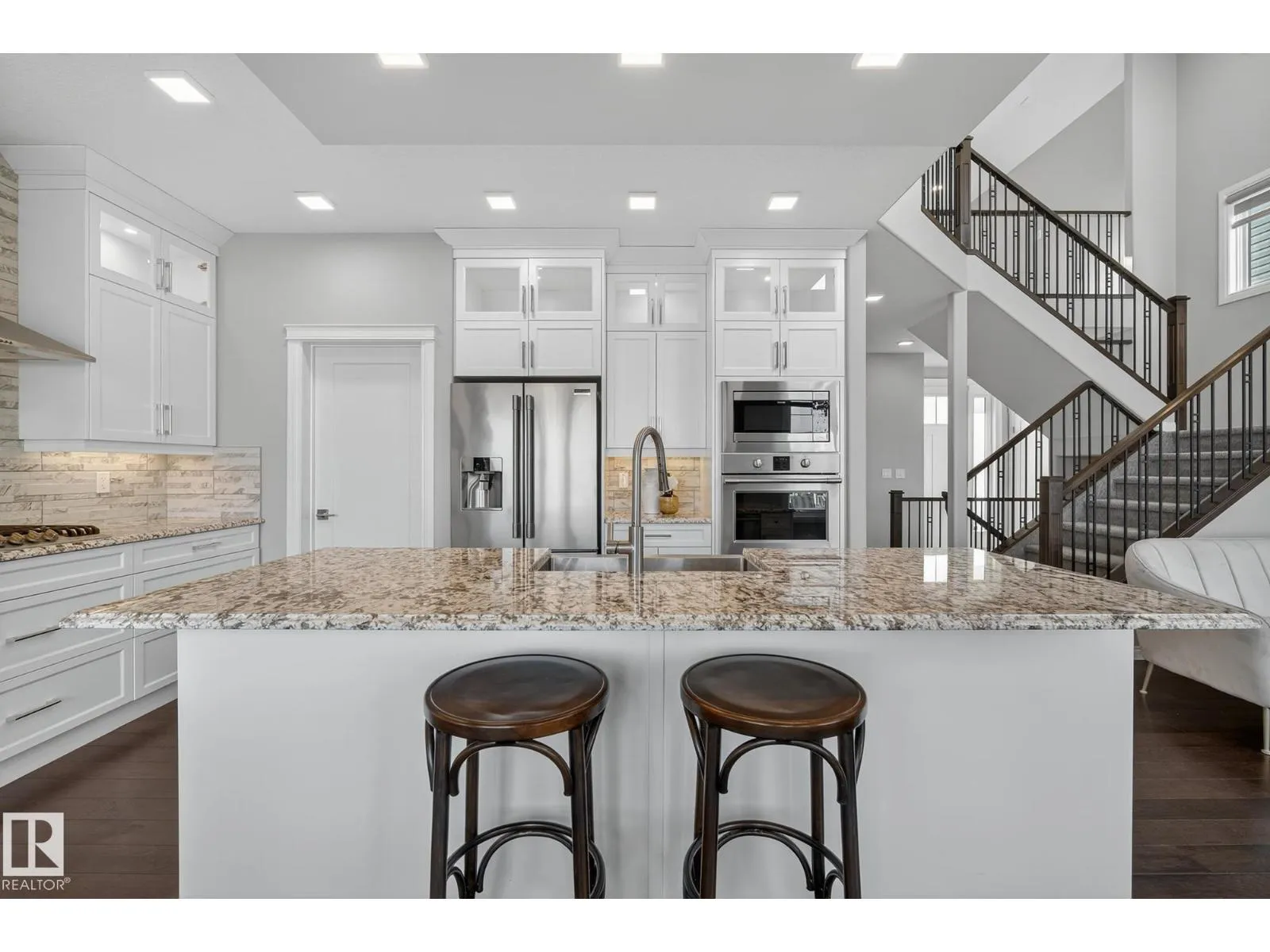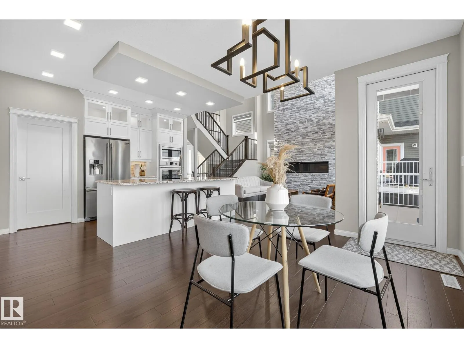 Turnkey and impeccably maintained, this custom-built walkout two-storey offers refined living BACKING DIRECTLY ONTO THE POND in the heart of Starling. Soaring 18-ft ceilings and a dramatic open-to-above great room are framed by a 4-panel window wall, flooding the home with natural light and capturing uninterrupted water views. The kitchen is elegantly appointed with European-style cabinetry, Frigidaire Professional appliances, gas