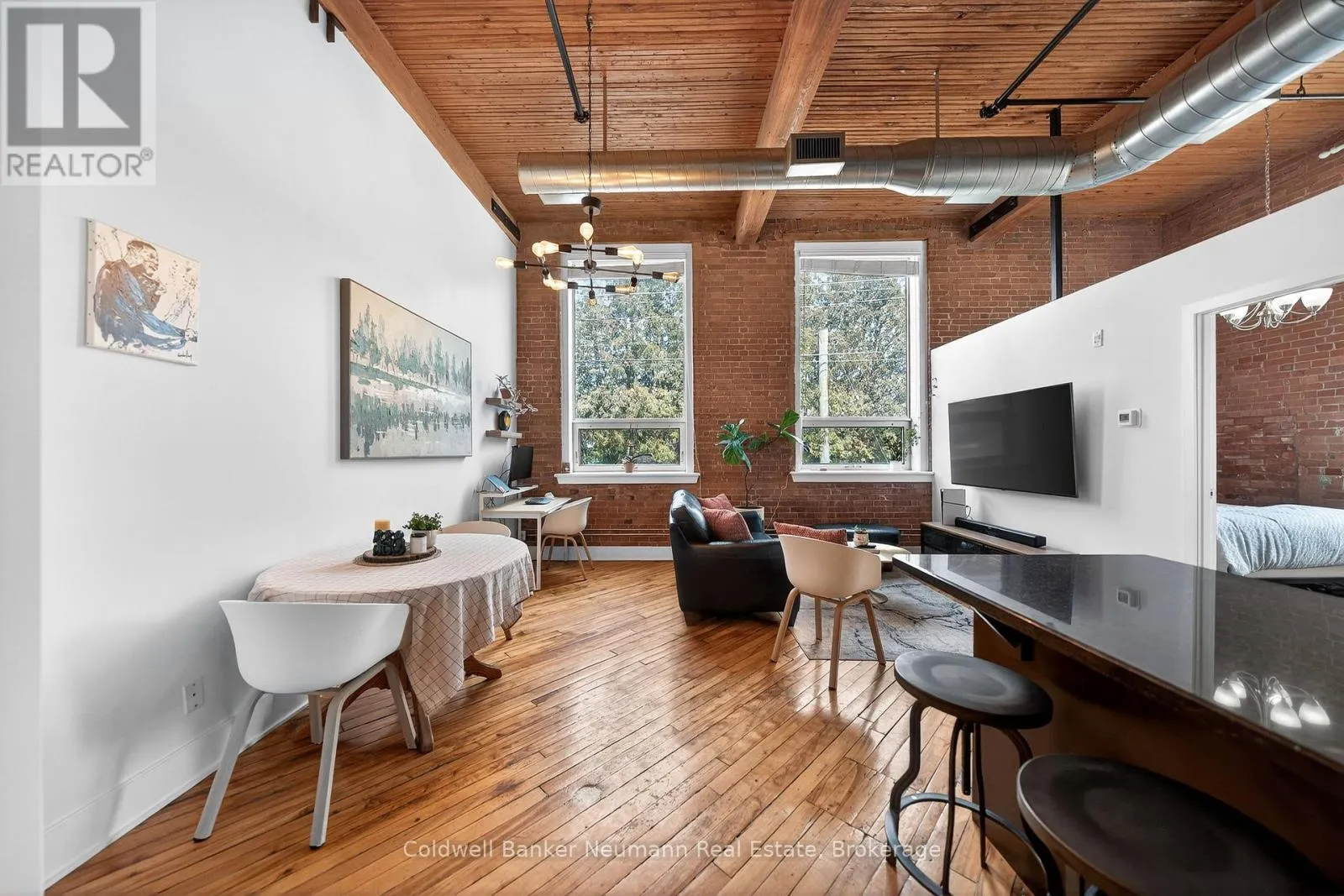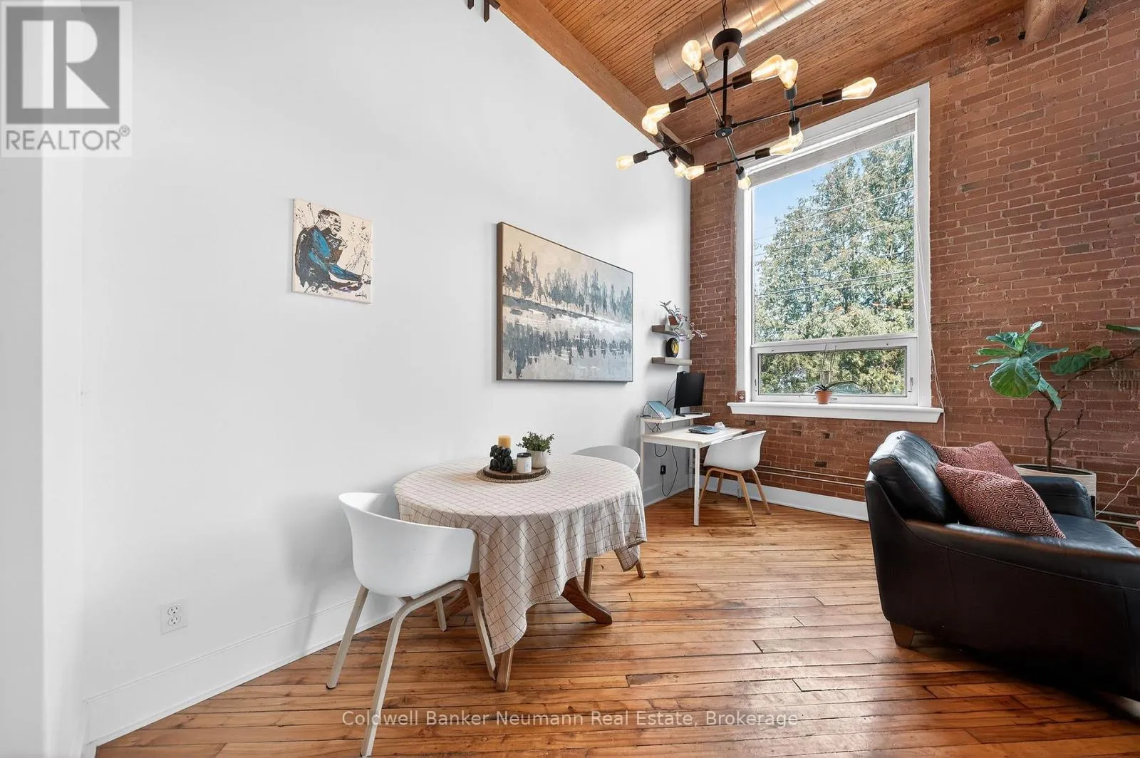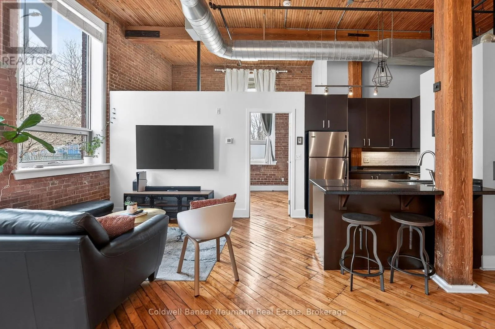 Authentic loft living in the heart of Guelph. Located in the highly desirable Mill Lofts, this corner unit is a one-bedroom, one-bathroom. it showcases the timeless appeal of true industrial design paired with thoughtful modern updates.Rich exposed brick walls set the tone throughout the space, adding warmth, texture, and undeniable character you simply won’t find in newer builds. The open-concept