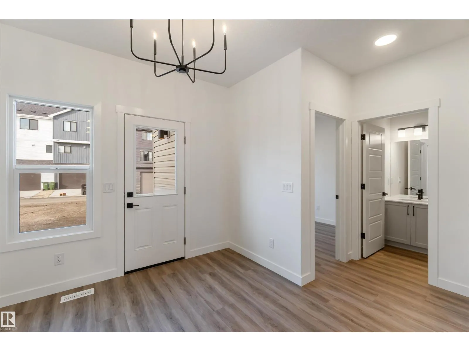 Built by Sterling Homes, this elegant three-bed home features luxury vinyl plank flooring throughout the main floor. A welcoming foyer with a coat closet leads to a bright great room filled with natural light from a large front window. The kitchen is both stylish and functional, offering quartz countertops, an island with a flush eating ledge, a Silgranit sink, pendant