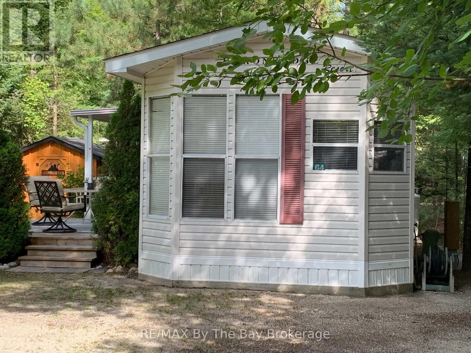 Nestled in a secluded haven within the beloved Countrylife Resort, this Huron Ridge Resort Cottage (2001) invites you into a world where summer dreams unfold effortlessly. Open for seven blissful months (May 1st-November 16th), this 2-bedroom, front-kitchen retreat gleams brighter than the day it first rolled off the factory floor. Step outside and discover a outdoor sanctuary 15×10 ft. hard-roofed