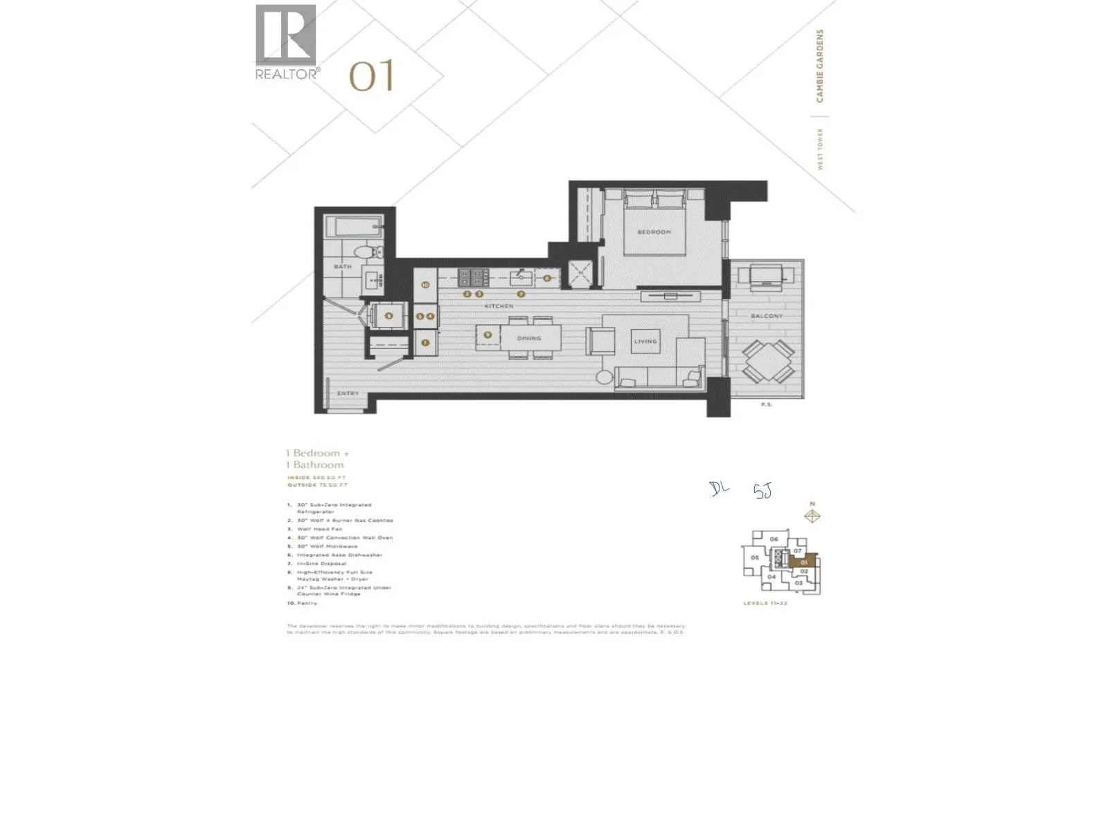 Welcome to this beautiful and functional 1 Bed 1 Bath easting facing unit at Cambie Gardens, Onni Group’s masterplanned community on Vancouver’s westside. Lavishly finished with engineered HW flooring, AC, automated lighting & roller shades. A gourmet kitchen includes natural stone countertops and a 30″ Sub Zero + Wolf appliance package with integrated refrigerator and wine fridge. A spa-inspired bathroom