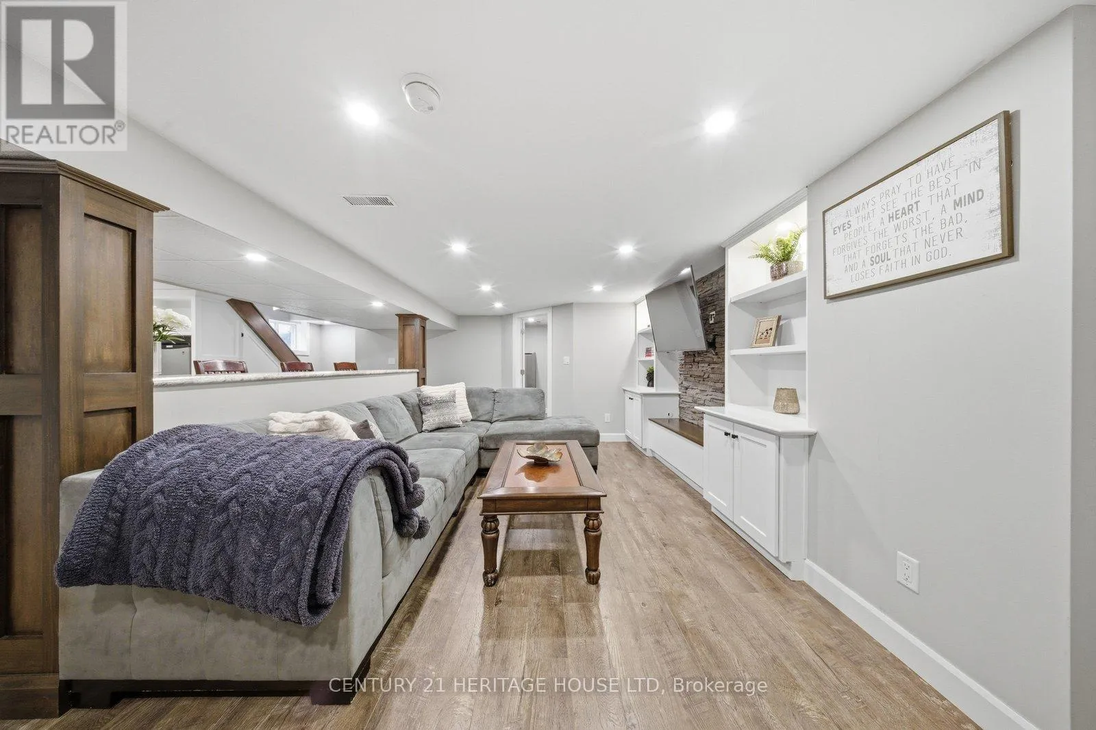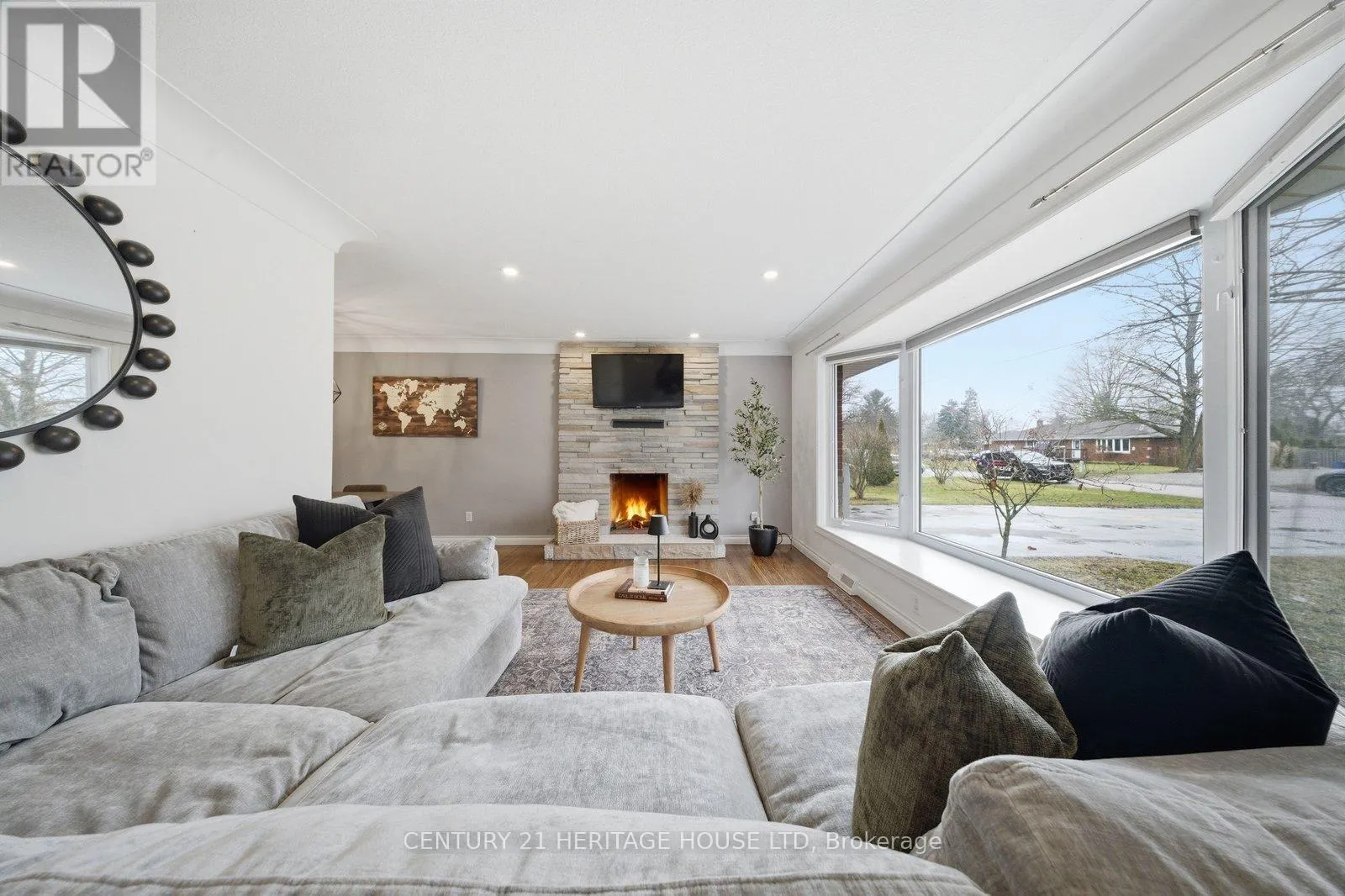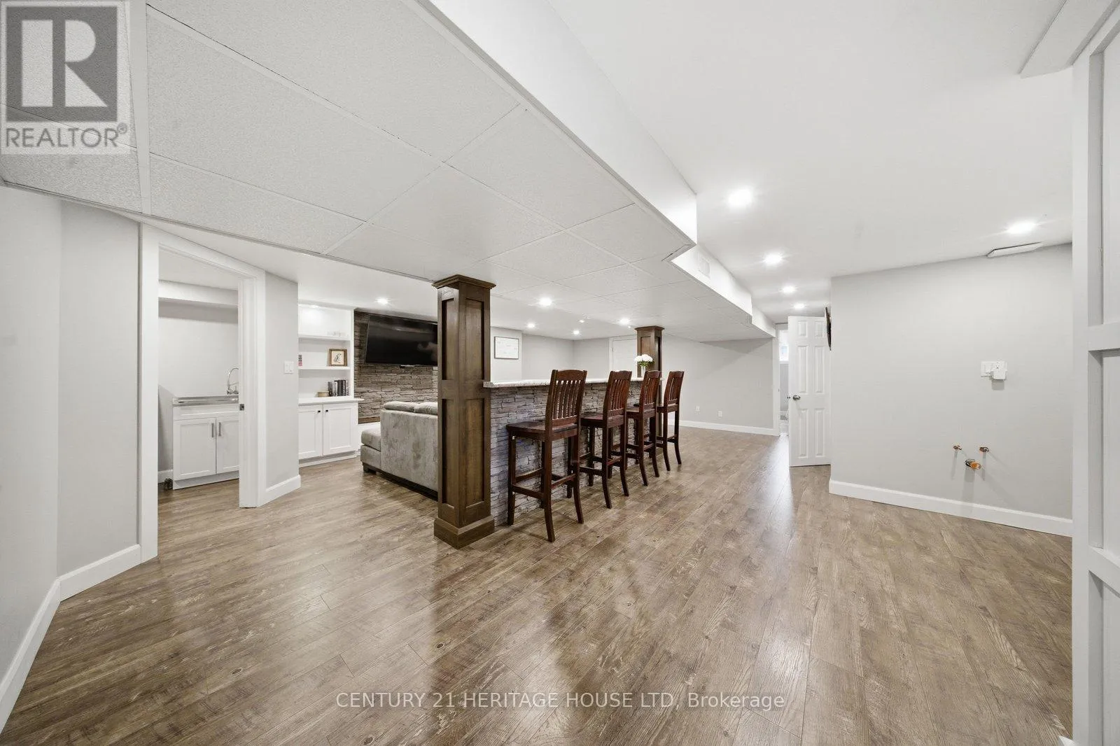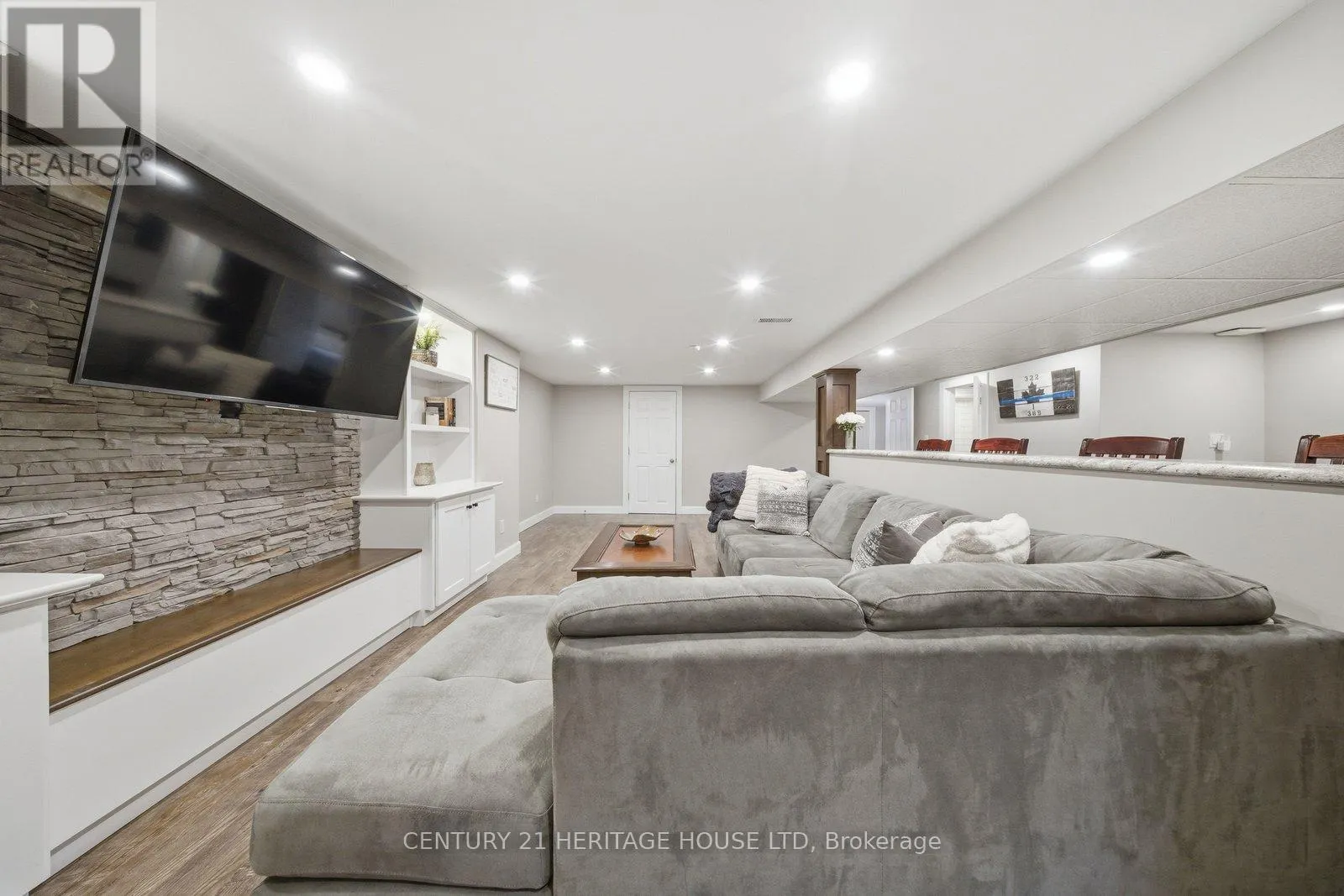 living, entertaining, and family gatherings. Step inside to a bright and spacious living room featuring a beautiful bay window that fills the space with natural light. Refinished hardwood flooring flows through the living and dining areas, while recessed pot lighting and a stunning stone hearth add warmth and character. The main floor offers a great balance of open-concept living while still maintaining a cozy, inviting feel. The spacious kitchen is designed with functionality in mind, offering plenty of cupboard and counter space, white cabinetry, tiled backsplash, and under-cabinet lighting. Convenient access to the backyard is located just off the kitchen, making outdoor entertaining easy. Down the hallway, you’ll find three generous-sized bedrooms, including the primary bedroom, all offering plenty of natural light, along with a 4-piece bathroom on the main level. Looking for more space? The finished lower level provides even more room for the whole family to enjoy. A beautifully finished rec room features a built-in unit with a stone accent wall and TV viewing bar, making it the perfect spot for watching sports, hosting events, or simply relaxing. A rough-in for a wet bar adds even more potential for entertaining or creating your ideal hangout space. This level also includes a 3-piece bathroom, two additional large bedrooms, and a finished laundry room. Step outside to enjoy the fully fenced backyard, complete with an expansive wooden deck and a tree-lined fence line that adds privacy and charm. (id:62650)