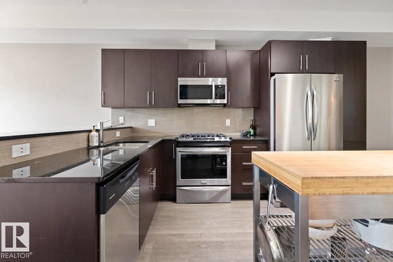 Immaculate and upgraded top floor corner unit! This 2 bdrm, 2 bath air conditioned condo in Brownstones I offers stylish, move in ready living in a prime location! This open concept home features a modern colour palette, 9’ ceilings, hardwood floors, large windows, insuite laundry, and hot water on demand that enhance comfort and convenience. The spacious layout includes a