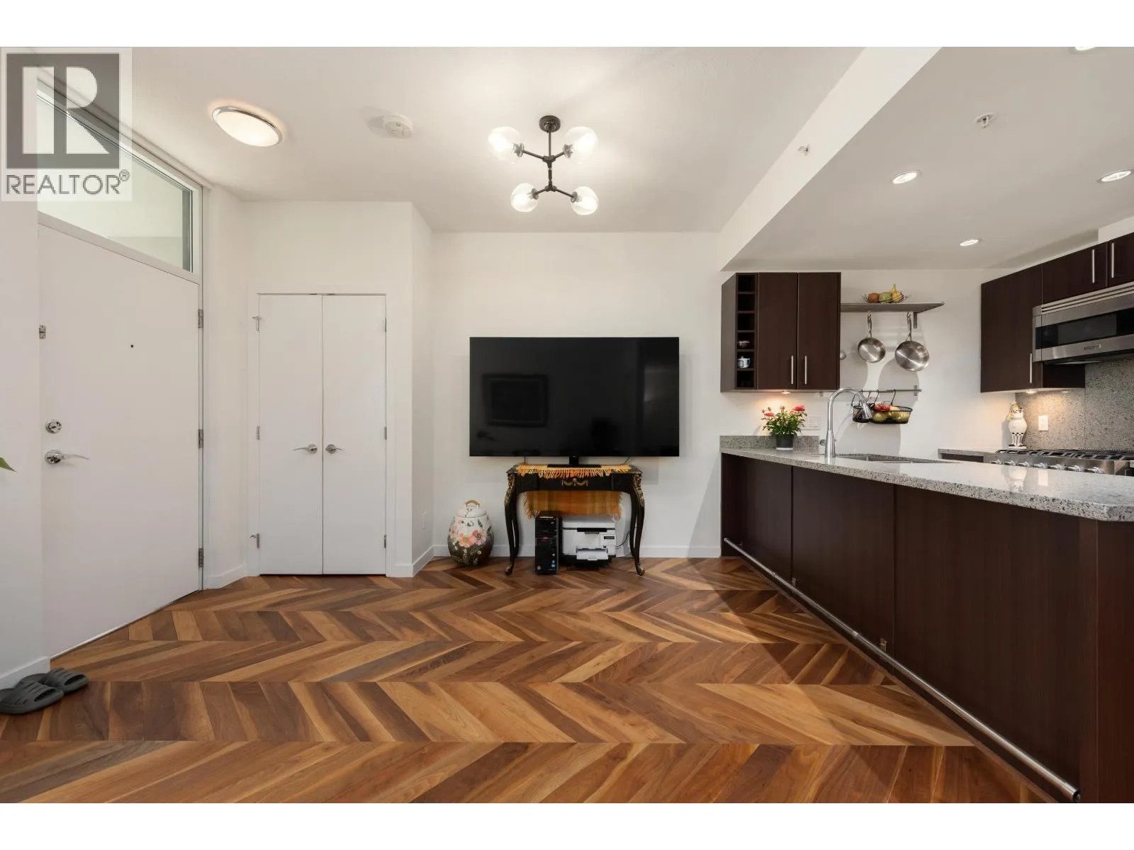 Townhome Living in the Heart of Olympic Village. This beautifully maintained SOUTH-FACING CONCRETE 2 Bed + Den, 2 Bath home features luxurious upgrades including Chevron Herringbone Walnut hardwood floors throughout, BUILT-IN CABINETRY throughout, IN-FLOOR HEATING in the bathrooms, and HOUSE-SIZED LAUNDRY. Enjoy an abundance of natural sunlight throughout the day with a 287 sqft private patio that does NOT FACE