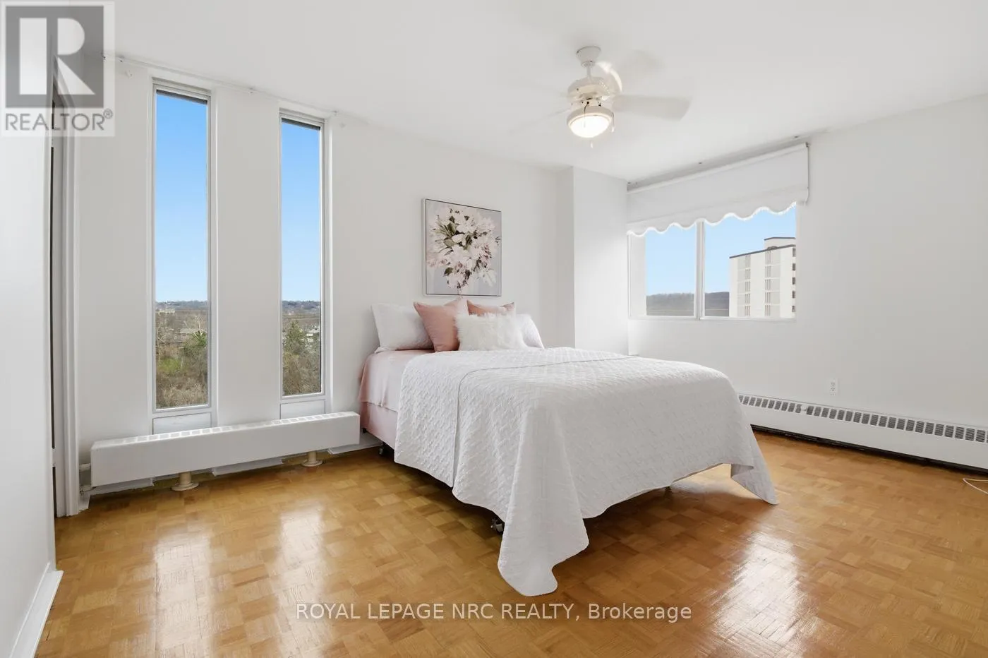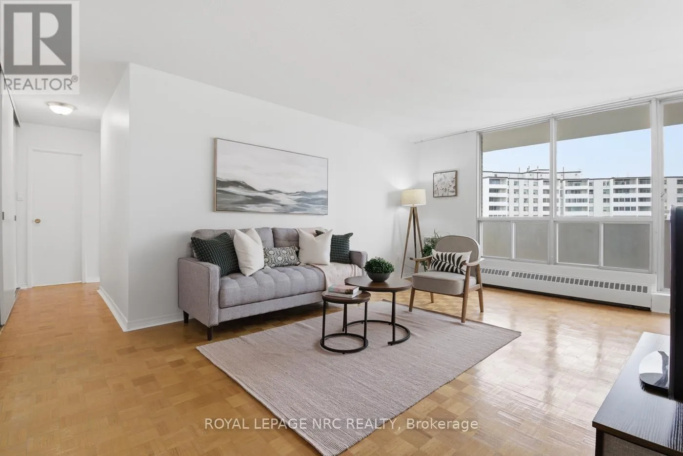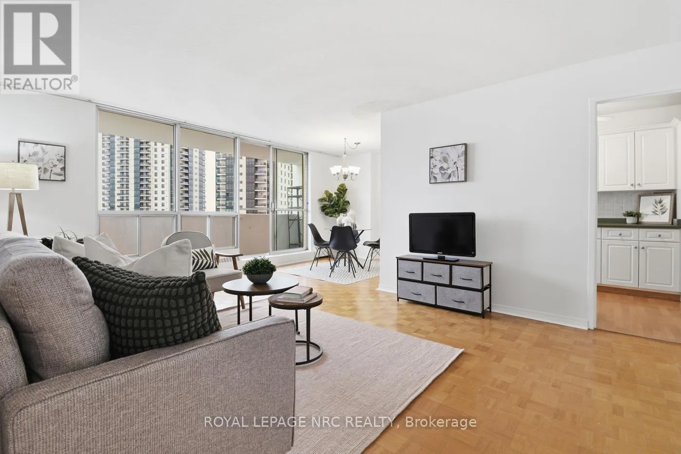 Welcome to carefree living with open concept floor plan, appointed with parquet flooring, freshly painted interior in this south- facing corner unit, boasting open balcony to enjoy early morning beverages and peaceful evening breezes. Updated kitchen with built-in dishwasher & custom backsplash and room for table on laminate flooring. L-Shaped Living/Dining Rooms open to the balcony or cool