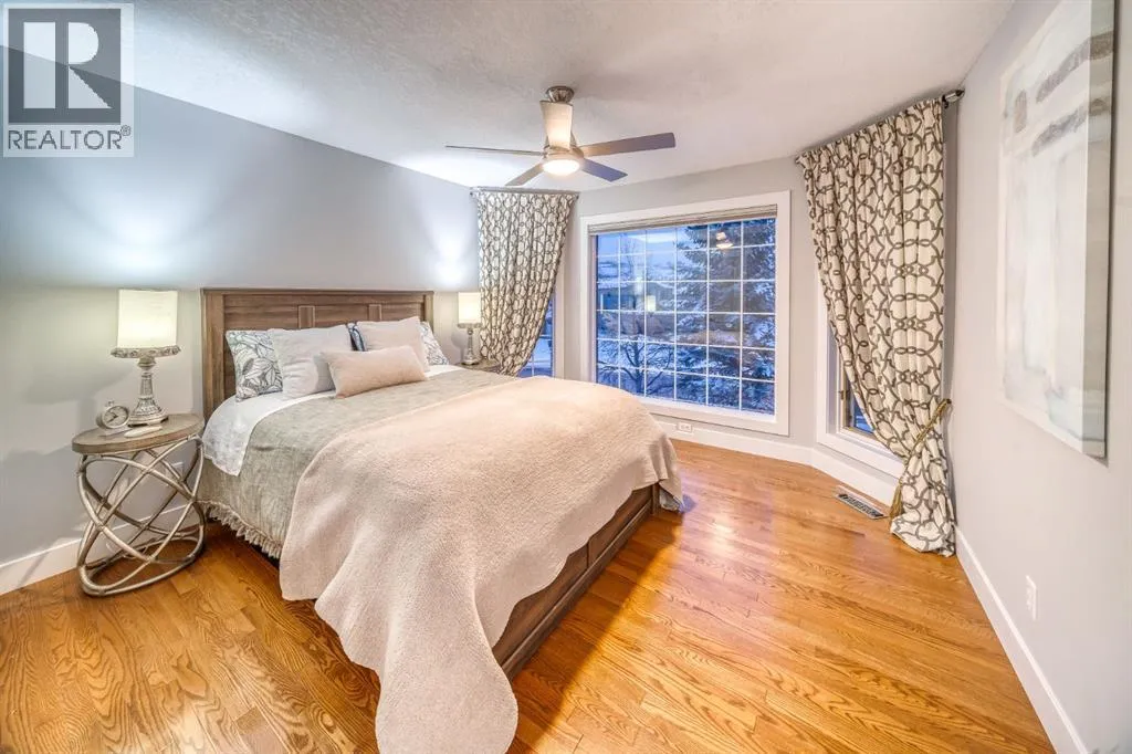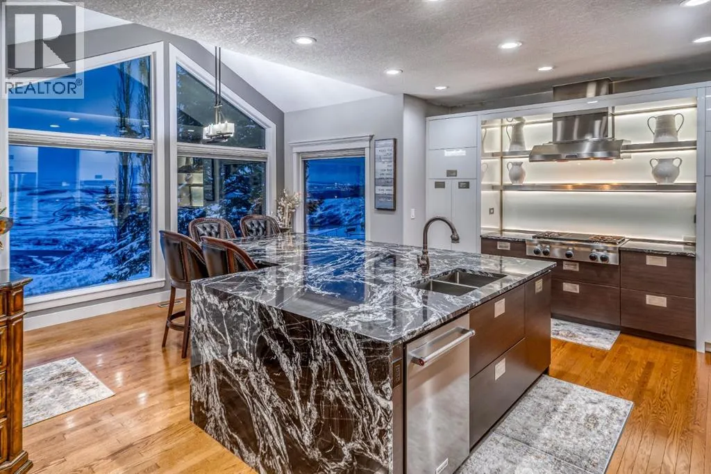 the home features six bedrooms and three and a half bathrooms, including four bedrooms on the upper level—an uncommon and highly sought-after layout for families.Extensive upgrades enhance both form and function, including updated lighting throughout, a renovated primary ensuite, a fully renovated main bathroom, refreshed main-floor powder room, and a renovated lower-level bathroom, along with new baseboards and window casings, upgraded closet doors and shelving, fresh paint throughout, central air conditioning, new carpet in the lower level, a water softener, and two new hot water tanks. The home is also equipped with two furnaces for added comfort and efficiency.From the moment you arrive, the home reveals a timeless design and welcoming presence. The expansive open-concept main floor offers effortless flow between living spaces, perfectly suited for both everyday comfort and elevated entertaining. The beautifully renovated kitchen anchors the home, thoughtfully positioned to keep the host connected as guests gather in the living room around the fireplace, framed by sweeping views beyond.Entertaining continues seamlessly into the formal dining room, designed to accommodate both intimate dinners and larger celebrations with ease. Completing the main level are a private office or den, a spacious laundry and mudroom with sink, and a formal living room—ideal for hosting and conversation.A stunning curved staircase connects all levels, adding architectural elegance while guiding you to the upper floor where the luxurious primary ret reat awaits, complete with a spa-inspired ensuite with claw foot tub, walk in shower, and captivating views. Three additional generously sized bedrooms all with walk in closets, complete this level.The fully developed walkout lower level offers two additional bedrooms, a fully renovated bathroom, and an expansive recreation space with games and sitting areas—perfect for guests, teens, or multi-generational living. Outdoor living is equally impressive, with southwest exposure showcasing uninterrupted views of the surrounding landscape. Enjoy long summer evenings taking in the mountains and valley, whether relaxing on the upper balcony or gathered around the gas fire pit below.Ideally located just minutes from Cochrane’s amenities and approximately 15 minutes to Calgary, this home offers the perfect balance of luxury, privacy, and accessibility, with immediate access to scenic pathways and one of the region’s premier golf courses. (id:64429)