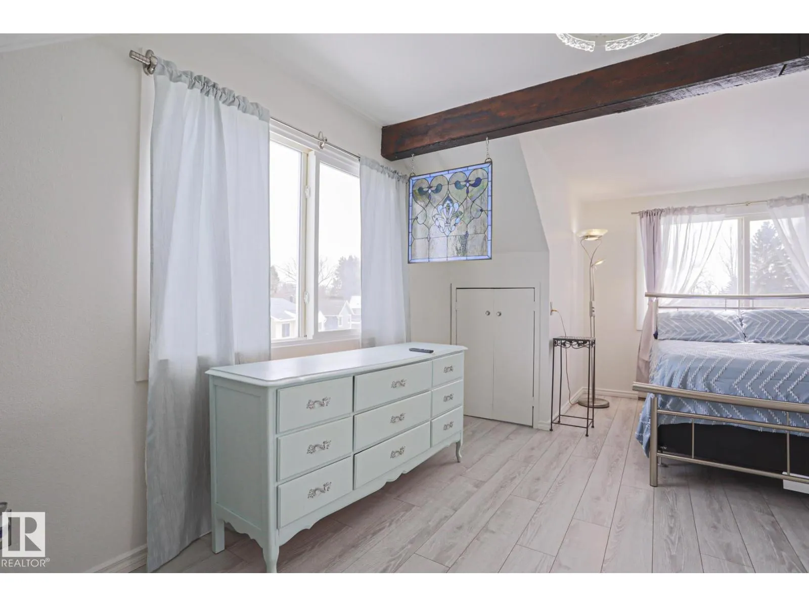 An outstanding character home + a mortgage helper! Renovated, mid-century 1.5-storey on a HUGE 1/4 ACRE PIE LOT with an INCOME PRODUCING 2 BEDROOM GARAGE SUITE built by Paramount Homes, plus space for future development! Across from an island park, updates include windows, siding, shingles, eavestroughs, fascia, doors, furnace, H20 tank, & perfectly landscaped. Main house: Open & adjacent living