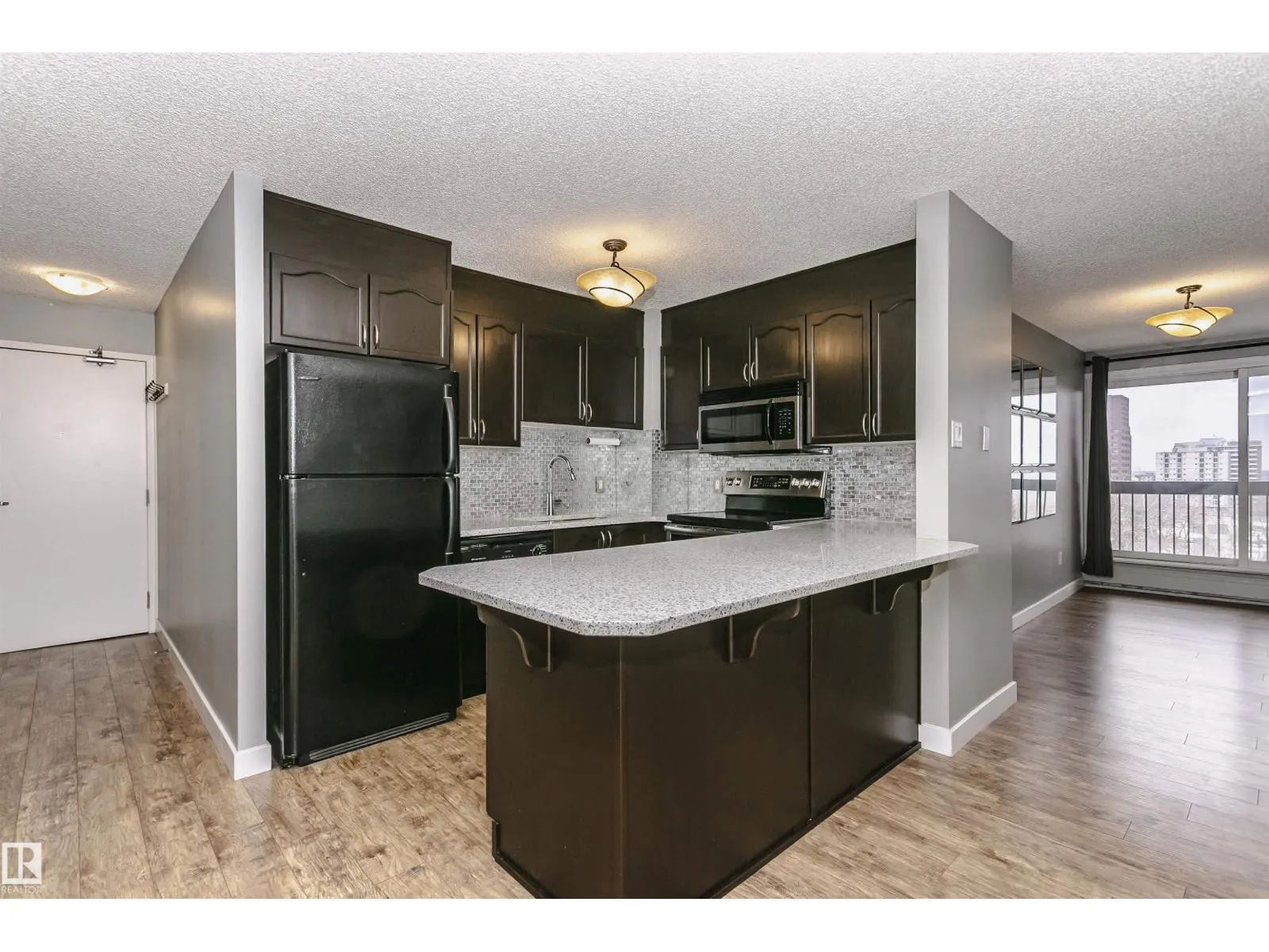 This beautiful 7th-floor condo in a solid concrete building offers stunning views of the city skyline and river valley. The well-designed unit features 2 bedrooms and 2 bathrooms, with laminate flooring throughout and a modern kitchen complete with ceiling-height dark grey maple cabinets and a breakfast bar, perfect for extra prep space and casual dining. Step onto the private balcony