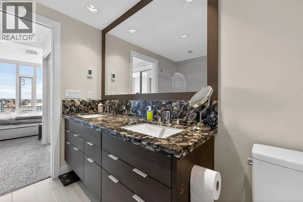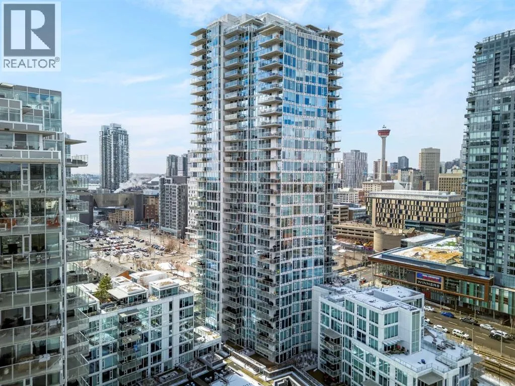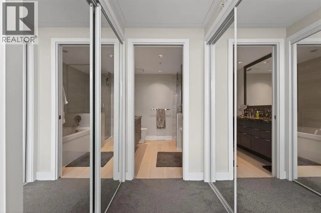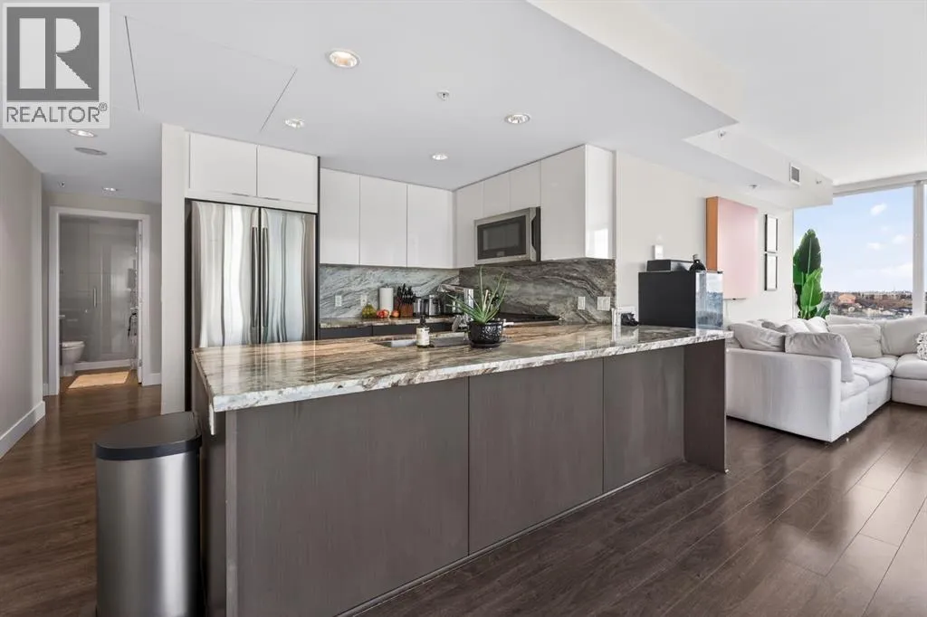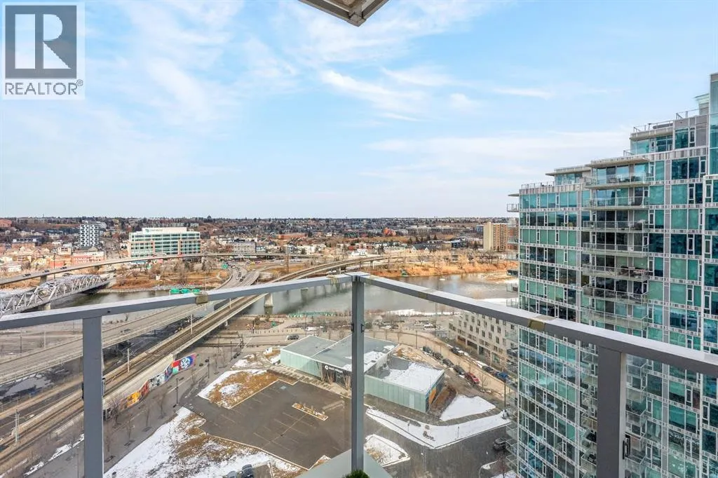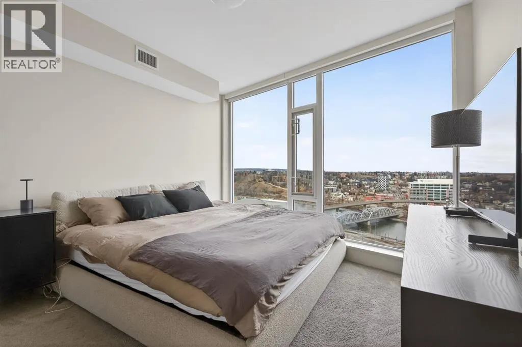 Perched on the 17th floor, this executive residence offers breathtaking views overlooking the Bow River and the vibrant city skyline. Designed with both comfort and style in mind, this spacious 2-bedroom, 2-bathroom suite features soaring ceilings, expansive floor-to-ceiling windows, rich hardwood and tile flooring, and plush carpeting in the primary bedroom. The open-concept layout seamlessly connects the kitchen, dining, and