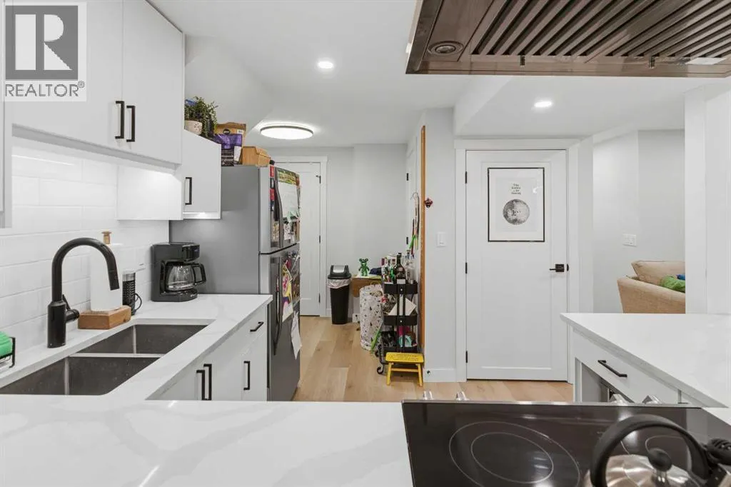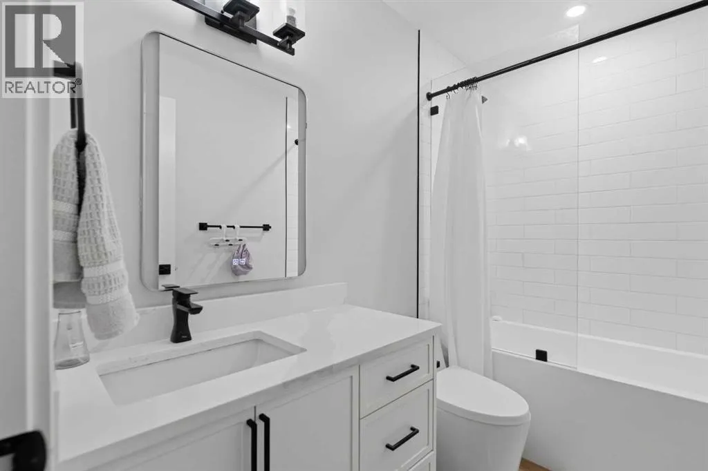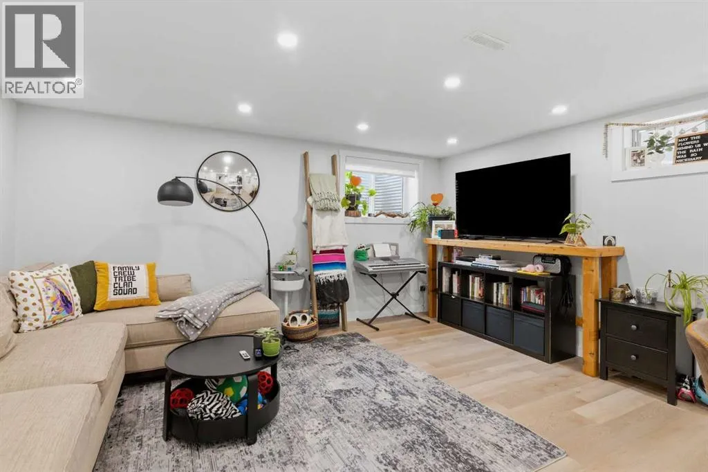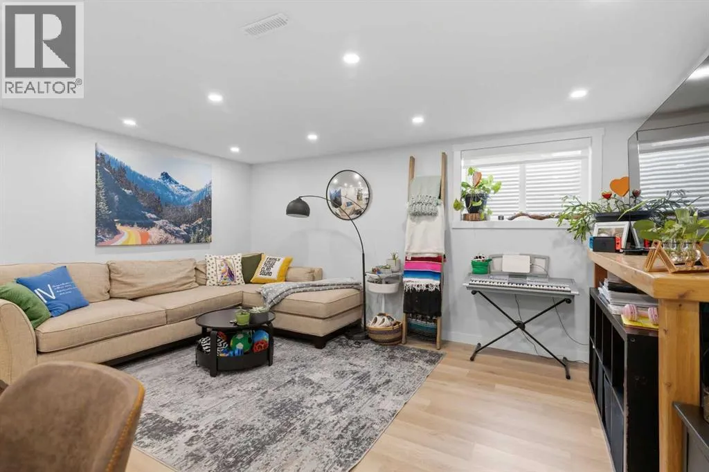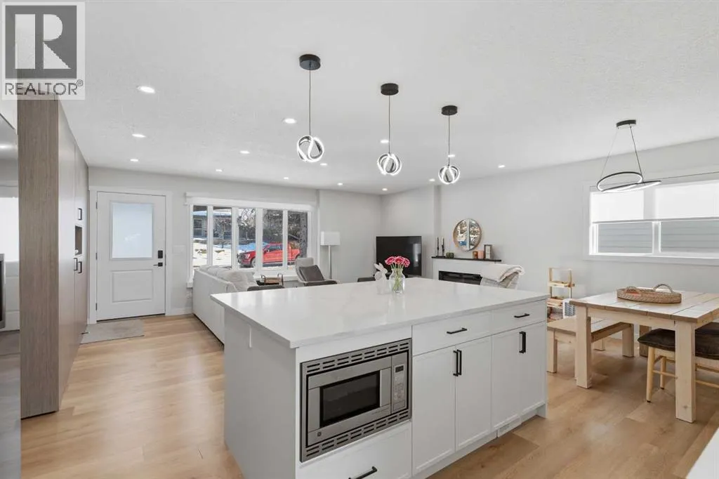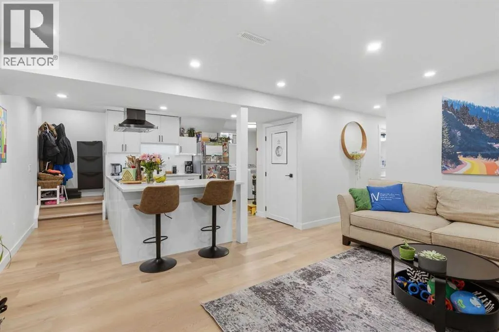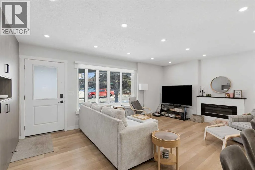 keeps daily routines organized while creating an immediate sense of intention and design. Gather around the gas fireplace in the living room as expansive windows draw in natural light throughout the day, enhancing both comfort and atmosphere. Entertain with ease as clear sightlines connect the dining area, where designer lighting elevates both casual meals and special occasions. Stay productive at the integrated workstation that adapts seamlessly to work or study needs without sacrificing living space. Effortlessly prepare meals in the thoughtfully designed kitchen showcasing quartz countertops, full-height cabinetry, high-end appliances including a gas stove, and a large island that anchors conversation and connection. Retreat at the end of the day to a private primary bedroom featuring its own stylish 2-piece ensuite, while two additional bedrooms and a well-appointed 4-piece bathroom complete the main level. Head downstairs through a separate entrance to discover a fully self-contained lower level equipped with its own laundry, ensuring privacy and independence. Enjoy a modern open layout that mirrors the quality and finish of the upper level, complemented by a spacious living area and a full kitchen finished with quartz surfaces, stainless steel appliances and a central island. Rest comfortably in three additional bedrooms with egress windows that enhance both safety and natural light, including a primary space with its own 2-piece ensuite, while a 4-piece bathroom serves the remainder of the level. Benefit from major upgra des completed in 2024 including a furnace, hot water tank, roof shingles, and windows, delivering peace of mind for years ahead. Spend time outdoors in the expansive backyard where mature trees create a private setting, a paver stone patio encourages outdoor dining and relaxation and generous lawn space supports play or gardening. Appreciate the quiet location just steps from pathways leading to the Bow River, where nature, recreation and scenic views become part of daily life. It is a short drive to nearby Winsport, Silver Springs golf and country club, U of C, Market Mall and the Foothills Hospital. Don’t miss out on the opportunity. (id:64429)