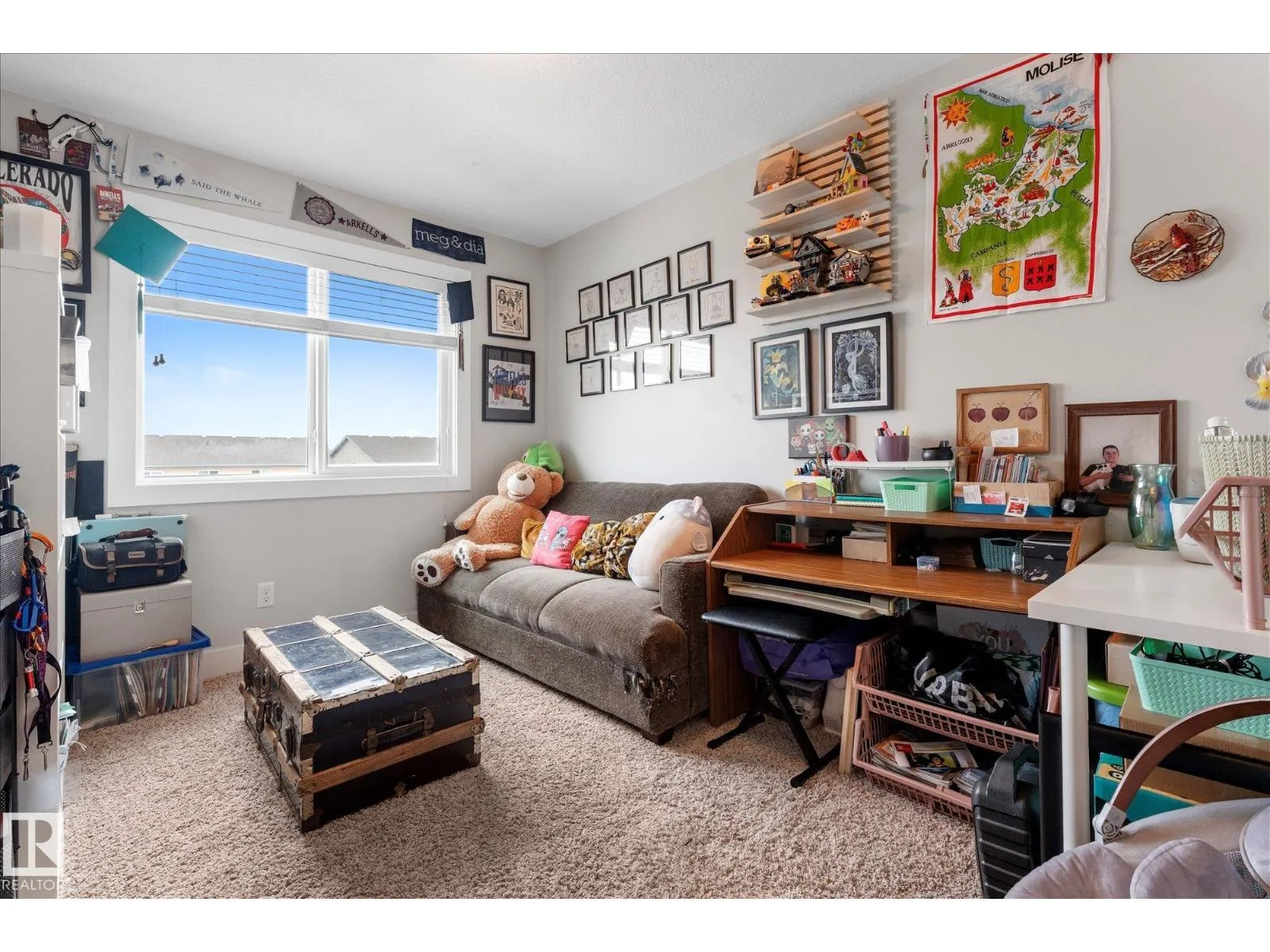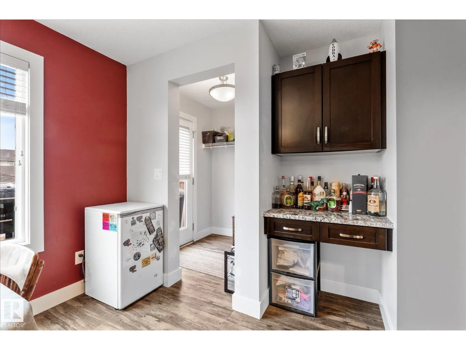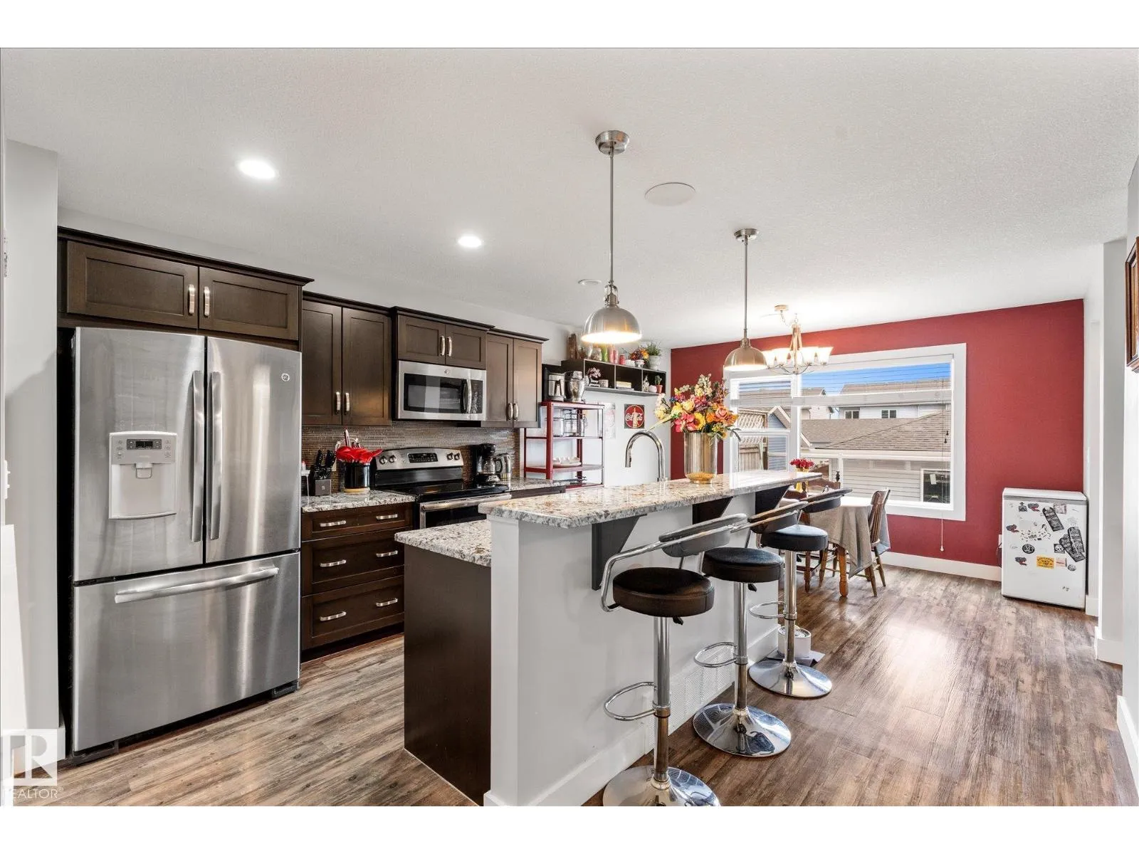 This stylish home features inviting curb appeal and a functional layout, with several upgrades already completed. The open-concept main floor showcases luxury vinyl plank flooring and granite countertops, creating a clean, modern feel. The bright and spacious living room features a cozy gas fireplace and ceiling-mounted Bluetooth speakers. The kitchen offers dark cabinetry, stainless steel appliances, an extended eat-up bar,