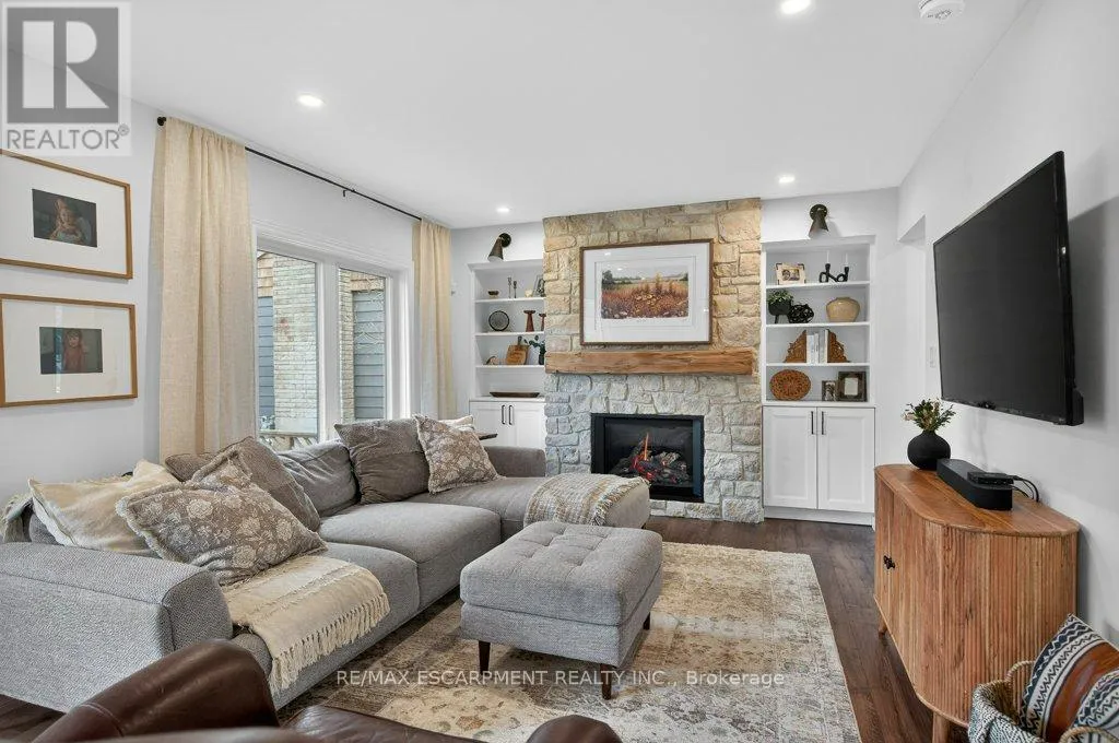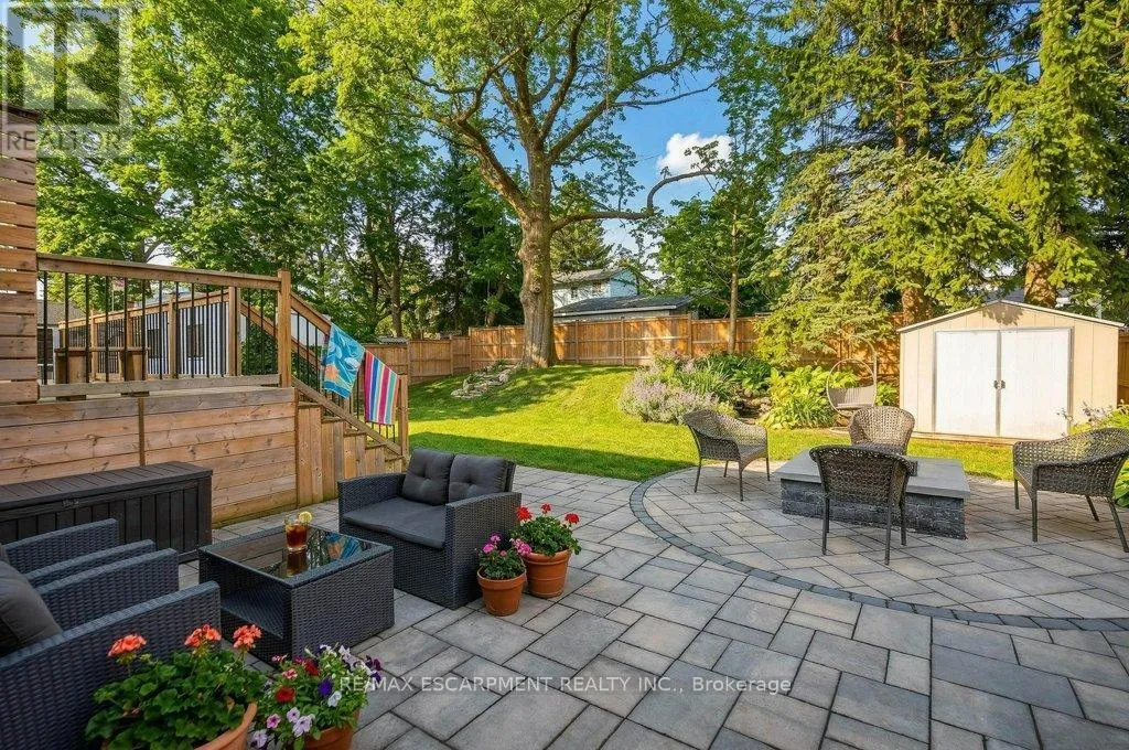 layout on the main floor features a beautiful kitchen with large island, quartz counters and stainless appliances. A large dining area with sliders to the rear yard and great room with gorgeous gas fireplace flanked by built-ins provide seamless flow for keeping an eye on the kids or staying engaged with guests while preparing a meal. A built-in coffee servery is another part of the incredible detail and thought put into this home! A main floor laundry and powder room area provides access to the rear yard. In the other end of the main floor you will find 3 bedrooms and a 4 piece bathroom. A hardwood staircase takes you to the absolutely incredible primary retreat! This one will take your breath away featuring vaulted and timber beam ceiling, french doors to a juliette balcony, an expansive walk-in closet with built-ins and a gorgeous ensuite with stand alone soaker tub, glass enclosed shower and a double custom vanity! The lower level is completely finished with a large family room, play area, workout space, large storage area, den and mudroom with built-ins with access to the attached garage. The spacious backyard has a large upper deck and a gorgeous stone patio with firepit. BONUS is a custom 10 x 12 outbuilding matching the home in finishes. It is insulated and has heating and cooling – ideal for a home office, he/she shed or workshop! This location can’t be beat for those looking for a quiet spot to call home, yet conveniently located in the hub of it all, walking distance to schools, shops, restaurants, trails and Memorial Park. Homes like this rarely come along! (id:62650)