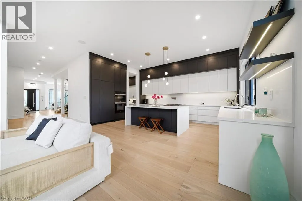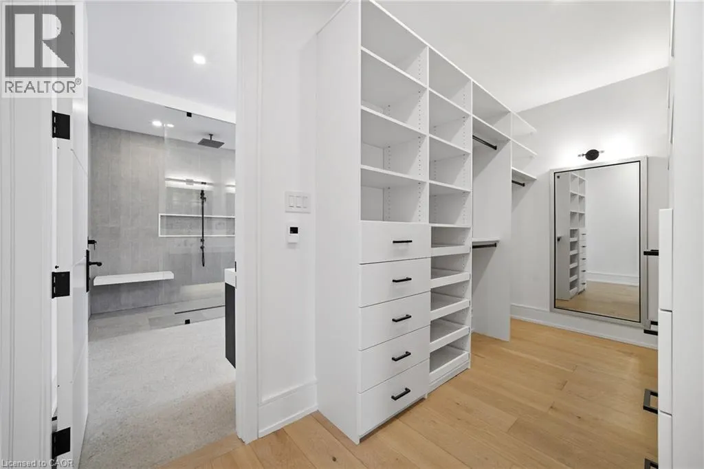 a dramatic 21-ft open-to-above design & gas fireplace. The chef-inspired kitchen is a true showpiece, featuring a waterfall quartz island, floor-to-ceiling custom cabinetry, panel-ready Miele appliances including a side-by-side Fridge/Freezer, Gas Range, Built-in Oven & Dishwasher & a spacious walk-in pantry. A main floor office or bedroom w/ private ensuite adds both convenience & flexibility for multigenerational living or work-from-home needs. Upstairs, four generously sized bedrooms each offer custom built-in closets & private, spa-like ensuites w/ designer fixtures . The primary retreat is a sanctuary of its own, complete w/ a private balcony overlooking mature trees, heated floors, Towel warmer, custom vanity, glass shower, & a luxurious freestanding tub. Additional features include a solid wood staircase w/ glass railings, heated laundry floors, & integrated audio system throughout the home. The fully finished walkout basement w/ 9-ft ceilings provides additional living space, including a recreation room, bedroom w/ ensuite, full bathroom & flexible areas for extended family, guests, or a nanny suite, along w/ a rough-in for a wet bar. Exterior highlights include a professionally landscaped front & rear yard w/ LED lighting, covered porch with glass railings, natural gas line for BBQ & a fully fenced private backyard perfect for entertaining. Additional features include central vacuum, multiple fireplaces, EV charging rough-in, multi-zone audio, security cameras, & dual furnaces w/ separate controls for optimal comfort. *Virtually staged pictures** (id:62650)