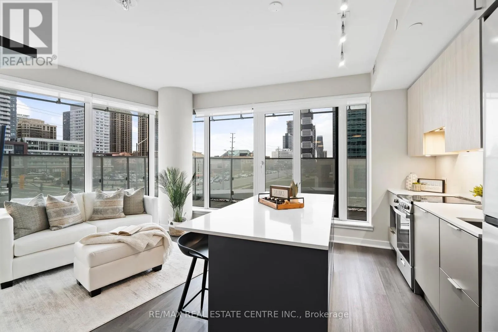 Experience luxury living at M City 1! Spacious upgraded corner podium unit offering 835 sq. ft. of interior living space plus an impressive 256 sq. ft. wraparound balcony. This well-maintained 2-bedroom plus den suite features laminate flooring throughout, stainless steel appliances including an upgraded, larger refrigerator, open-concept layout, and upgraded kitchen island with pantry for added prep space and functionality.