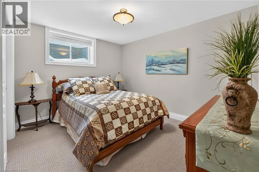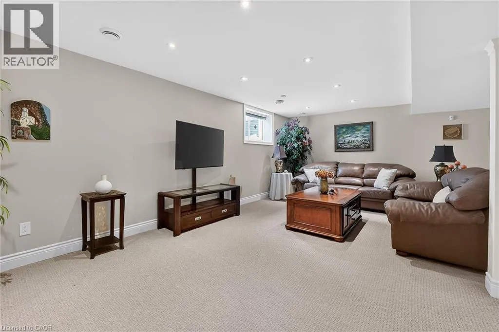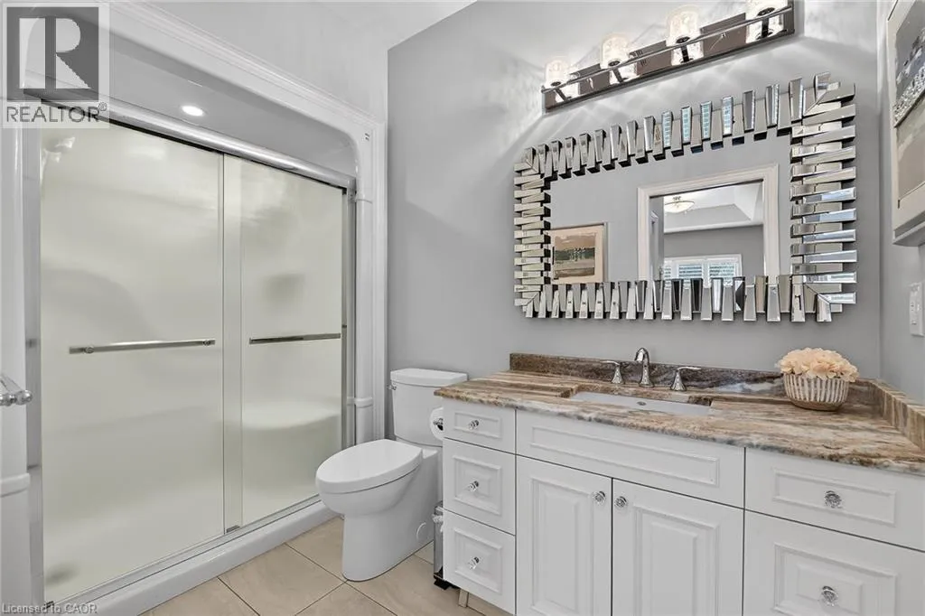 by cove ceilings, low-sheen hardwood, and California shutters. The chef-inspired kitchen features premium solid-surface counters, an expansive breakfast bar, and an abundance of cabinetry. Bathed in natural light from skylights and vaulted ceilings, the living room offers a cozy gas fireplace-the heart of the home. Retreat to the primary suite featuring a walk-in closet and private ensuite, or host guests in the airy front bedroom with its own vaulted ceilings. The fully finished lower level feels like an extension of the main floor, boasting large windows in every room, a spacious rec room, two additional bedrooms, and a 3-piece bath. Step outside to your private oasis: a large composite deck with an electric awning overlooking a serene, treed view. Low condo fees cover snow and lawn care, ensuring a lifestyle of pure relaxation. (id:62650)
