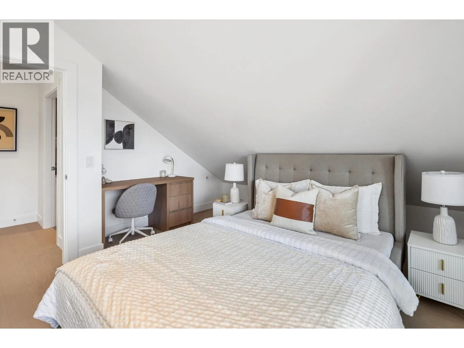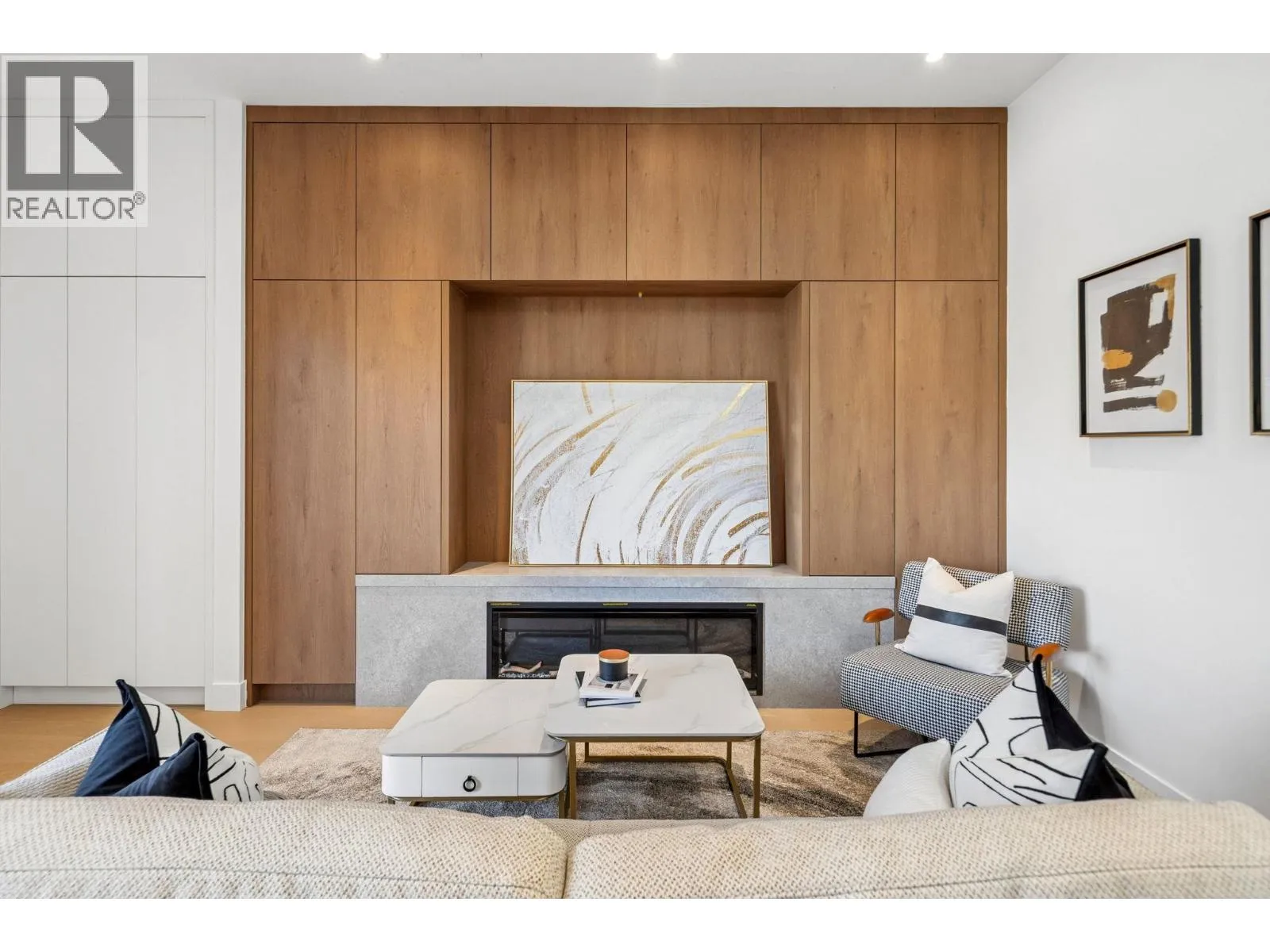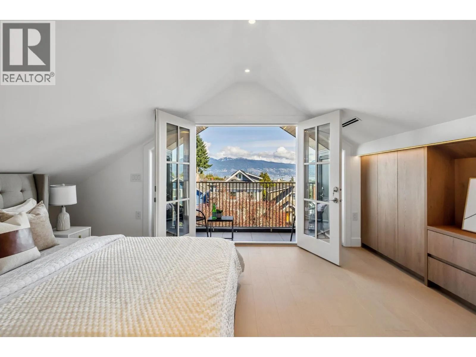 Modern Sophistication in Dunbar-a stunning 1,656 sqft. front duplex. This meticulously designed residence built by Astrawest spans three levels, crowned by a spectacular top-floor retreat featuring vaulted ceilings and a private balcony with expansive northern views. The main level boasts 10’0″ ceilings and a gourmet kitchen anchored by a waterfall island, custom wood-toned cabinetry, and Miele appliances including a gas