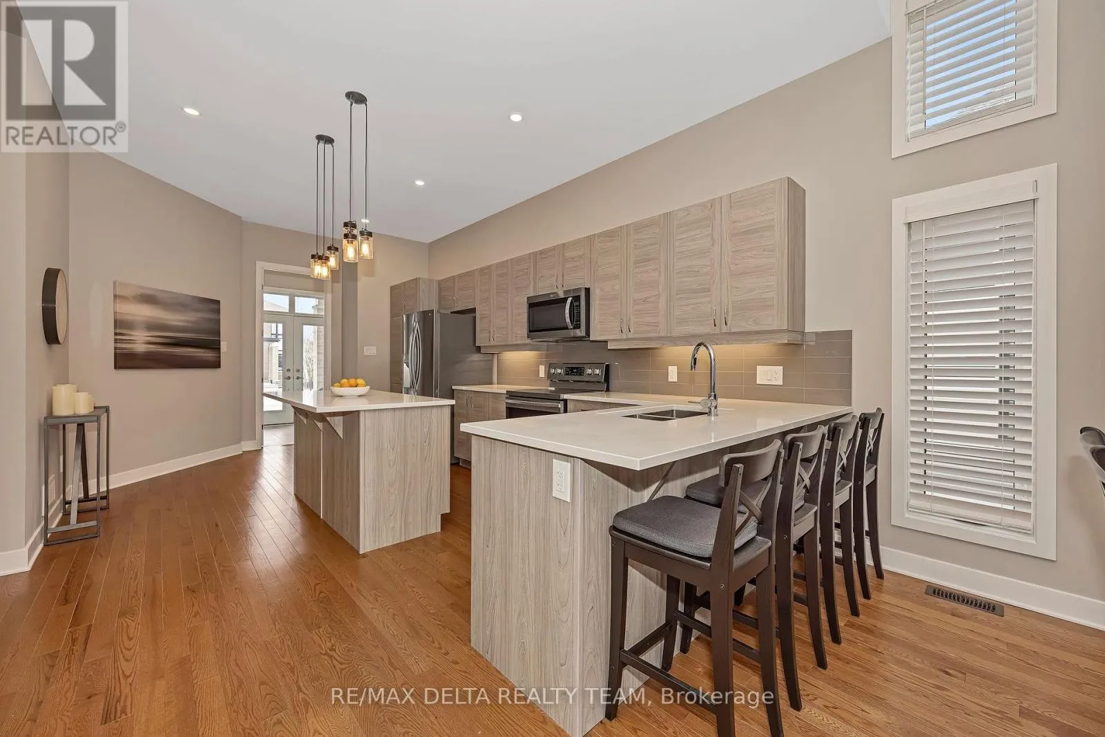 This stylish 3-bedroom bungalow blends modern finishes with exceptional comfort. Highlights include hardwood flooring, quartz counters, upgraded lighting, glass showers, and soaring 10- and 12-foot ceilings. The bright open-concept layout features a sleek kitchen with stainless steel appliances and a breakfast island. The main floor offers a serene primary suite with walk-in closet and ensuite, a second bedroom with cheater