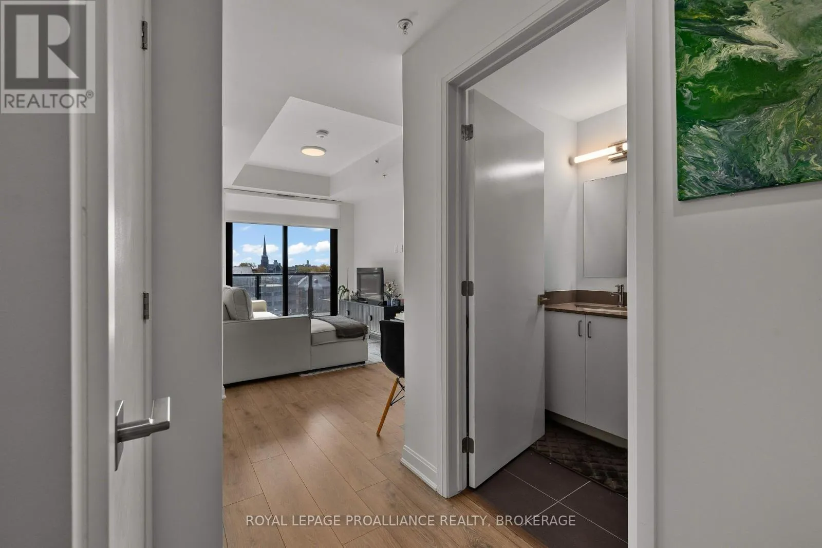 Step into modern living with this stunning 600+ sq.ft. unit on the seventh floor of Kingston’s newest condo development! Features include a spacious bedroom and dedicated office area, perfect for working from home, two full bathrooms for added convenience, a bright and sunny living area with patio doors leading to a balcony with expansive views of downtown, in-suite laundry