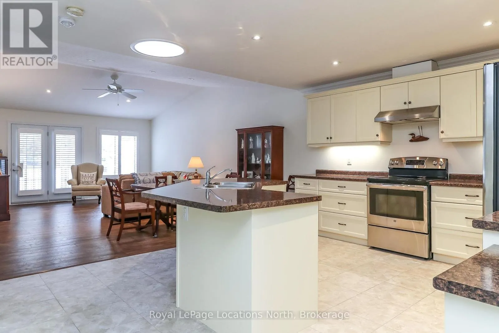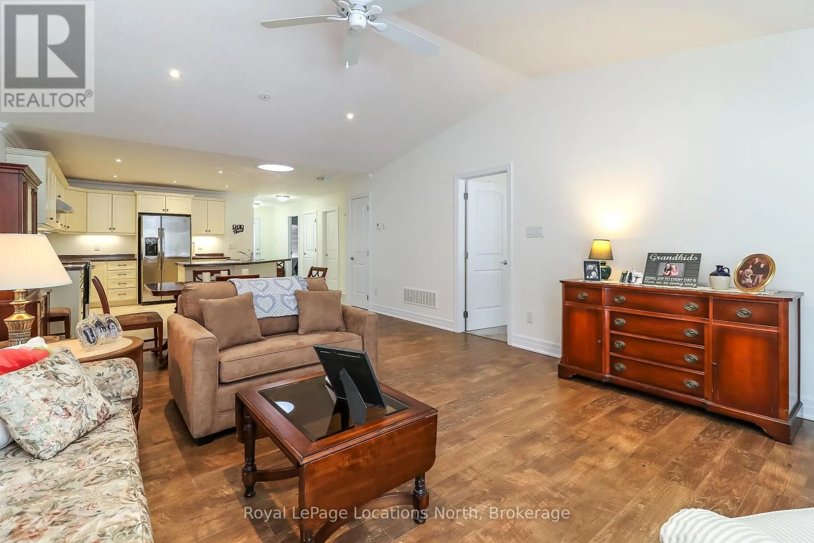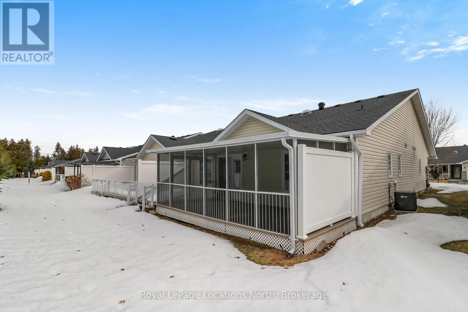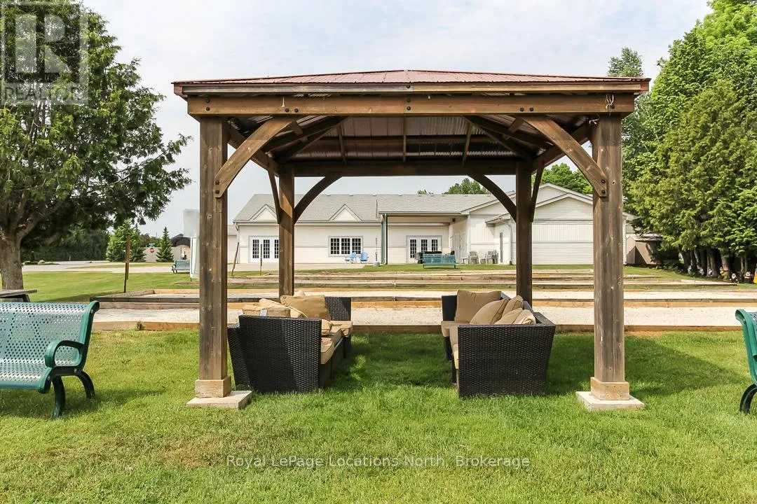 Spotlessly clean, wonderfully laid-out true bungalow (no steps at front door) located in a popular adult (age 55+) land lease community in a very quiet & tranquil area of Wasaga Beach. This 10-year-old, 1,248 sq. ft. semi-detached end-unit home has 2 bedrooms/2 bathrooms & shows like new. Features include open-concept principal living areas (kitchen, dining area & living room); vaulted