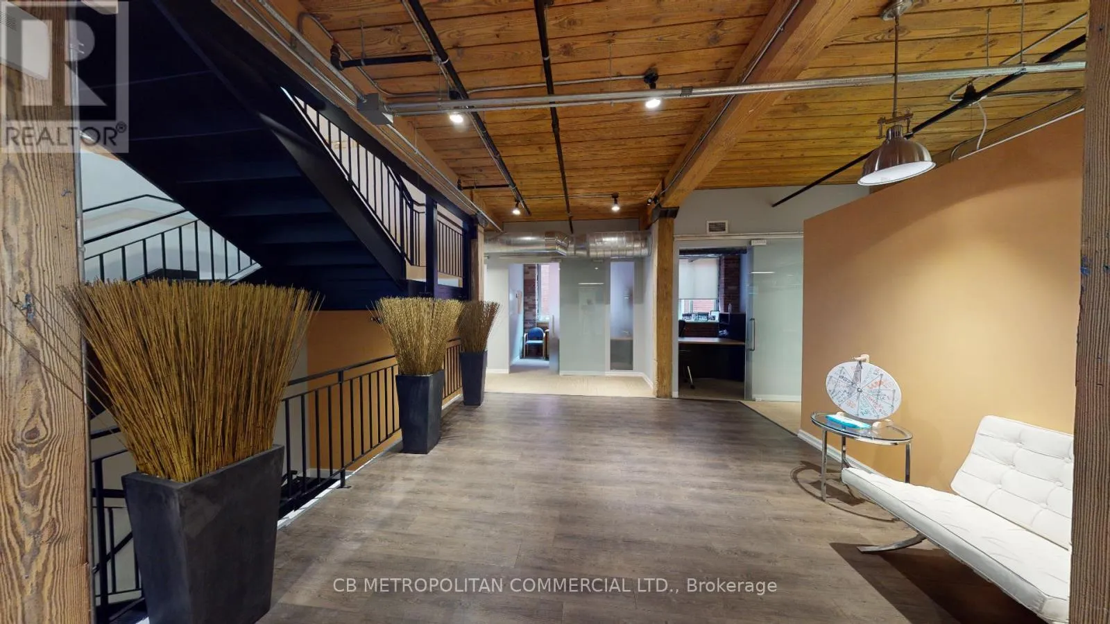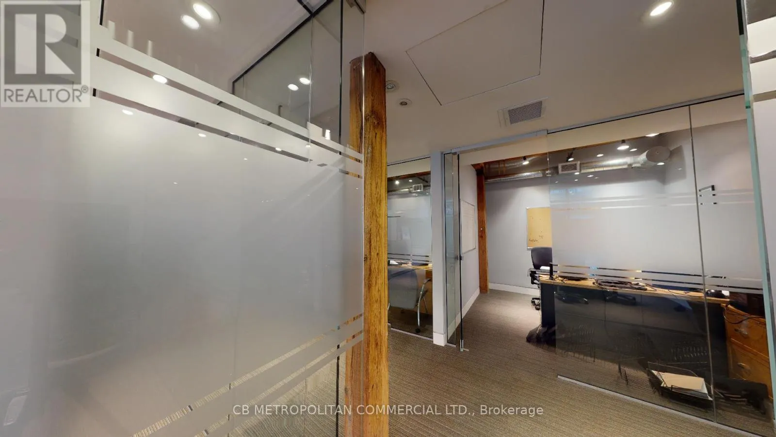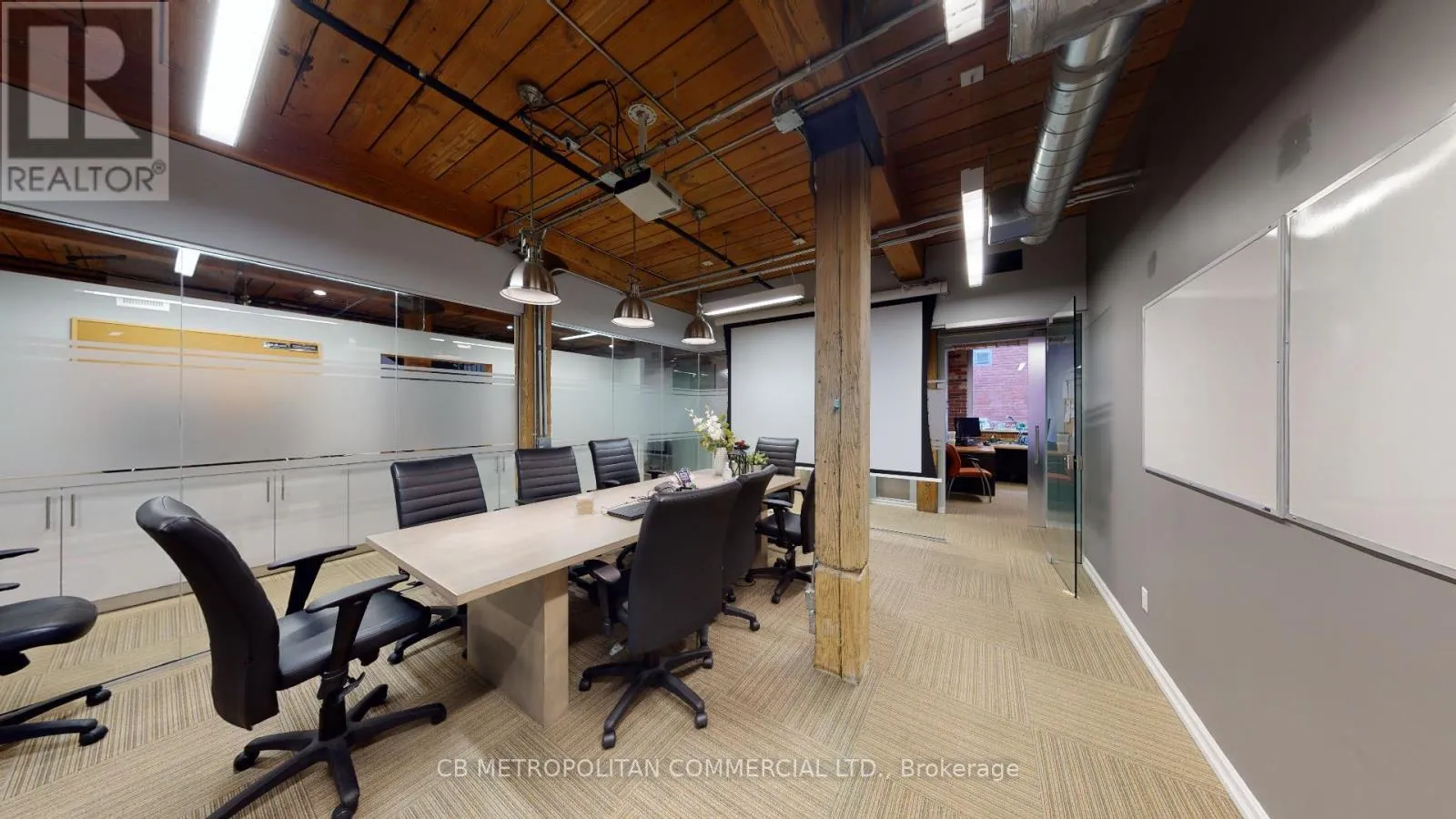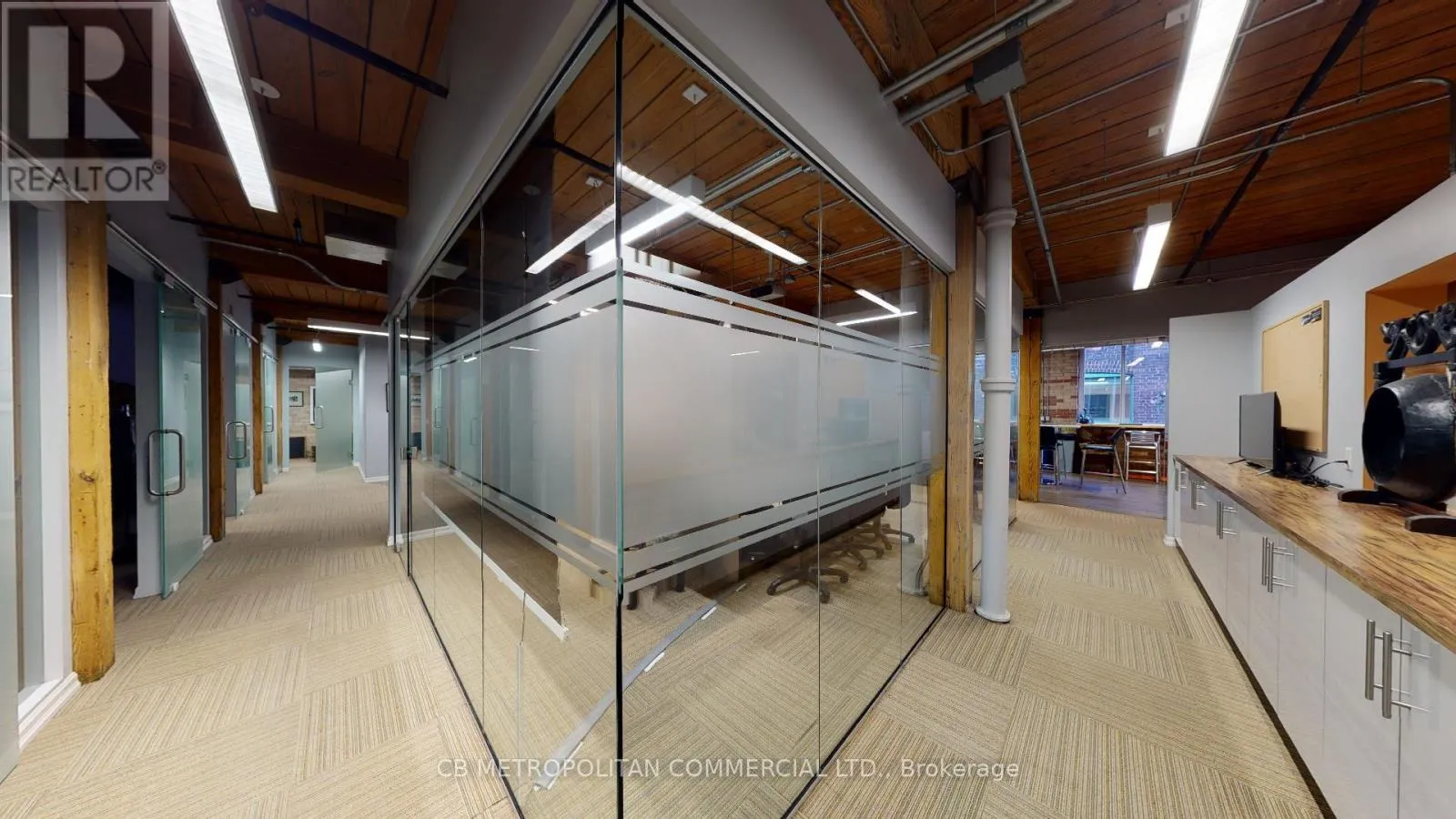 Stunning Turnkey Modern Brick And Beam Office Space Over 2 upper levels, Numerous Private Offices and open concept work spaces. Many With Glass And Brick Walls, Wood Beams, Large Open Concept Workstation Areas With Multiple Cubicles, High Profile Main Presentation Rooms, 3 Large Boardroom/ Creative Think Tank Rooms, Generous Eat In Kitchen With Appliances, Extensive Track lighting and Blinds