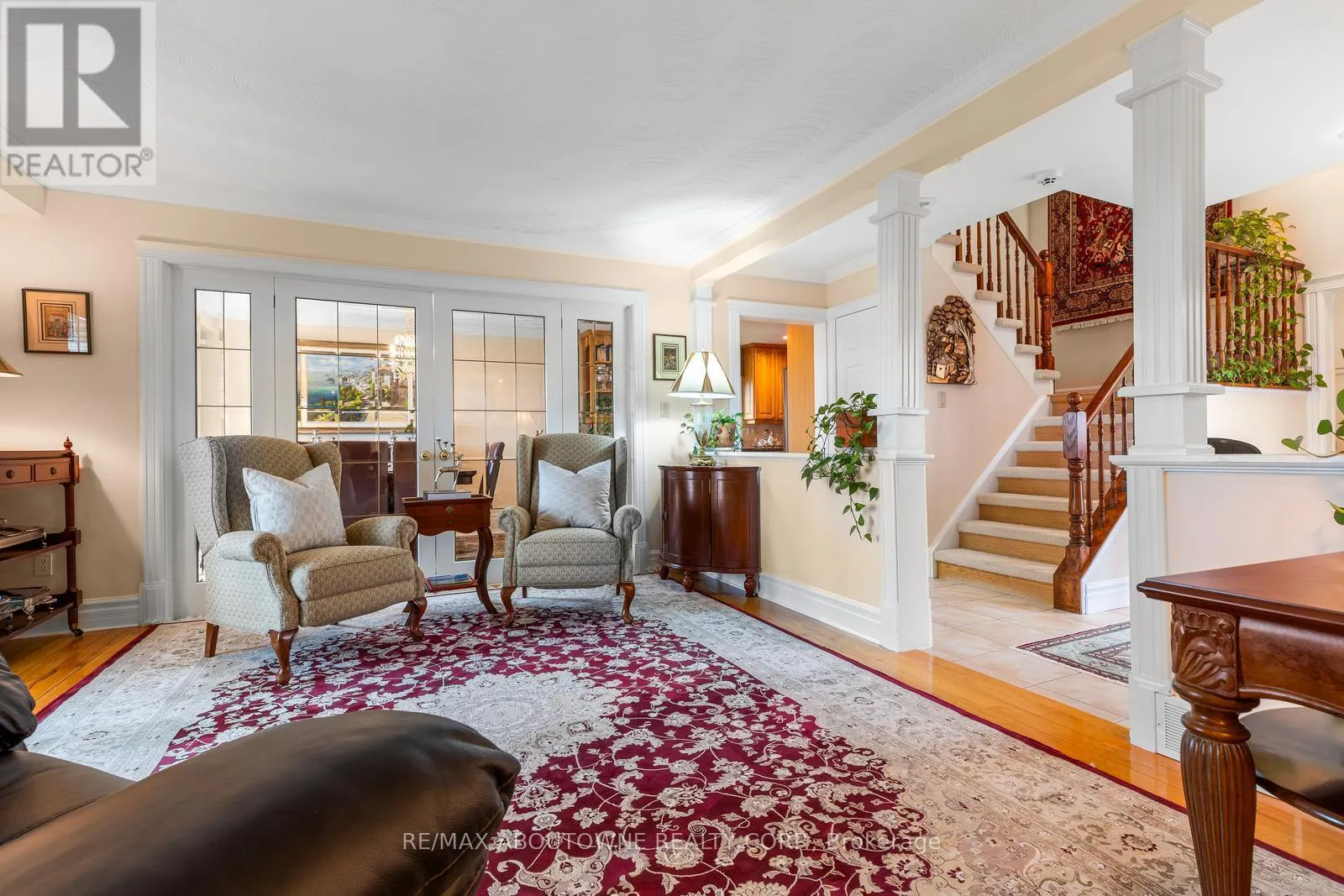 Exceptional waterfront 3 +1 bedroom and 3.5 bathrooms detached home in Grimsby, offering a grand double door entry and an impressive foyer with soaring 16’11” ceilings. This well-appointed home features a beautiful wood staircase and a spacious layout designed for both comfortable living and entertaining. The bright living room showcases rich hardwood flooring and a charming wood-burning fireplace, while the