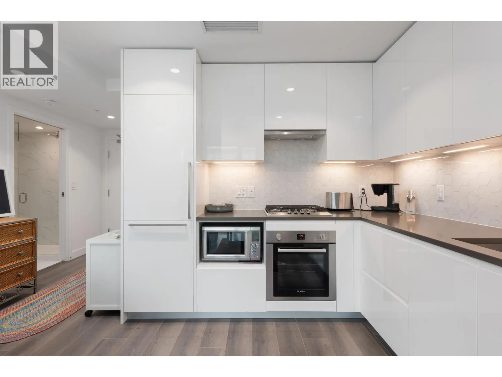 Welcome to Fraser Commons at Marine. This contemporary, air-conditioned one bedroom plus den unit, offers beautiful wood laminate flooring throughout, oversized windows, kitchen with elegantly combined lacquer and laminate finishes cabinet, quartz countertops, stainless steel appliances. Desirable amenities including a private open-air rooftop terrace on the 6th floor level, modern fitness facility, spacious daycare with ample room for outdoor
