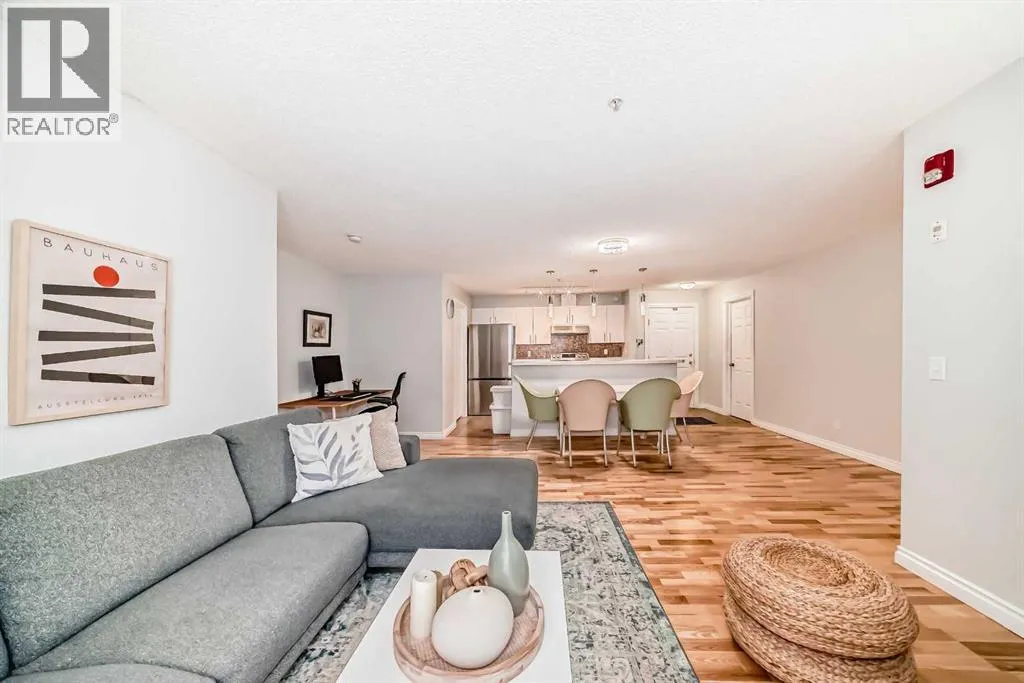 BEAUTIFUL 2-bedroom +large den (no closet) easily adapted to third bedroom, 2-bath condo just steps to shopping and the C-Train Exceptional floor plan. Stunning upgrades incl. all flooring: ceramic tile in kitchen/entry, laminate in living/dining areas and cozy carpet in bedrooms. Spectacular fresh white kitchen with newer appliances, gorgeous quartz countertops and stylish copper backsplash. Huge storage/laundry/pantry, shelving incl.