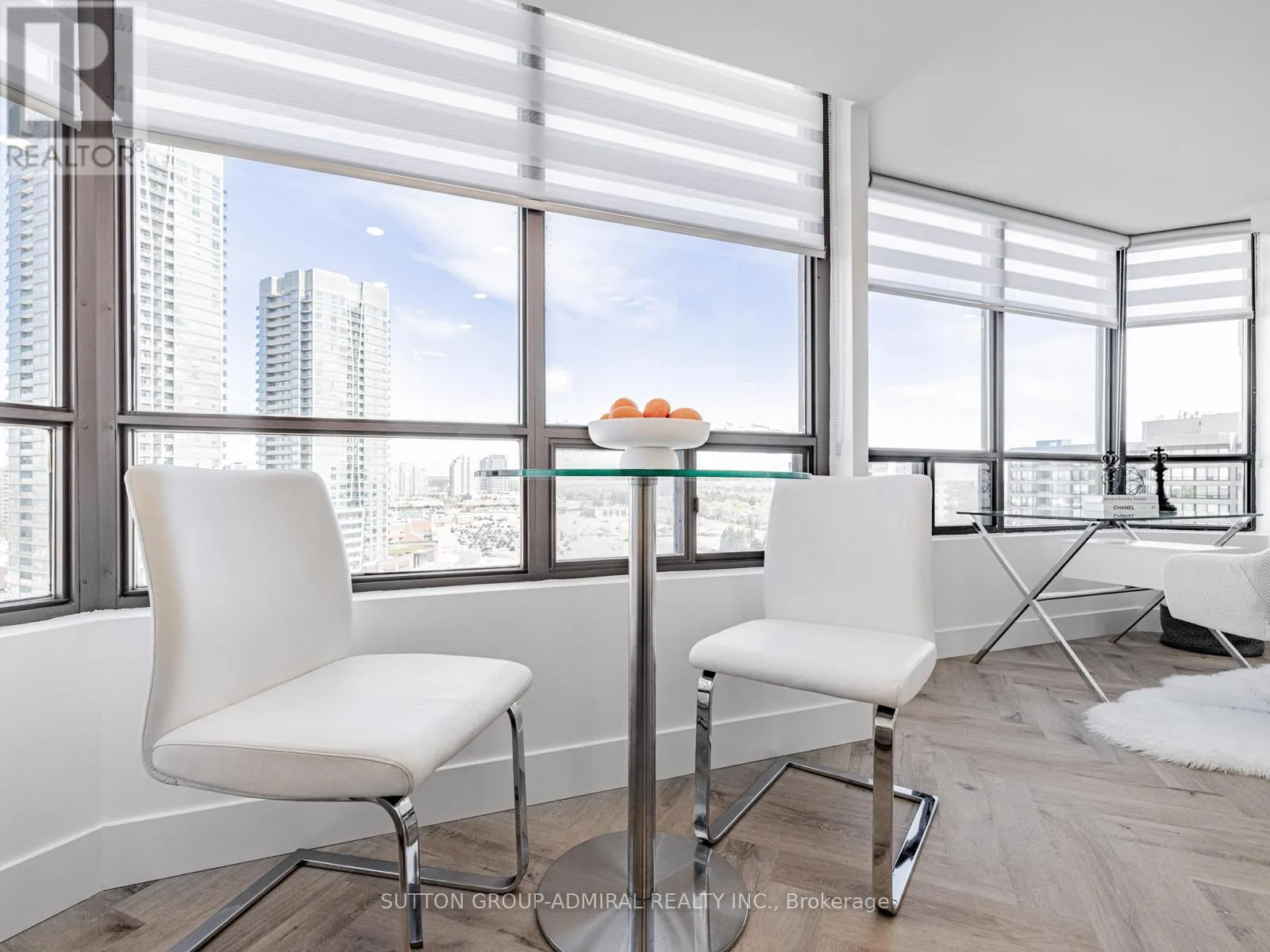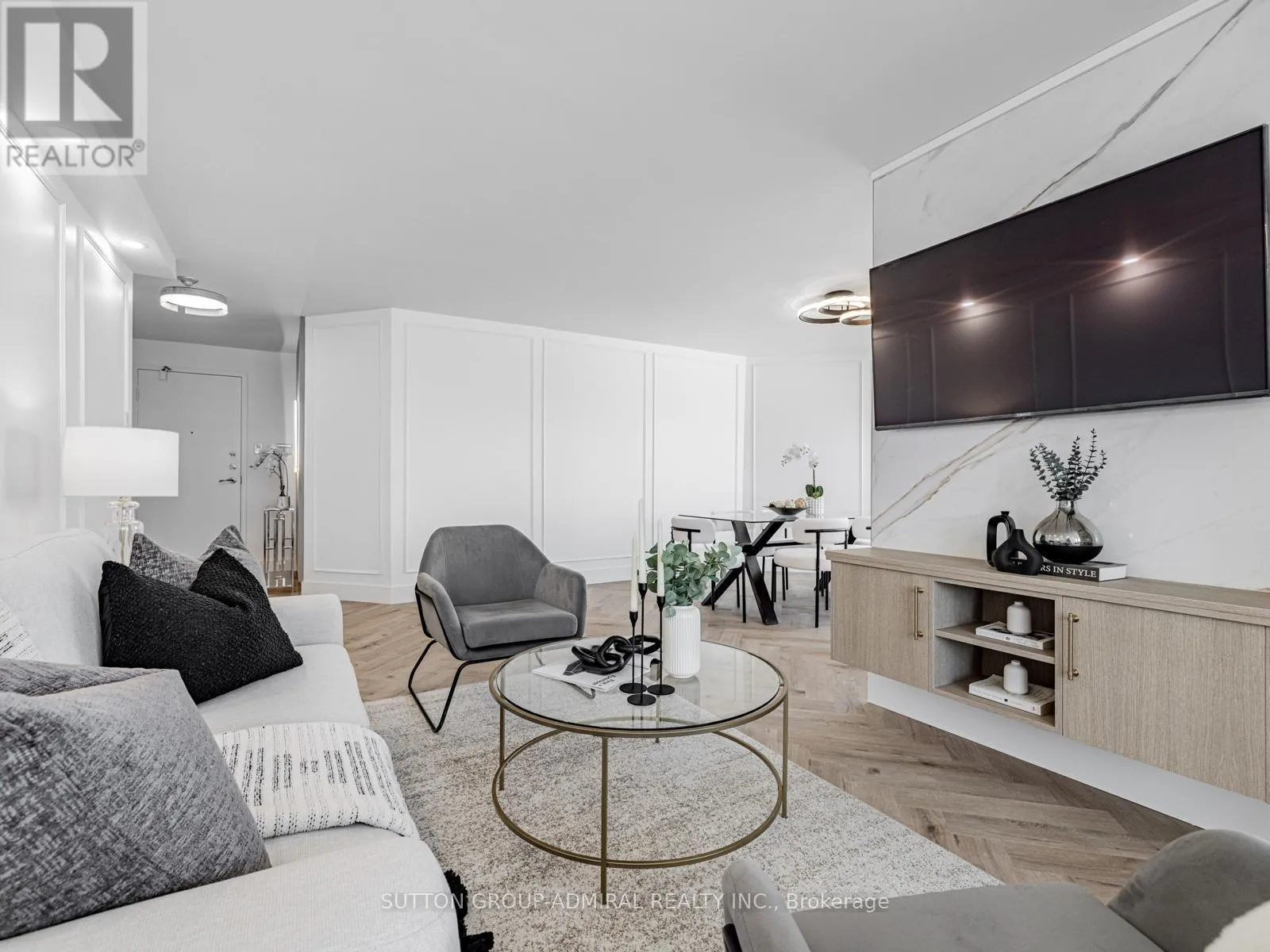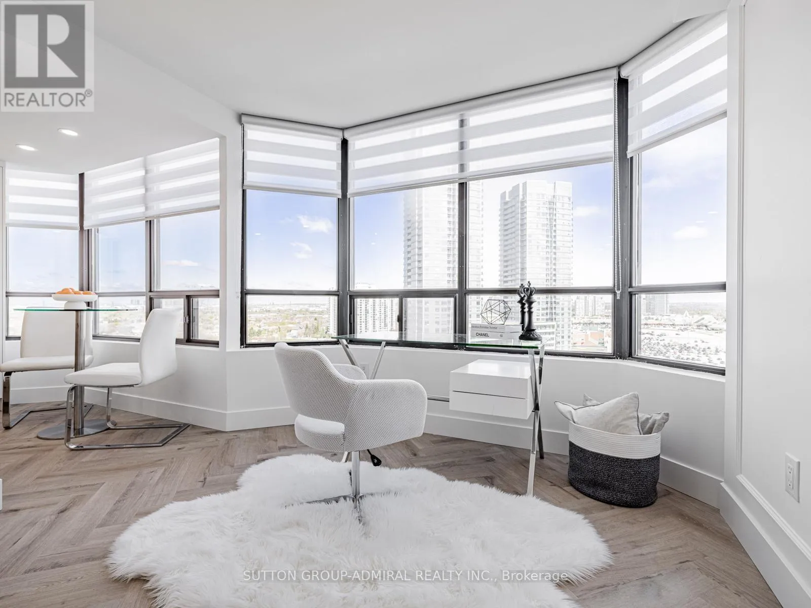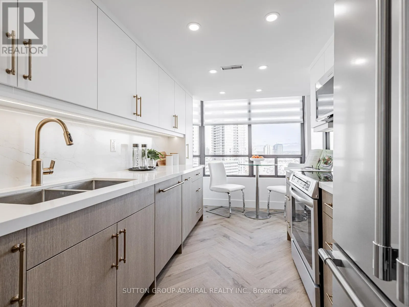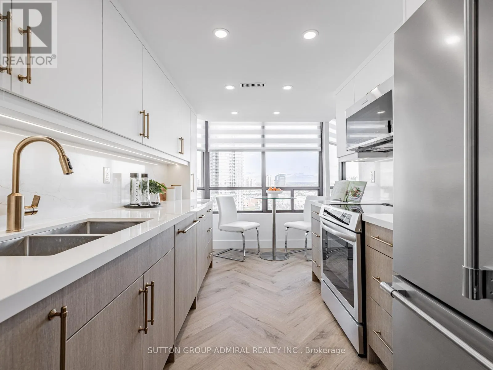 Absolutely stunning and meticulously renovated condo located in the prestigious Promenade Towers, offering approximately 1,250 square feet of luxury living in the heart of Thornhill. This bright and spacious 2-bedroom, 2-bathroom suite showcases top-tier finishes throughout, including elegant herringbone flooring, smooth flat ceilings, pot lighting, and premium window treatments. The designer kitchen is a true showpiece, featuring quartz countertops, modern