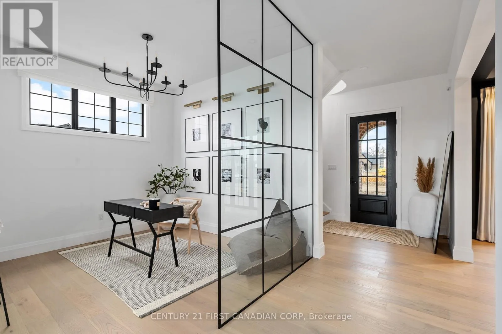 Royal Oak Homes proudly presents The Aspen, a stunning two-storey Nashville inspired home TO BE BUILT in the prestigious Sunningdale Crossings community offers undeniable curb appeal with its classic red brick exterior, black trim accents, and striking architectural details. The elegant arched entryway framed by lantern-style sconces creates a warm welcome, while large, gridded windows flood the interior with natural