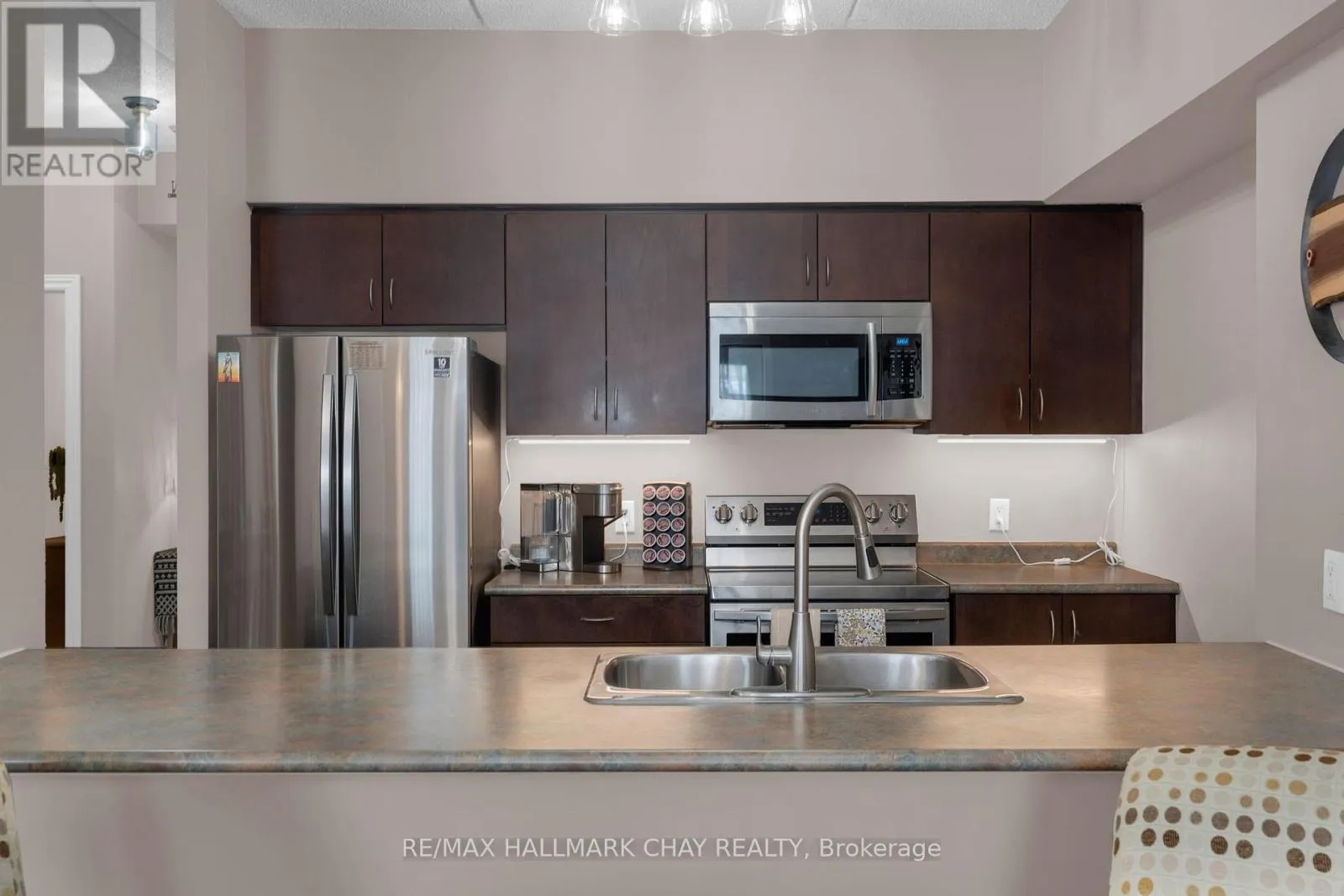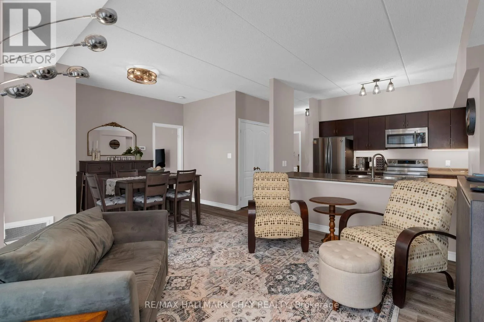 Rarely offered main floor corner condo, an exceptional opportunity at 486 Laclie Street Unit 109 in Orillia’s desirable north end. This spacious two bedroom, two bathroom home offers open concept living with nine foot ceilings and large windows that fill the space with natural light. The primary bedroom features a walk in closet and a five piece ensuite, while the