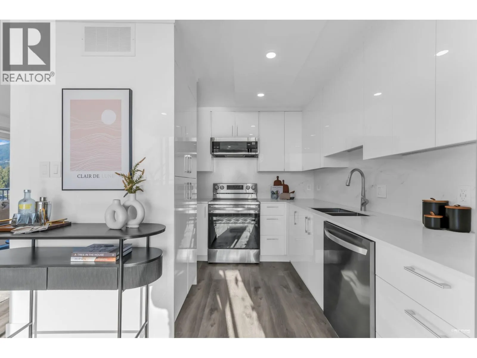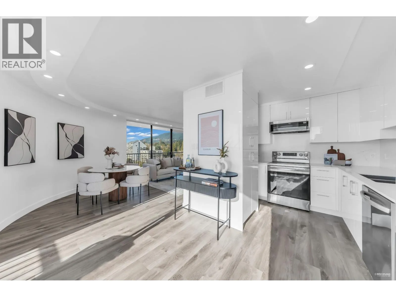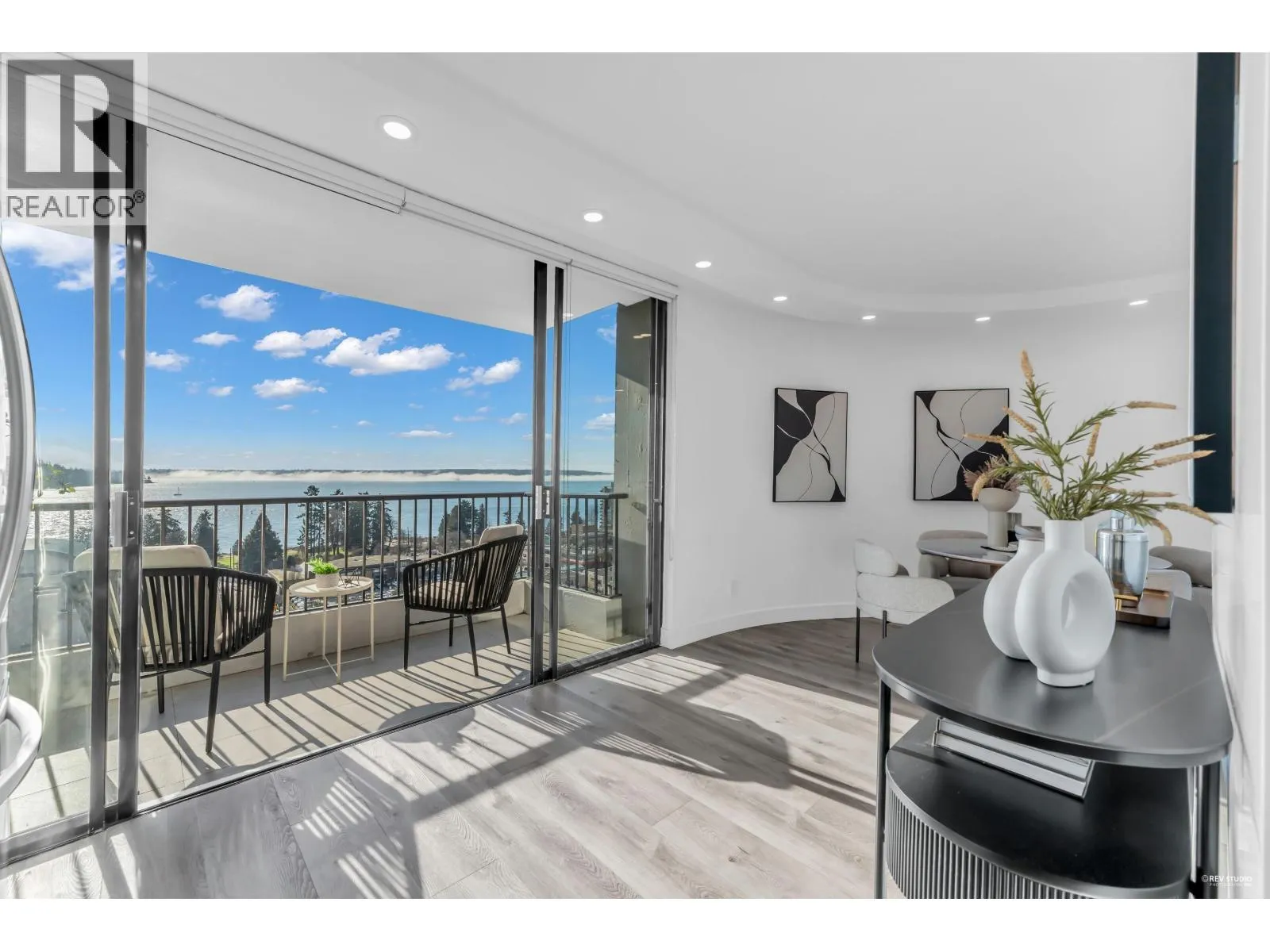 Experience sophisticated urban living at Westshore Place. This elegantly redesigned SW-corner unit offers a breathtaking panoramic view stretching from Mt. Baker to Vancouver Island. Perfectly positioned above neighboring buildings, this residence remains visually connected to the vibrant energy of Ambleside. Inside, floor-to-ceiling windows flood the spacious living areas with natural light, highlighting modern high-end finishes and in-suite laundry. The modern