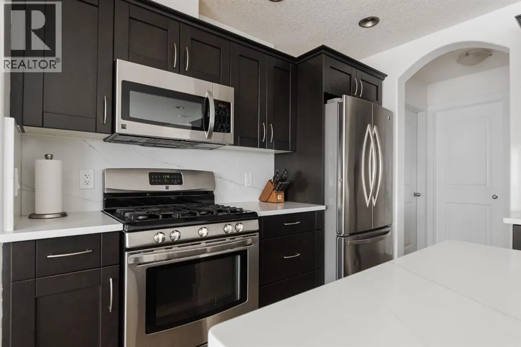 layout includes a main floor office, a spacious yard, a detached double garage, and additional side parking, offering both functionality and flexibility.With its centred front door and inviting front step, the home makes a warm first impression and feels welcoming from the moment you arrive. Inside, a tiled entry with tall ceilings creates a grand entrance that leads past the front den, currently used as a workout room. This versatile space could also serve as an office, sitting room, or playroom.The main living space features hardwood floors, a gas fireplace, and an open concept layout that creates a comfortable and connected atmosphere for everyday living and entertaining. The kitchen was upgraded in 2022 and showcases quartz countertops with a matching slab backsplash, a large island, a built in desk area, and stainless steel appliances including a gas stove. Tucked just behind the kitchen is a convenient laundry area with pantry storage and a nearby updated powder room featuring refreshed hardware, lighting, and shelving. A hidden storage space beneath the staircase adds practical functionality and keeps everyday essentials neatly tucked away.Upstairs, all bedrooms are finished with soft carpet. The primary suite is spacious enough to accommodate a king size bed and offers a large walk in closet and a five piece ensuite complete with dual sinks, new lighting and countertops that match the kitchen, and a tiled jetted tub. A second four piece bathroom on this level has also been updated with a new vanity, countertop, and lighting, providing a cohesive and refreshed look.A separate entrance leads to th e legal basement suite, which offers two bedrooms, a four piece bathroom, hardwood floors, in suite laundry, and a full set of appliances. This spacious suite can be sold furnished, including televisions, making it an excellent mortgage helper or extended family space.The fully fenced backyard is perfect for families and entertaining, featuring hostas, beautiful green grass, a concrete walkway, and a large deck that was stained to match the fence in 2023. A gas line for your barbecue makes outdoor gatherings easy. Parking is plentiful with an additional parking pad beside the garage and a detached double garage that is drywalled, insulated, heated with gas, and equipped with built in storage shelving.Additional highlights include central air conditioning, a high efficiency furnace, central vacuum, and an updated electrical panel completed in 2018.149 Magpie Crescent offers charm, functionality, and income potential in one complete package. Schedule your private showing today. (id:64429)