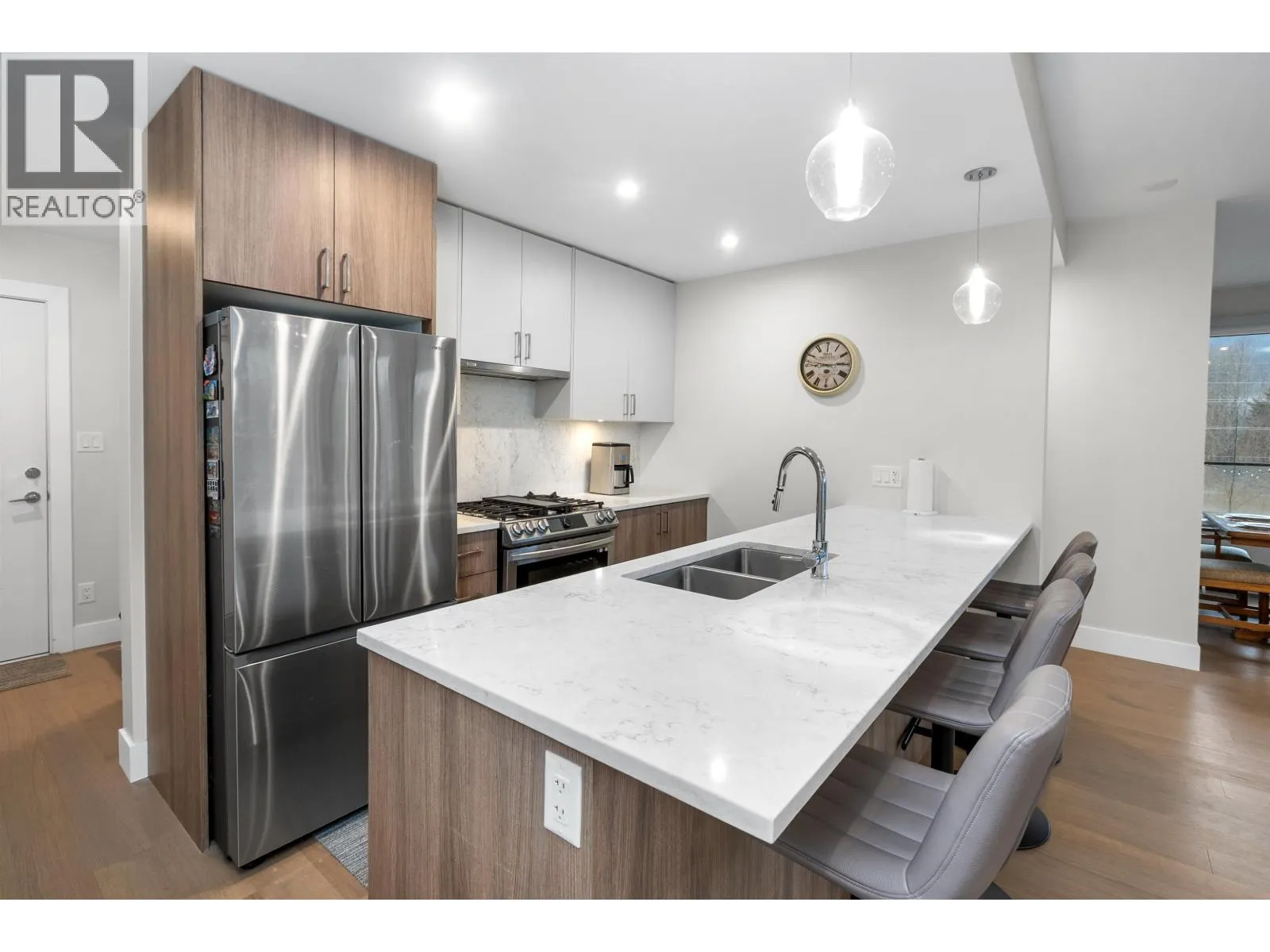THE WILFRED in North Squamish – You will fall in love with the high-end finishes of this two bed and den corner unit – ample natural light from large triple pane windows, and spacious terrace w Tantalus Range views. Gourmet kitchen w quartz counters, stainless appl, gas range, eng. hardwood floors & carpeted bedrooms, pantry/laundry room w storage (plus storage