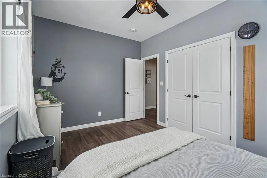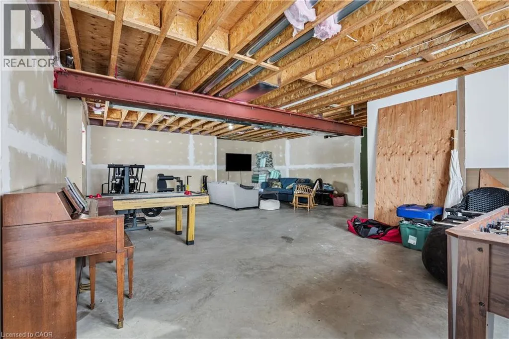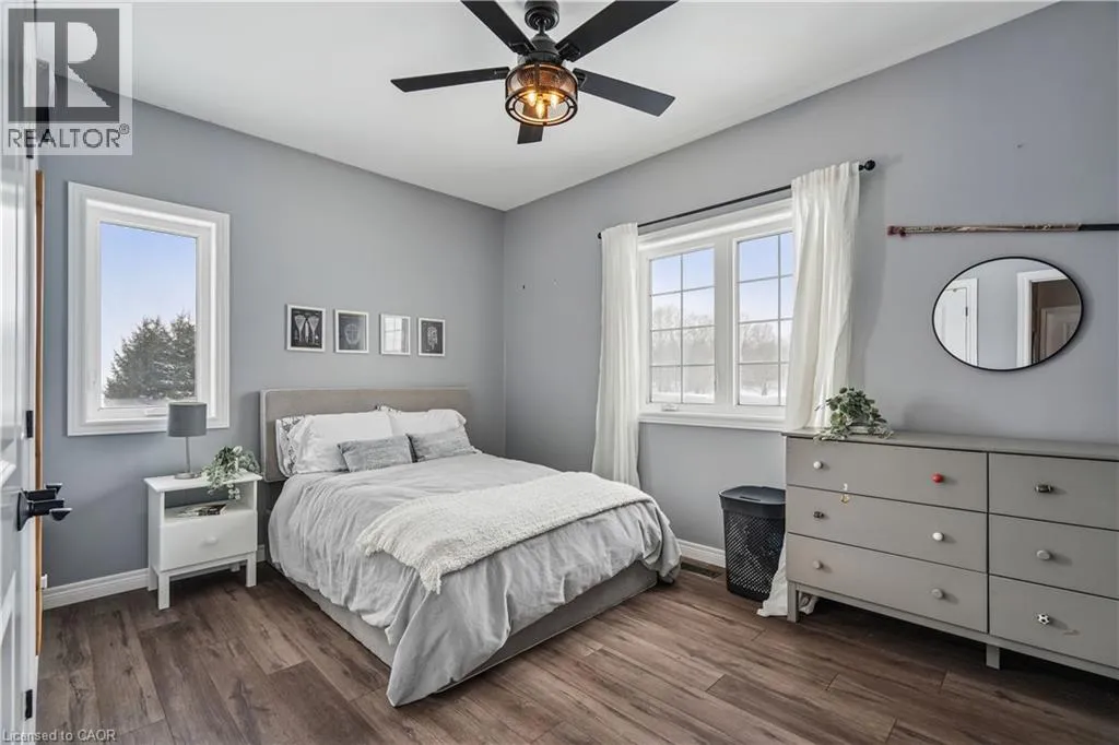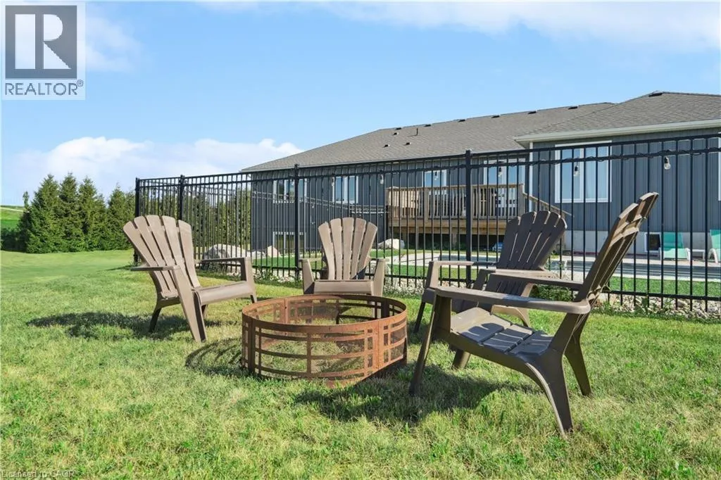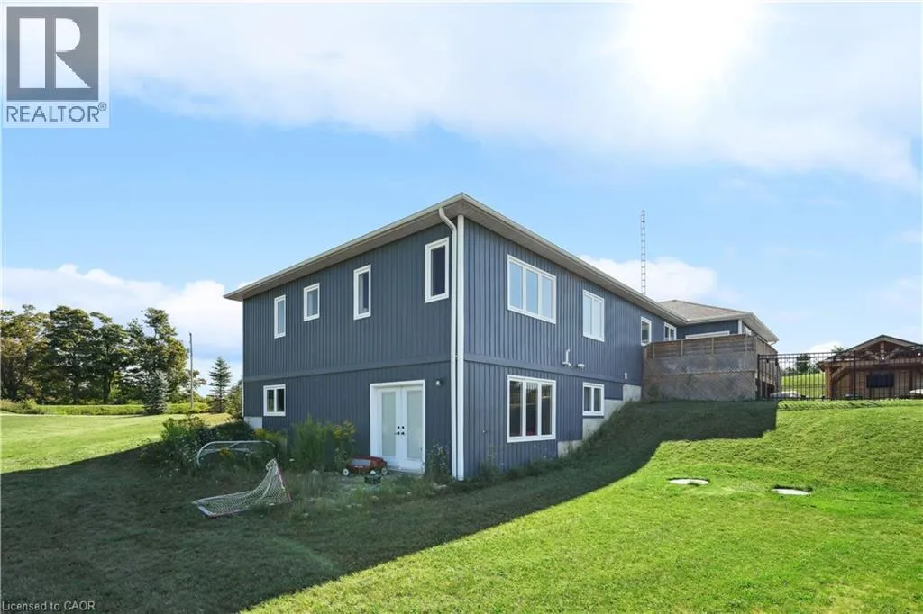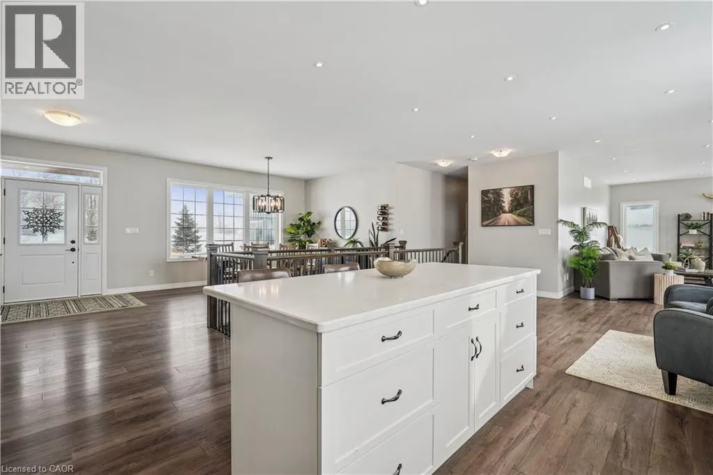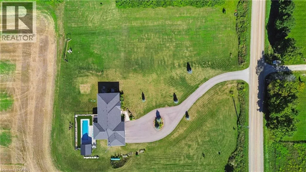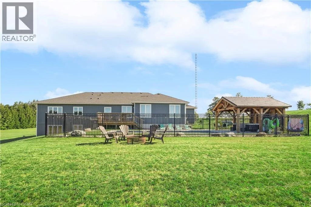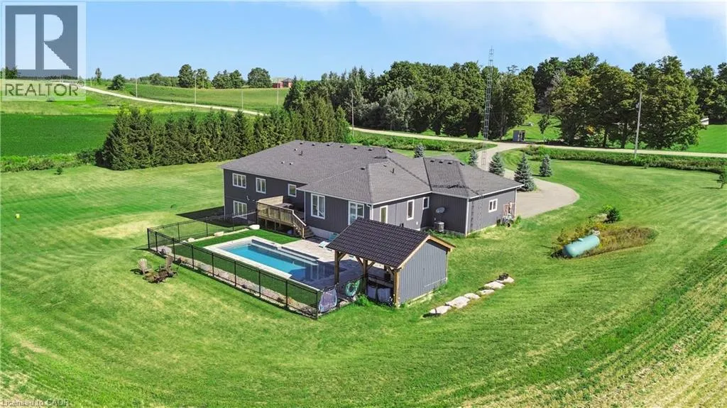 throughout, making it both stylish and family-friendly. The front dining room features large windows, while the chef-inspired kitchen anchors the home with quartz countertops, a centre island, farmhouse sink, stainless steel appliances, extended cabinetry, pantry storage, pot lights, and a window overlooking the backyard. The adjacent living room offers a warm, inviting atmosphere with pot lighting, expansive windows, and French doors leading to the deck, perfect for seamless indoor-outdoor living. The primary bedroom is a private retreat featuring a walk-in closet, and a spa-like five-piece ensuite with heated floors, ideal for unwinding at the end of the day. Two additional main-floor bedrooms include double closets and oversized windows, while a full four-piece bathroom, powder room, and main-floor laundry add everyday convenience. The partially finished walk-out basement extends the home’s versatility with nine-foot ceilings, a fourth bedroom with walk-in closet, and a modern three-piece bathroom. With generous unfinished space, this level offers endless potential for a home office, gym, recreation area, or future in-law suite. Walk-out access leads directly to the backyard. Outside, the property truly shines. The backyard is a private resort, featuring a heated saltwater inground pool installed in 2021. The pool pavilion creates the perfect setting for summer entertaining and late-night gatherings. This home delivers modern comfort without sacrificing rural tranquility. This is more than a house. It is a lifestyle designed for families ready to settle in and stay. (id:62650)