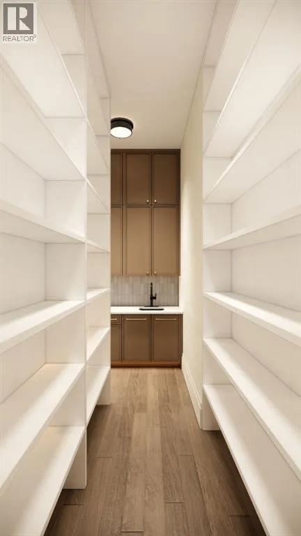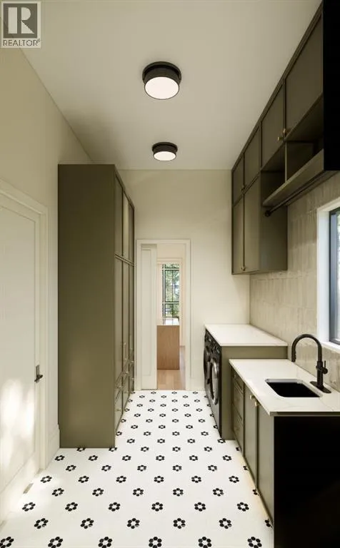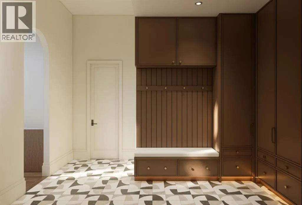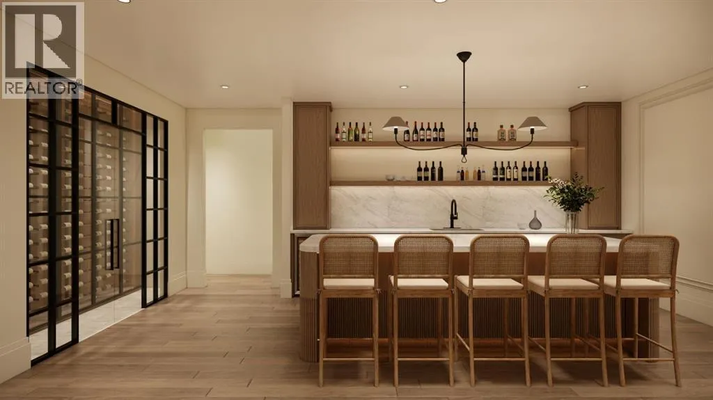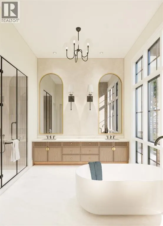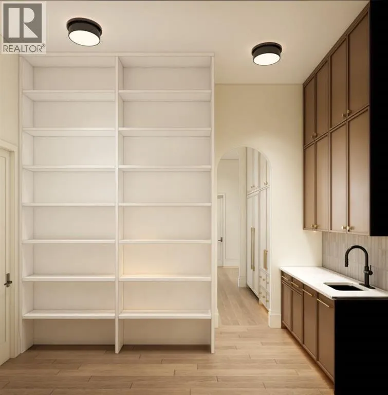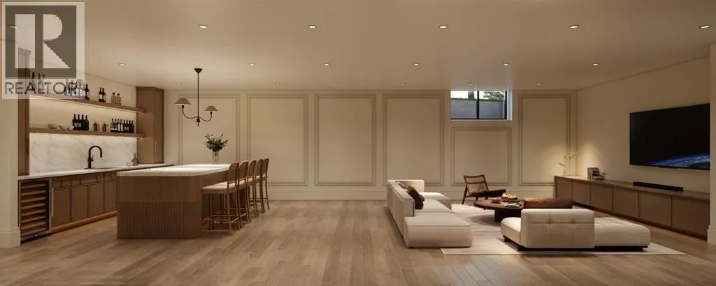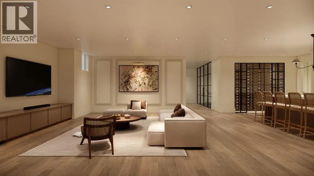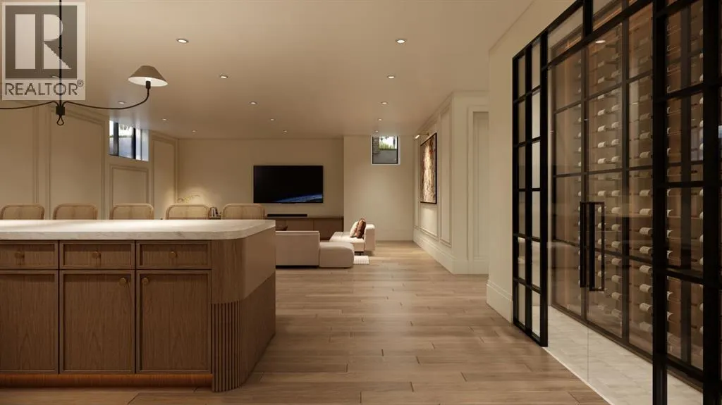 front foyer with designer lighting, wide plank hardwood flooring, and custom millwork detailing that continues throughout the main floor. The front office features elegant wall panelling and built-in cabinetry with glass fronts, while the great room is anchored by a striking fireplace feature wall framed by expansive windows that highlight the 16-foot vaulted ceiling, multiple skylights fill the space with natural light. The chef’s kitchen, equipped with high-end Thermador appliances, is designed as a true centrepiece with custom cabinetry, Taj Mahal quartzite countertops, a large oak island, designer hardware, and elevated plumbing fixtures. The adjacent dining area is positioned beside large windows overlooking the backyard, and heading out to the large deck with a gas fireplace. The main level primary retreat is designed as a luxurious private space with its own dramatic 16-foot vaulted ceiling, oversized windows, and generous proportions. The spa inspired ensuite features a freestanding tub, large walk-in shower with full height tile, dual vanities with custom cabinetry, quartz countertops, in-floor heating, and a spacious walk-in closet with extensive built-ins and a center island. The main floor is further completed by a second primary bedroom and an ensuite, a designer powder room with a fluted vanity and porcelain countertop, a mudroom with custom cabinetry and built-in bench seating, and a fully finished laundry room with cabinetry and quartz counters leading to the attached triple tandem garage. The fully developed lower level continues the home’s refined design with 10-f oot ceilings, a gym, a large recreation and entertainment area, a custom wet bar, extensive cabinetry, and a glass enclosed wine display. Two additional bedrooms are generously sized and paired with beautifully finished bathrooms featuring custom vanities, quartz counters, and full tile showers, creating a home that blends thoughtful layout with elevated finishes throughout. Located near the Glenmore Reservoir, North Glenmore Park, and Weaselhead Flats with endless walking and cycling pathways. Enjoy quick access to downtown, top rated schools, nearby golf courses, and a vibrant community atmosphere with parks, recreation, and local amenities just minutes away. Buyers will have the opportunity to work with the builder and customize select finishes. Call today to book your private tour. (id:64429)