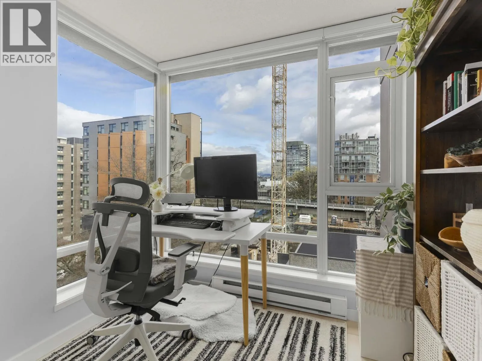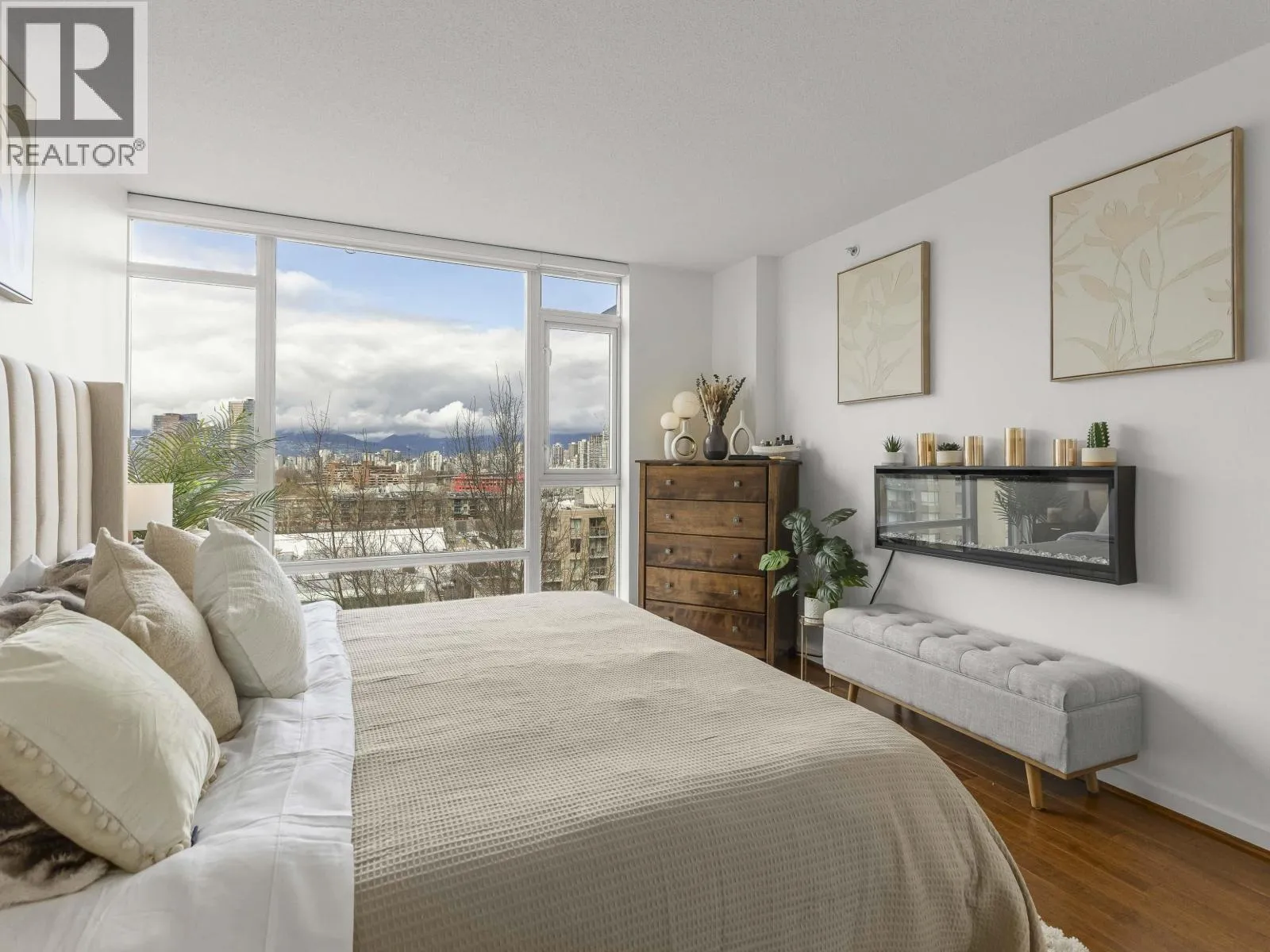 Rare offering at Virtu. Corner 2 bed, 2 bath + den and flex home with southeast exposure and sweeping city, water, and North Shore mountain views through floor-to-ceiling windows. Bright, well-designed layout with excellent bedroom separation. Open-concept living/dining flows to a generous view balcony, ideal for everyday living and entertaining. Kitchen features full-size SS appliances, gas cooktop, stone counters, and
