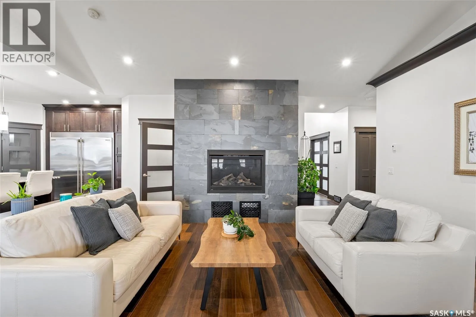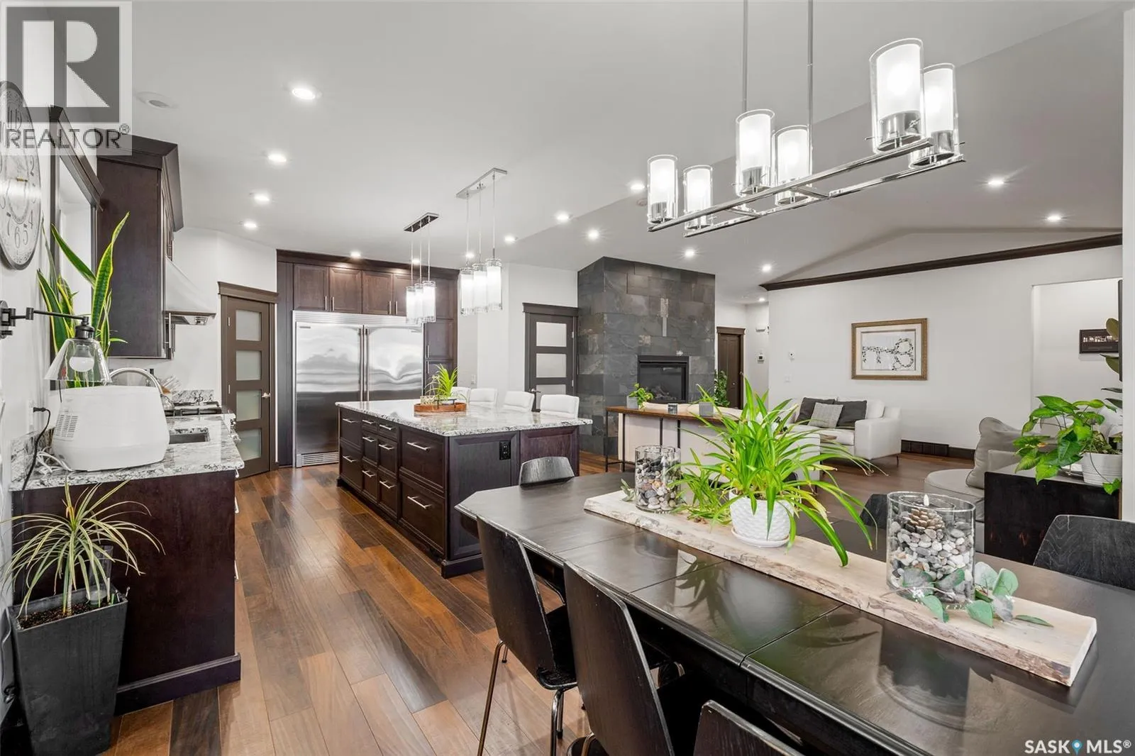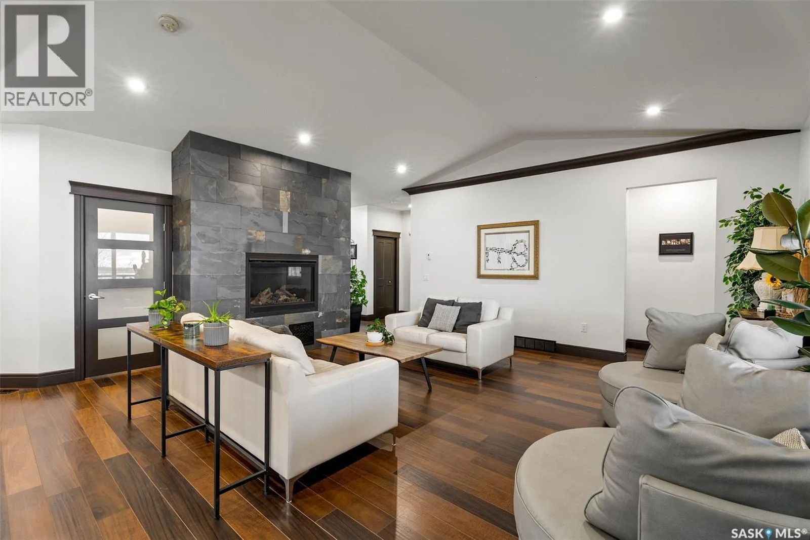 Lakefront Executive Style home at Humboldt Lake! Welcome to this stunning lakefront executive bungalow offering 1,733 sq. ft. of refined living space in a serene and private setting. Elegant Interiors & Gourmet Kitchen: The open-concept main living area features soaring vaulted ceilings and a striking natural gas slate fireplace, creating both warmth and elegance. A chef’s dream kitchen awaits with