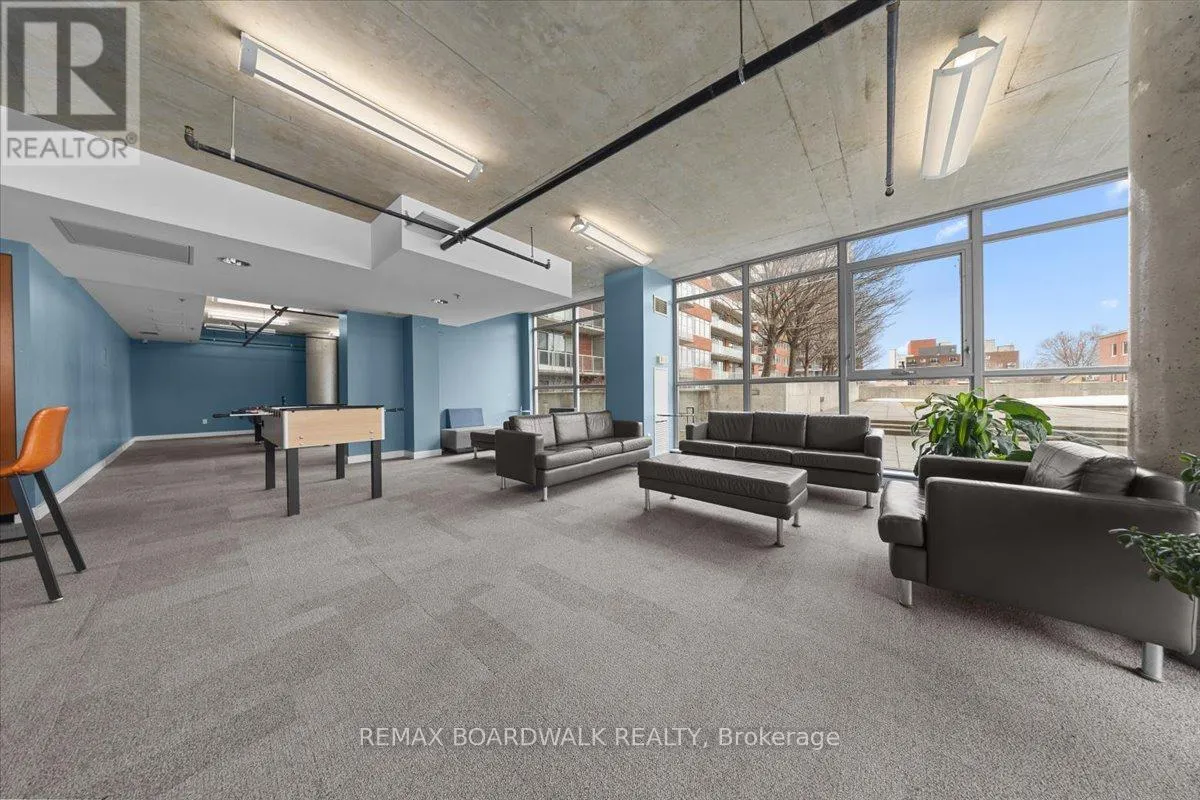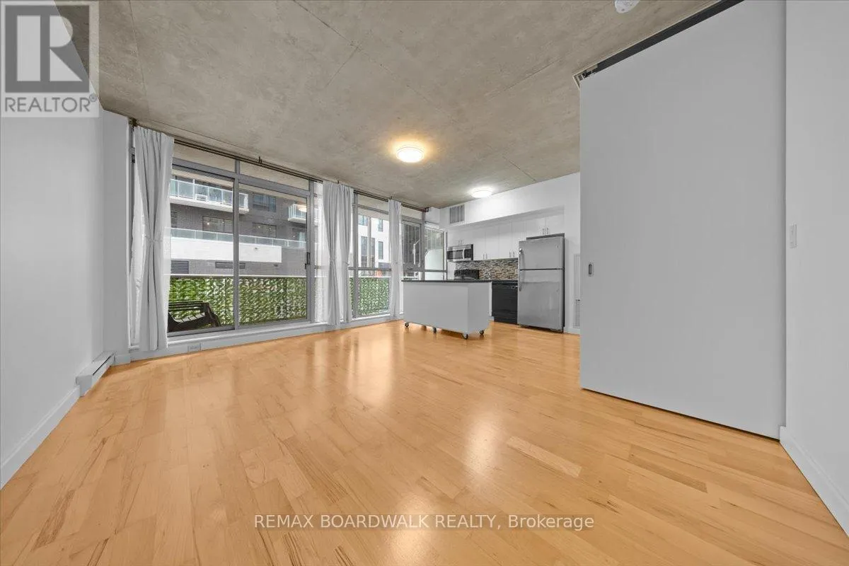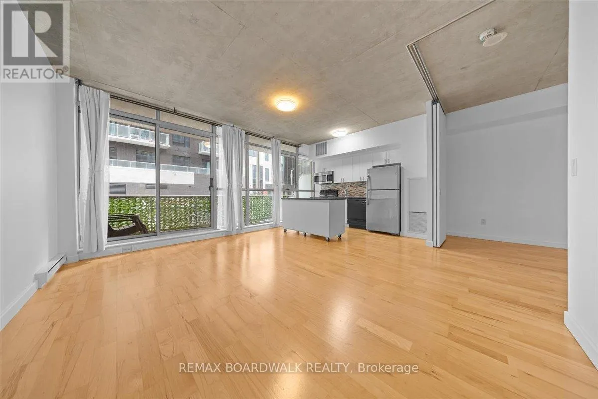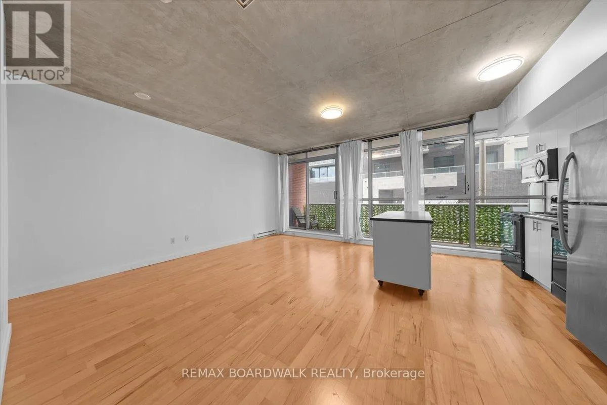 Turn-Key living opportunity w/ concierge building service. Loft-style 1bdrm unit with high ceilings and exposed concrete, showcasing a modern-industrial feel. (4-piece) bathroom nearing the entry of the unit. Floor to ceiling windows, inviting light into the open concept kitchen and dining, maximizing usable space. Hardwood throughout. South-facing balcony. Modern living with low maintenance. Amenities: Equipped Gym, Party Room, Outdoor Terrace