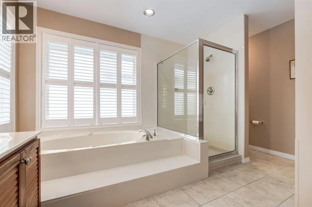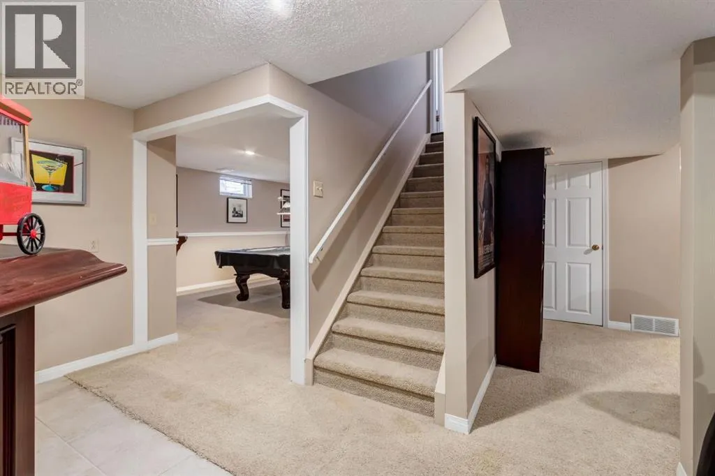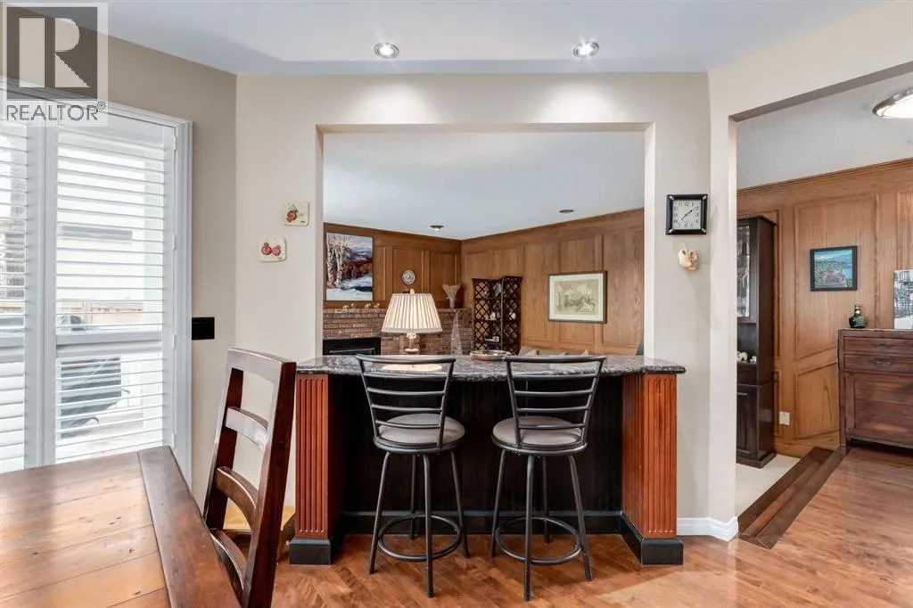 spectacular! They have all been upgraded to triple pane (2023), with the exception of the decorative windows. The front foyer is stunning with its open staircase, hardwood floors, and stylish double front doors. The elegant living and dining rooms are bright and welcoming with their large windows and 20′ vaulted ceilings. The updated kitchen is warm & inviting with a charming bay window above the sink, ceiling height wood cabinets, custom hood fan, granite countertops, large island with a prep sink, glass enclosed bar cabinet, a handy computer desk, great lighting and a flat painted ceiling. The impressive Kitchenaide appliance package includes both a gas stove & a built-in gas oven. The roomy breakfast nook has new sliding doors(2023) that open to the deck and a cool breakfast bar that overlooks the family room. The Chicago Brick fireplace is a highlight in the comfortable family room. A bedroom/den, half bath and a laundry room with cabinets and a sink complete the main floor. The landing on the upper level is bright and open with a built-in hutch with display shelving and cabinets for storage. The luxurious primary bedroom is a peaceful retreat with a lovely gas fireplace and a large walk-in closet with built-in shelving and drawers. A light-filled ensuite has a double vanity, large soaker bathtub and a separate shower. Two more spacious bedrooms and a 4-pc bathroom complete the upper level. The finished basement is carpeted and is a wonderful place to relax or entertain family and friends. Watch movies in the 4-seat theatre chairs, play pool, or sit at the custom bar watching your favourite sports programs. A 5th bedroom/den and anot her 4 pc bathroom are also located on the lower level. An attached oversized double garage, a professionally landscaped large pie lot with mature trees and shrubs, a stone patio, and a deck with a gas hookup for your BBQ, sprinkler system and a water softener add to the enjoyment of this wonderful home. Three minutes to Bebo Grove (Parking lot, picnic area & hiking trails in Fish Creek Provincial Park). Close to shopping & schools. Excellent transit & easy access to all 4 quadrants of the city. Come for a visit and you’ll instantly feel at home! (id:62650)