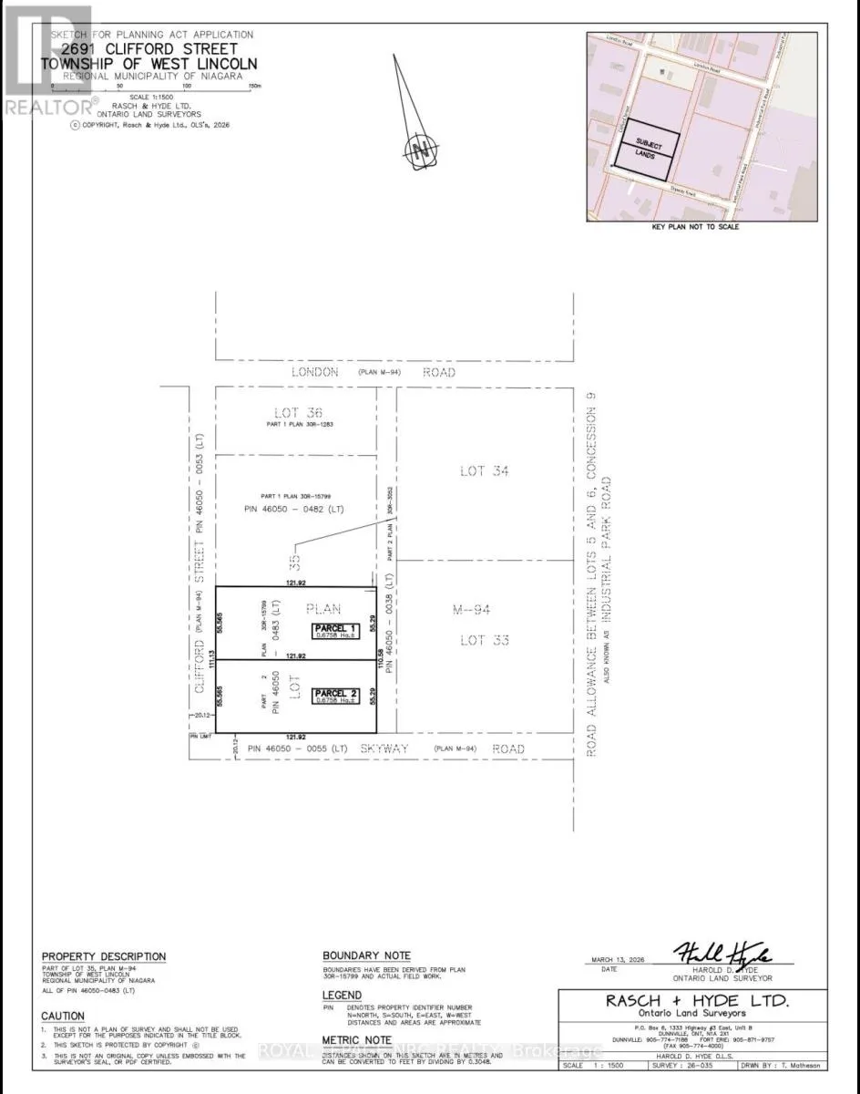 Prime commercial land opportunity in the growing Township of West Lincoln. This offering consists of one of two proposed severed parcels, each approximately 1.67 acres, with the buyer having the flexibility to choose between Parcel 1 or Parcel 2. Ideally situated at the corner of Clifford Street and Skyway Road, this property offers excellent exposure, strong accessibility, and a strategic