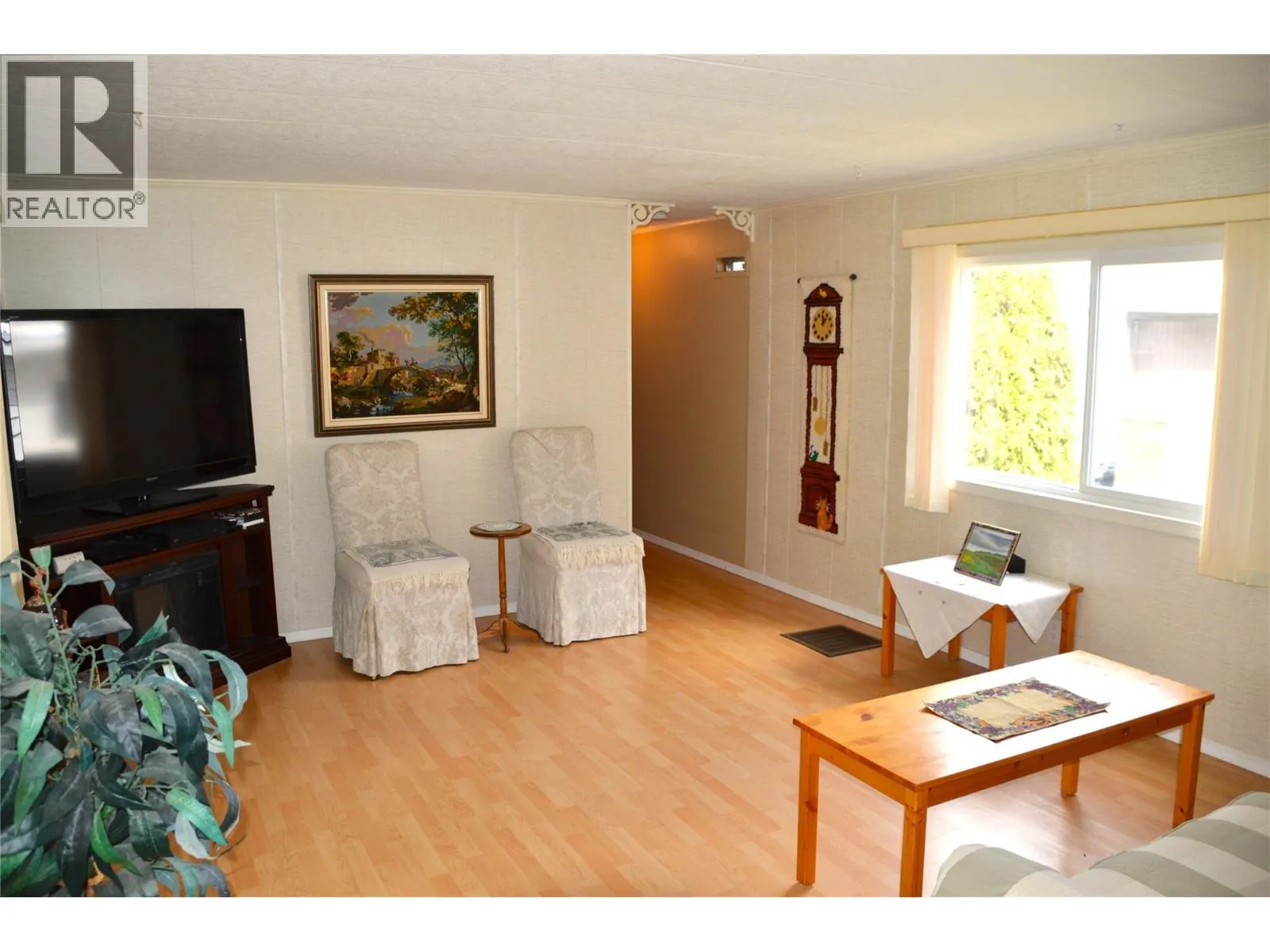 Easy living with no pad rent, 2 bedroom 1 bath manufactured home on it’s own land in a tidy 55 plus bare land strata. Low $80. per month strata fee. This home boasts newer H/E furnace, central air, vinyl windows and durable metal roof. Oversize dining and living rooms with large windows provide great natural light. Bonus 13×15 workshop plus