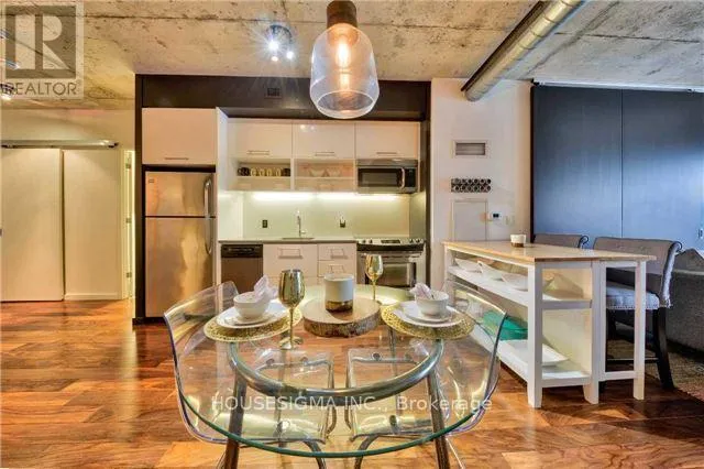Rarely offered, spacious 1+den condo with one underground parking spot ideal for couples or individuals that work from home! This beautifully designed suite offers 784 sq ft of functional interior space plus a 54 sq ft private balcony. The open-concept layout is anchored by 9′ exposed concrete ceilings, creating a modern, industrial-chic feel with an abundance of natural light. The